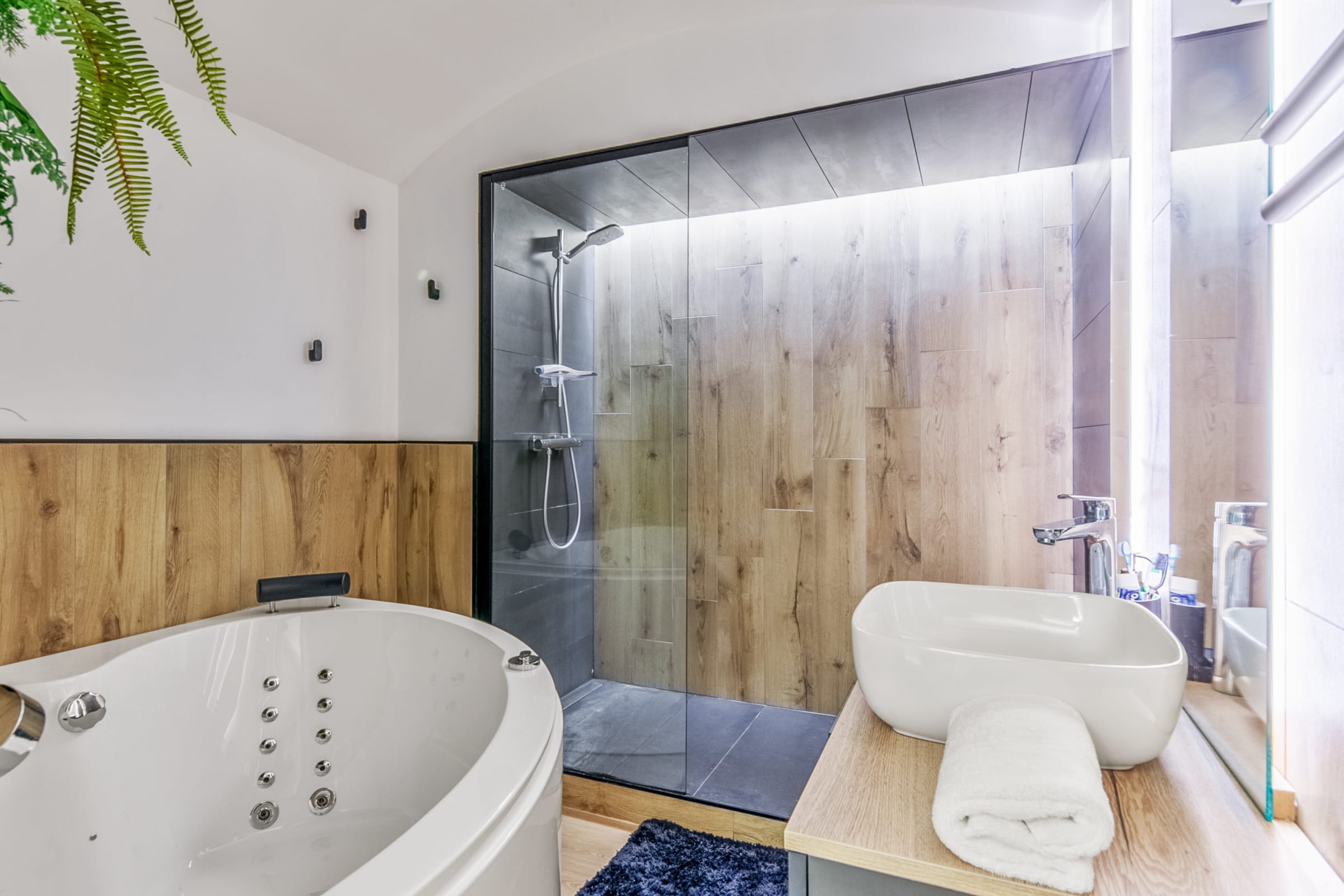 - a bathroom with a shower and a Jacuzzi-bathtub,