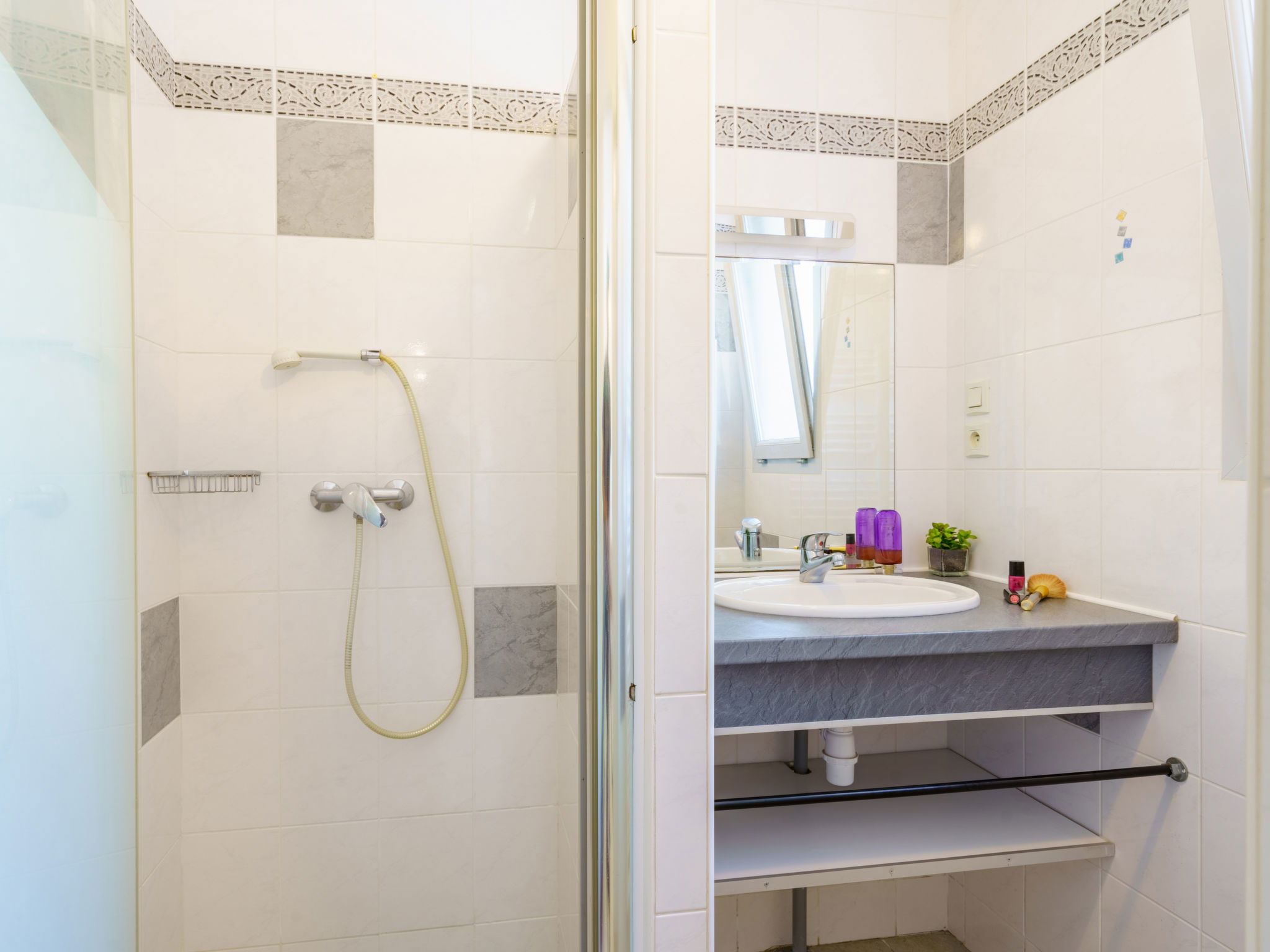 "Maison Atchoum", 3-room house 55 m2. Simple furnishings: living/dining room with 1 sofabed (140 cm, length 190 cm), TV (flat screen). Exit to the terrace. 1 room with 1 french bed (140 cm, length 190 cm). 1 room with 2 beds (80 cm, length 190 cm). Kitchenette (4 ceramic glass hob hotplates, toaster, kettle, freezer, electric coffee machine, combination microwave). Shower, sep. WC. Electric heating. Terrace 9 m2. Terrace furniture. Facilities: hair dryer. Internet (WiFi, free). Parking (fenced 1 car). Please note: smoke alarm. Offer by a private individual according to Art. 155, IV of CGI. 6412500033791