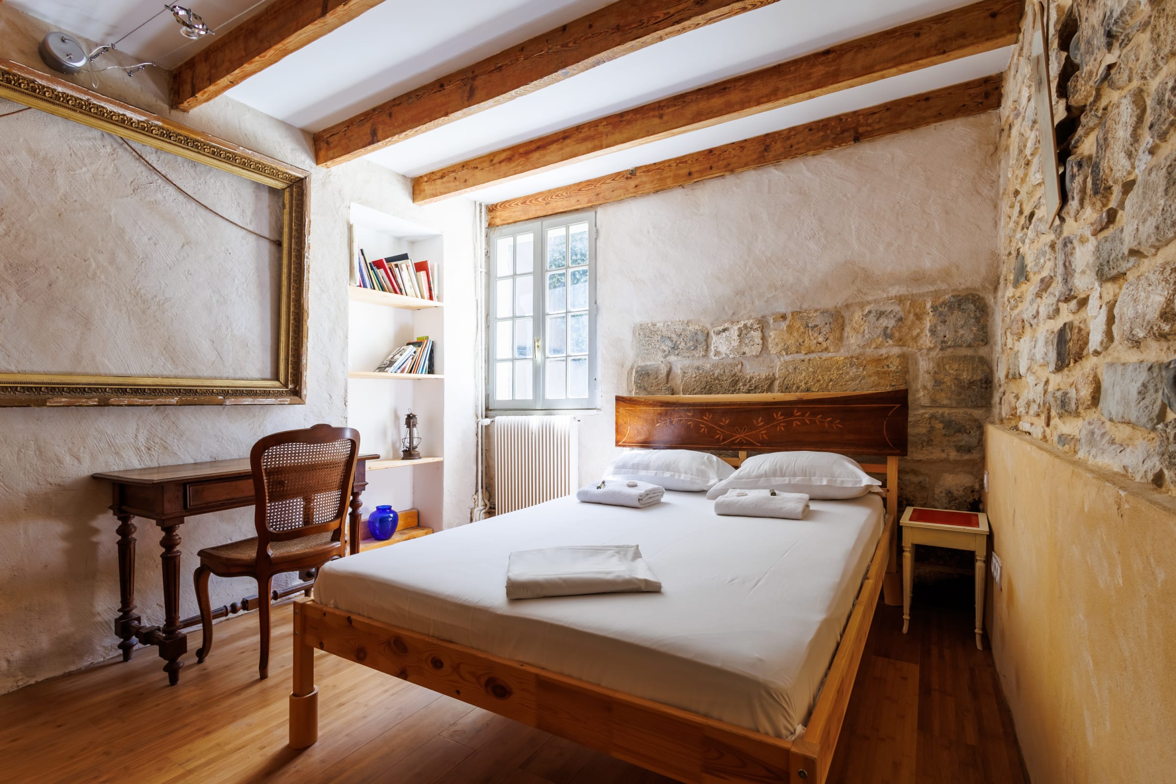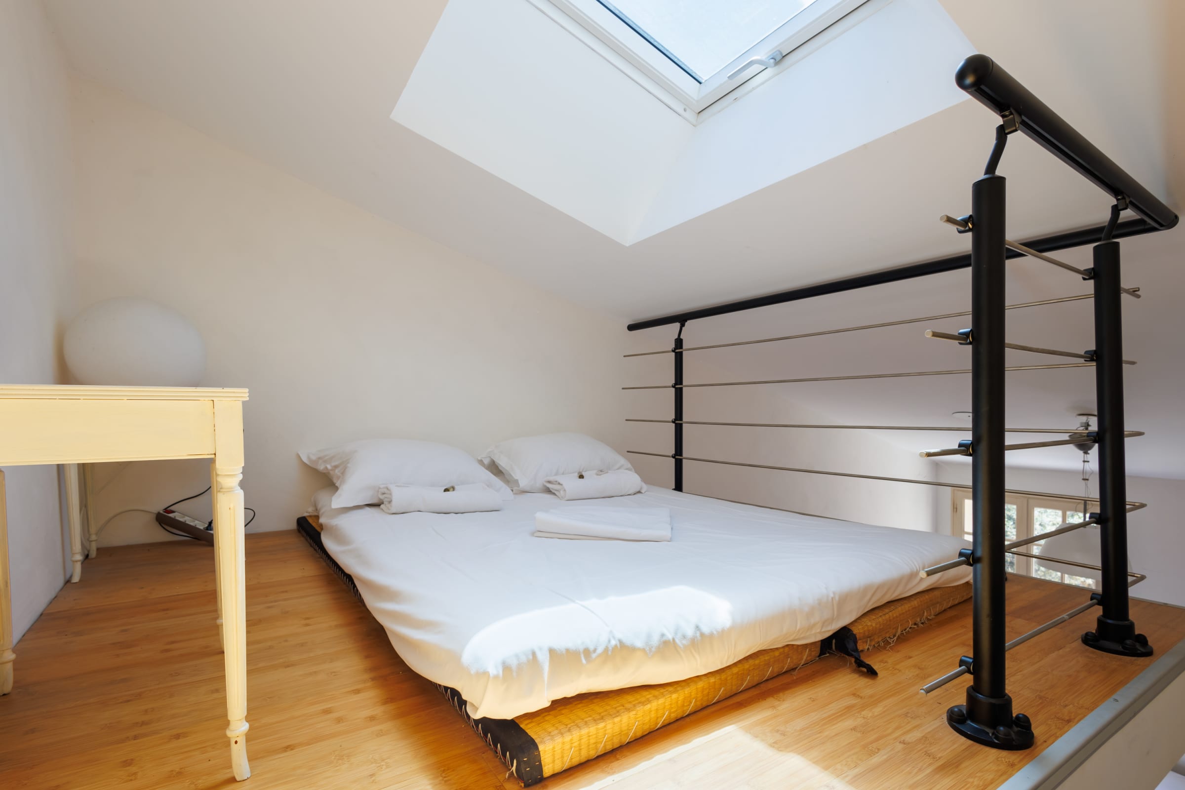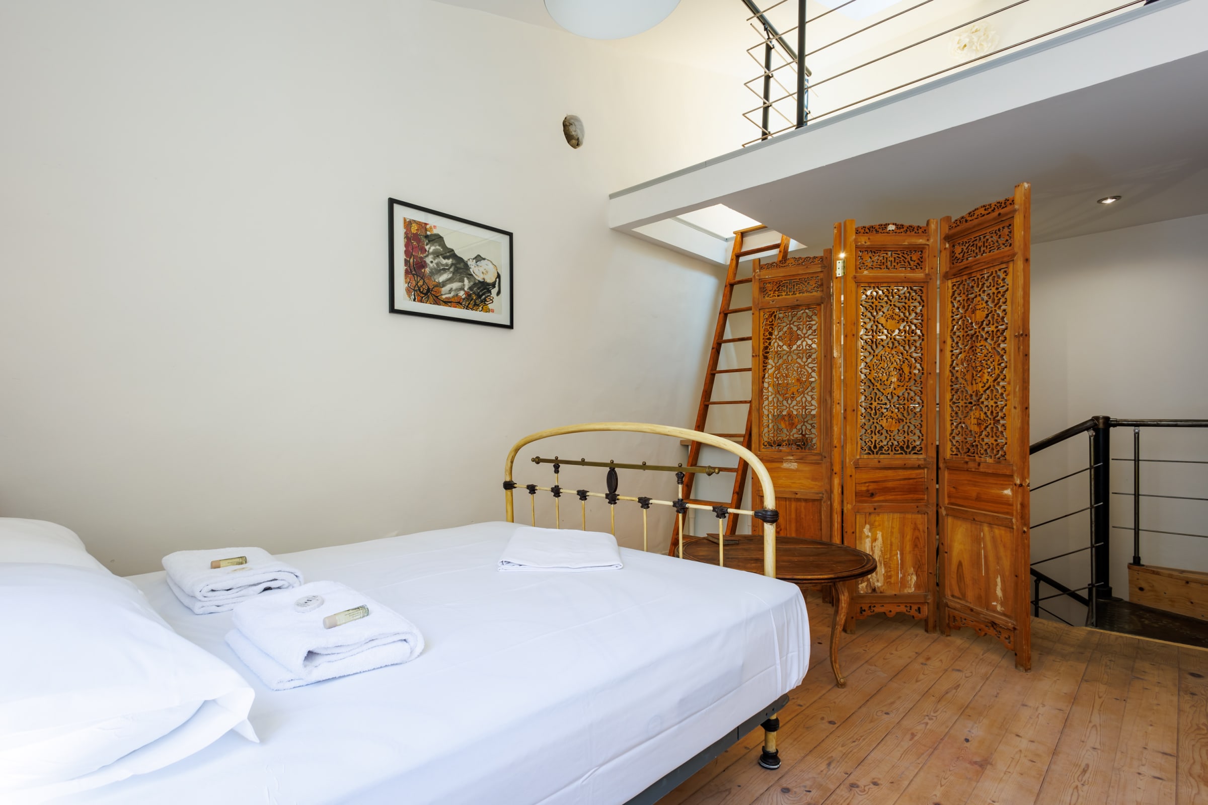 - one bedroom with a double bed (140 cm) and a mezzanine with another double bed (140 cm),