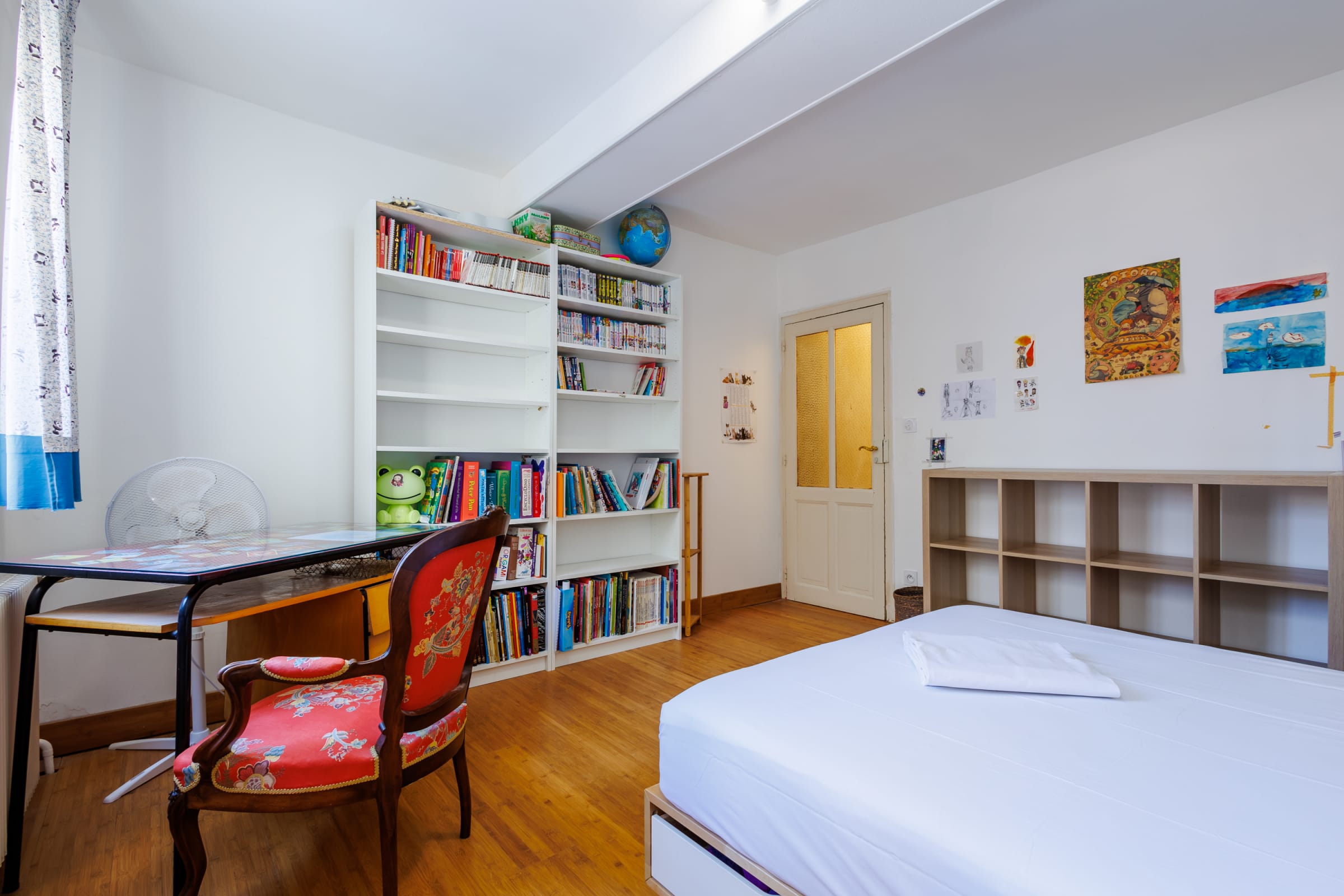 - three bedrooms, each with a double bed (140 cm) and a desk area,