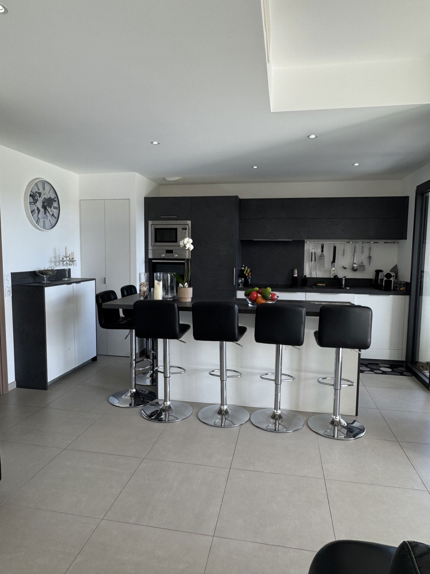 The kitchen completely open to the living room includes a central island for your meals inside. It is equipped with a fridge, freezer, ceramic hob, dishwasher, washing machine, oven, microwave, toaster, coffee machine.....