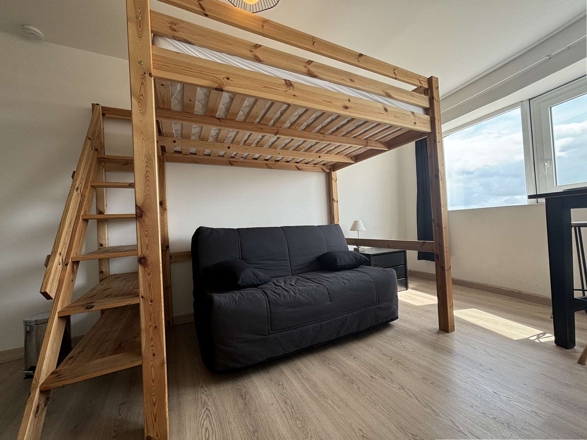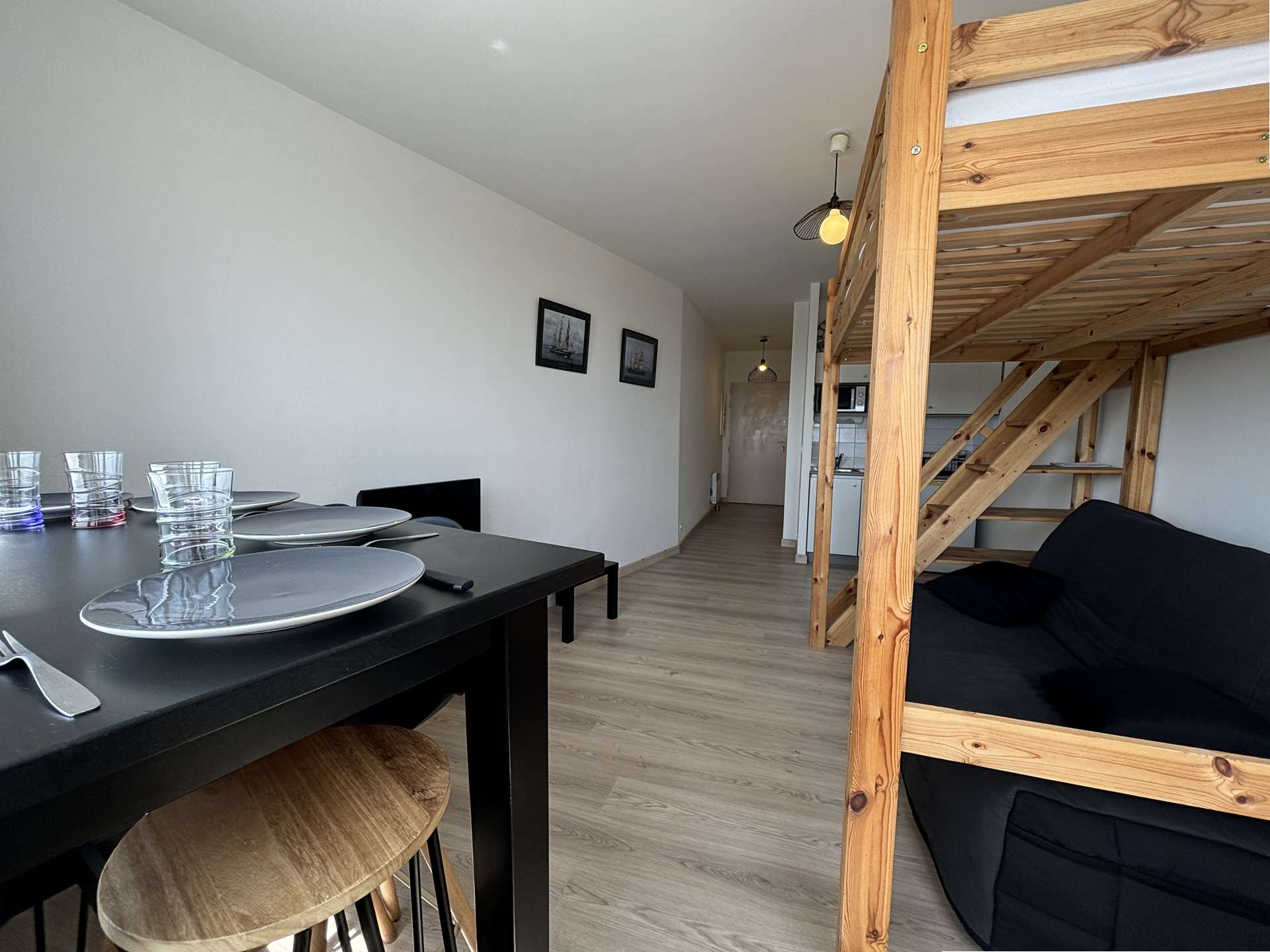 Il est au 3ème étage et se compose d'un séjour vue mer, avec un lit mezzanine en 140cm pour 2 personnes, ainsi qu'un canapé convertible pour 2 personnes également, un coin cuisine équipée, une salle d'eau et un WC.