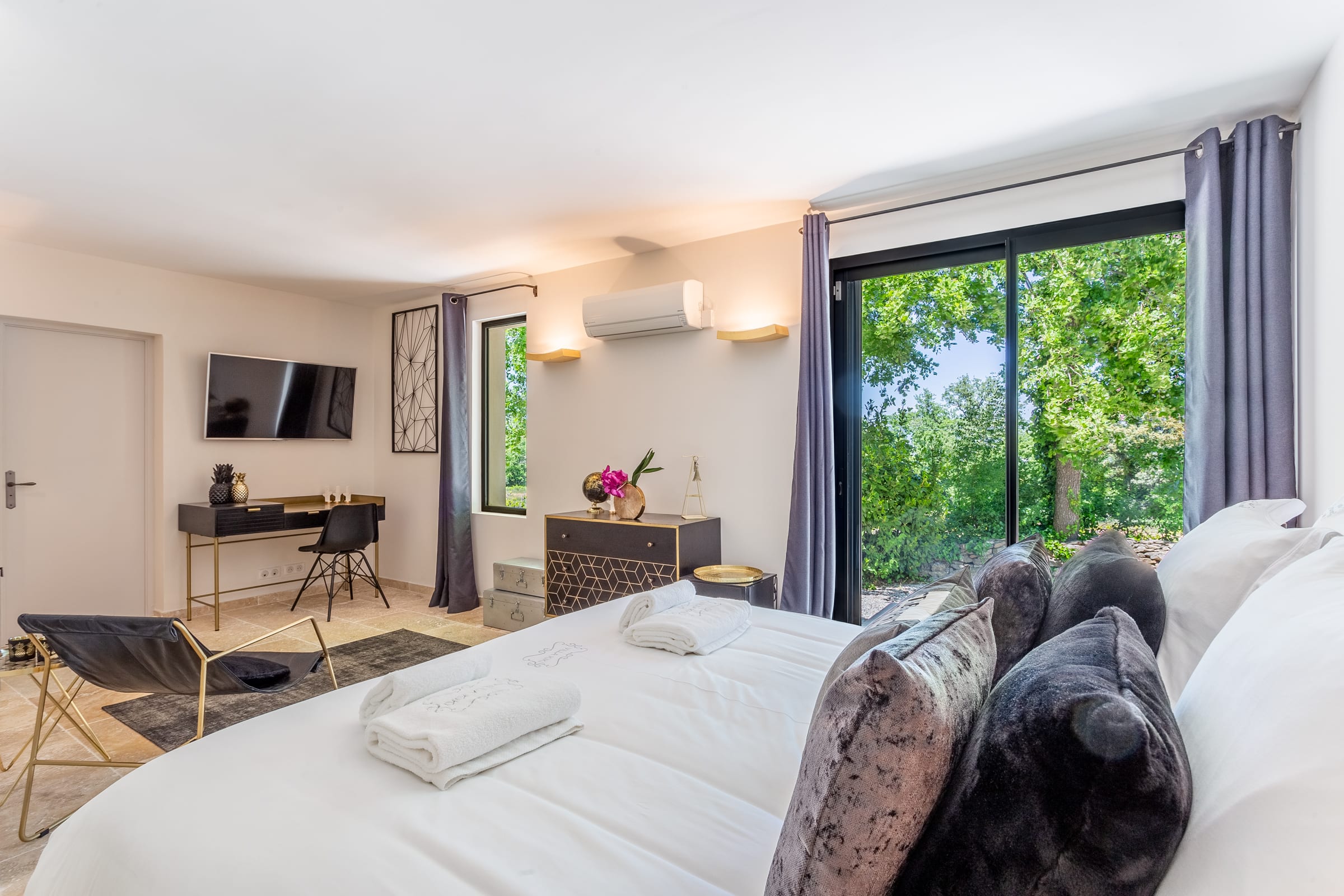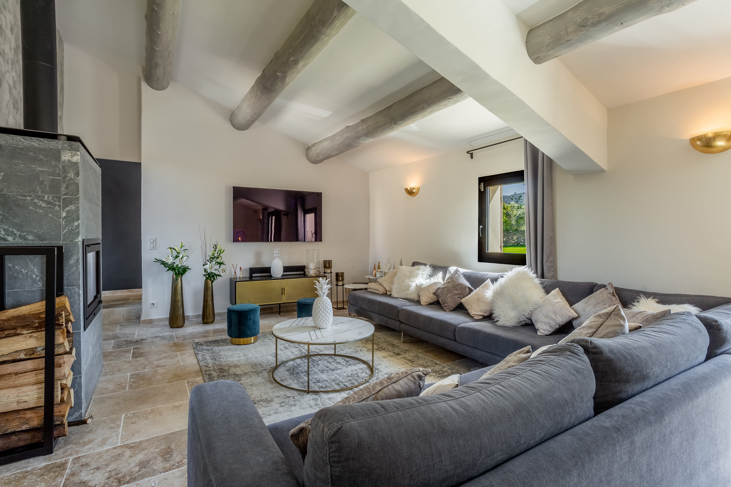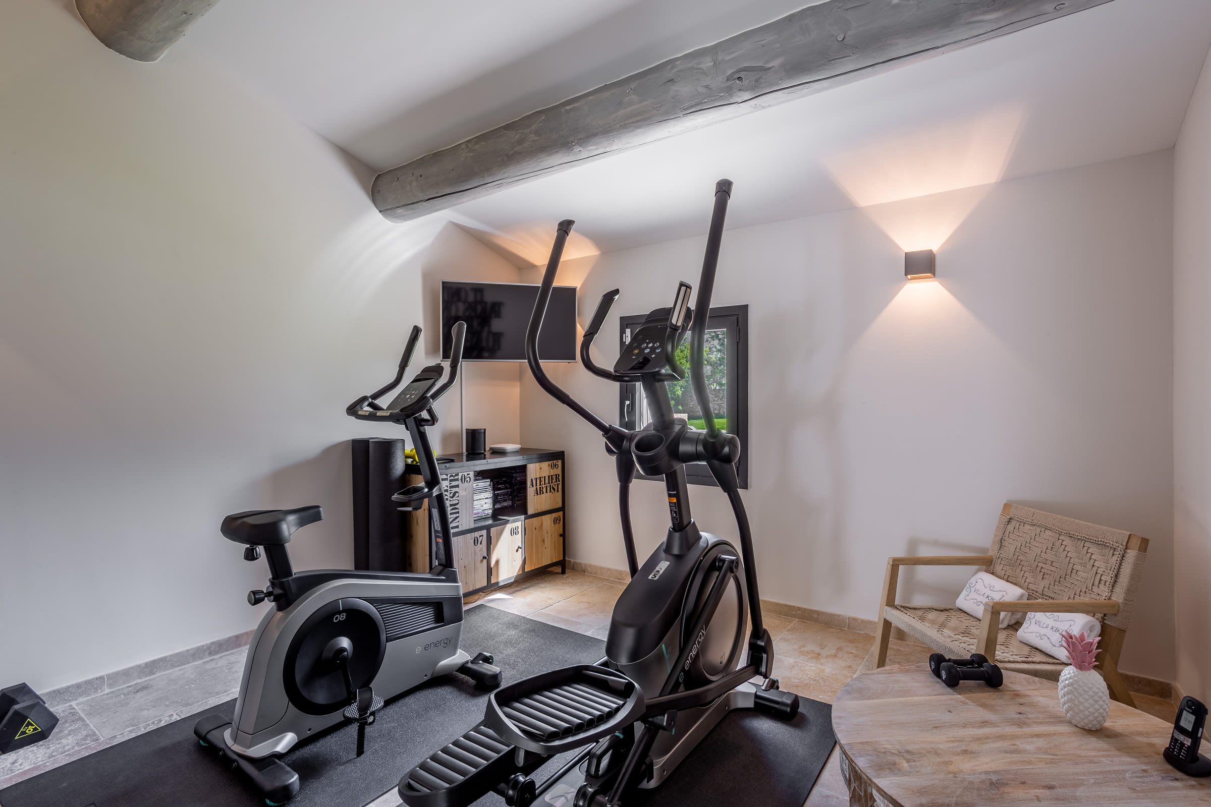 The fully air-conditioned villa comprised of a living room with wood stove, a fitness room with a desk, a dining room, a fully fitted kitchen opening onto a terrace, 4 bedrooms, each uniquely decorated, 1 bathroom, 3 shower rooms and guest toilet, assuring you the greatest possible comfort.