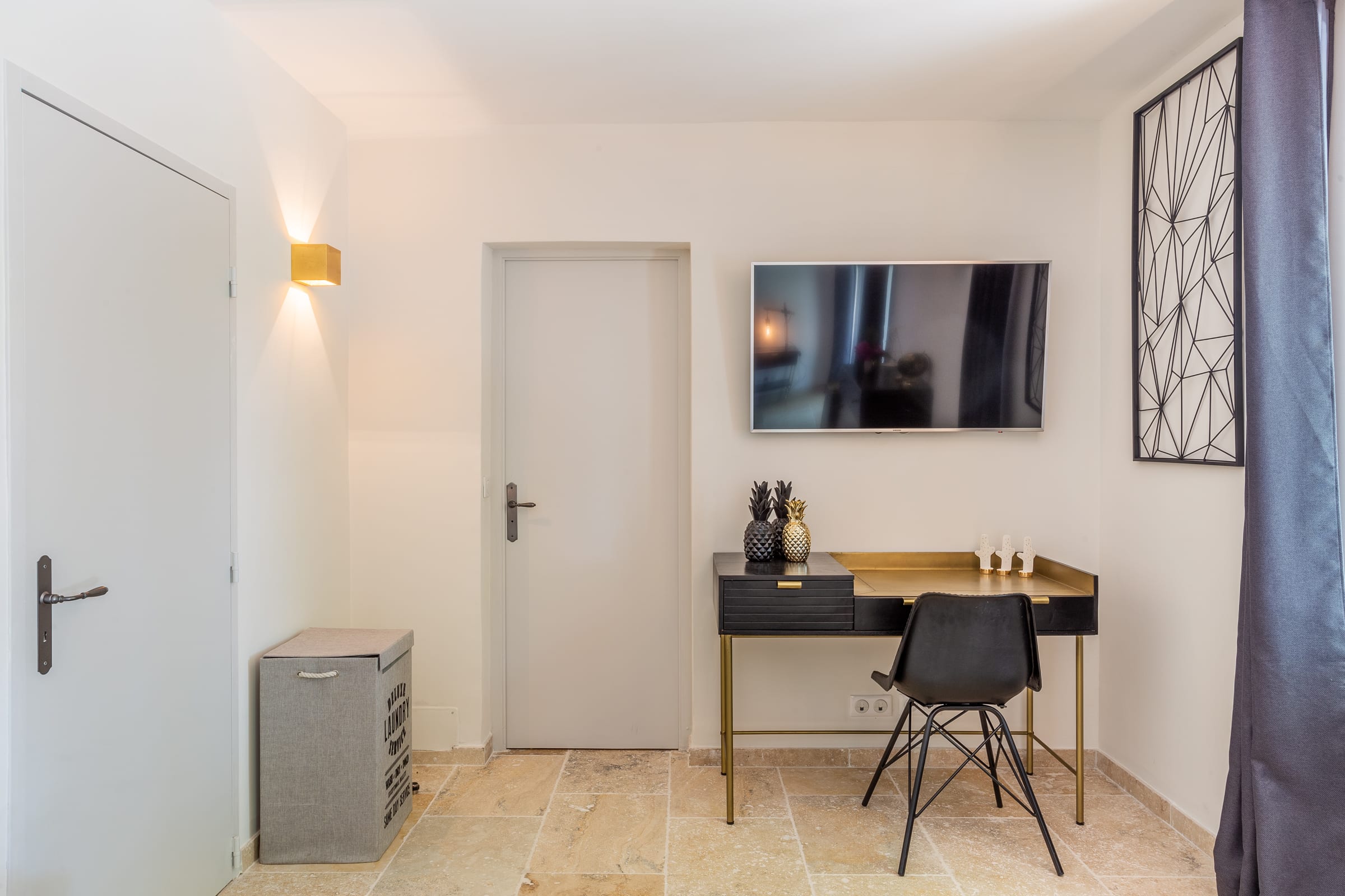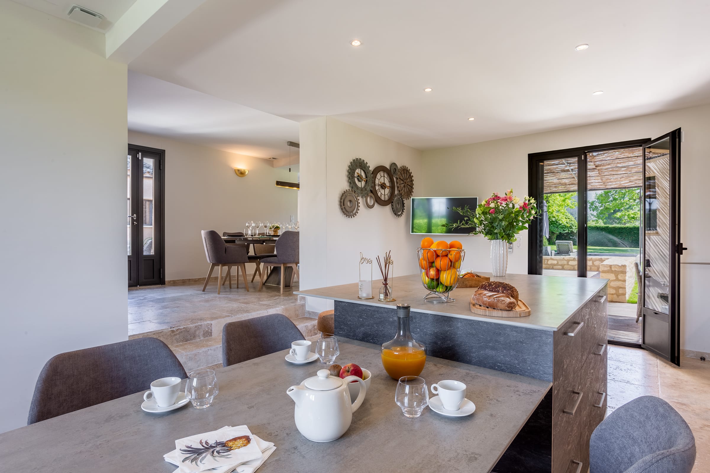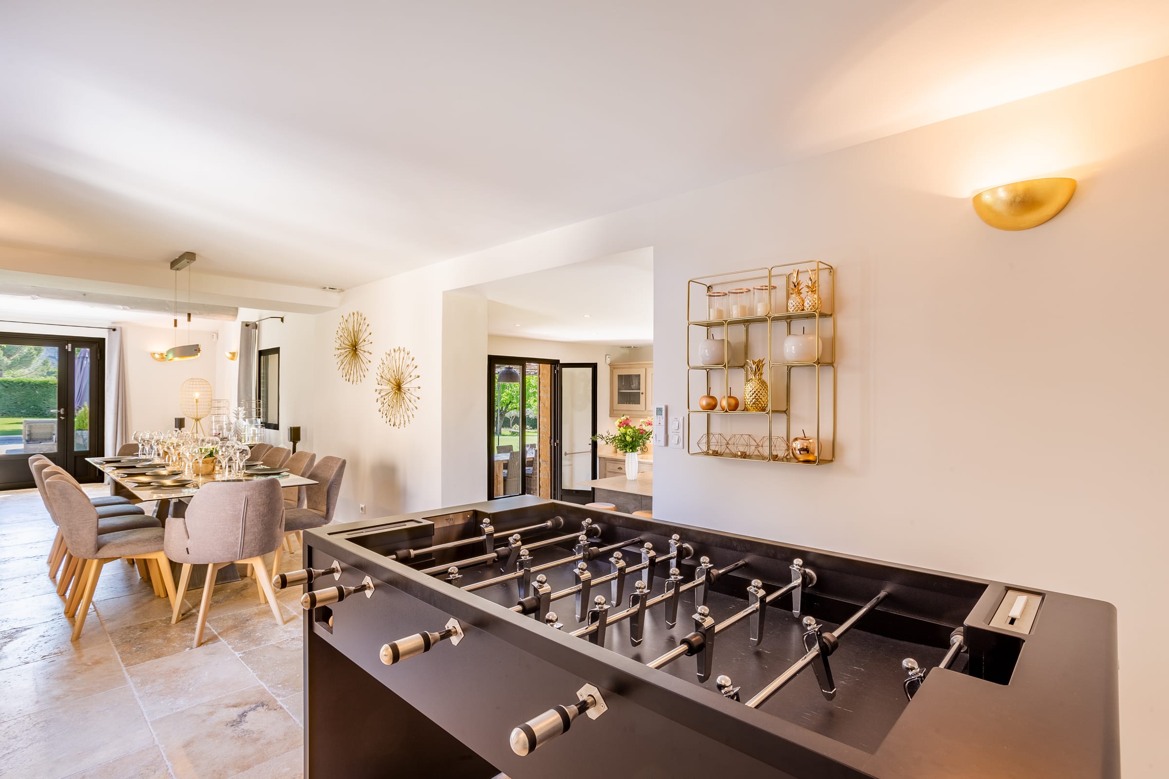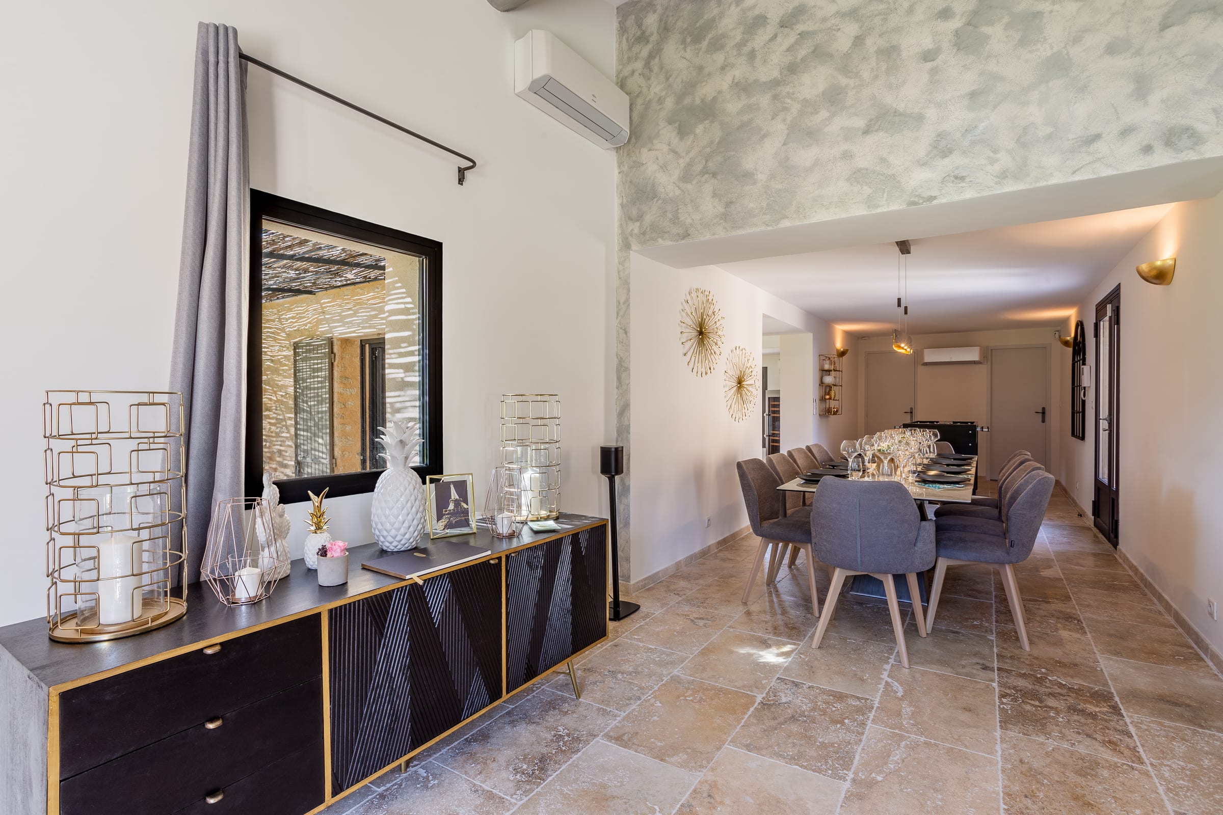 The fully air-conditioned villa comprised of a living room with wood stove, a fitness room with a desk, a dining room, a fully fitted kitchen opening onto a terrace, 4 bedrooms, each uniquely decorated, 1 bathroom, 3 shower rooms and guest toilet, assuring you the greatest possible comfort.