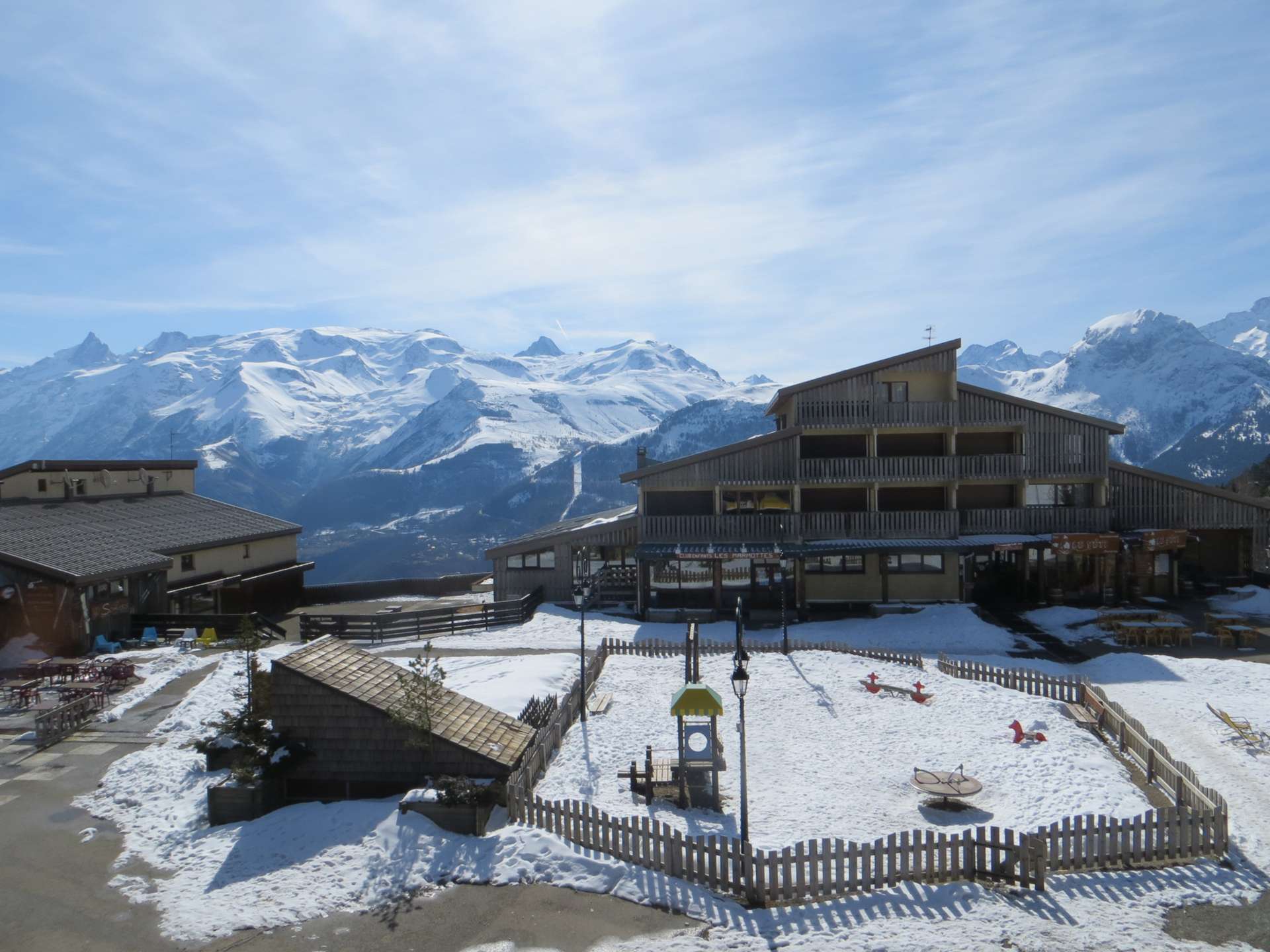 Spacious and nicely decorated apartment with 2 bedrooms, in ski to door residence on pedestrian square. Large south facing balcony with garden furniture. Superb view on the Ecrins summits and on the slopes.