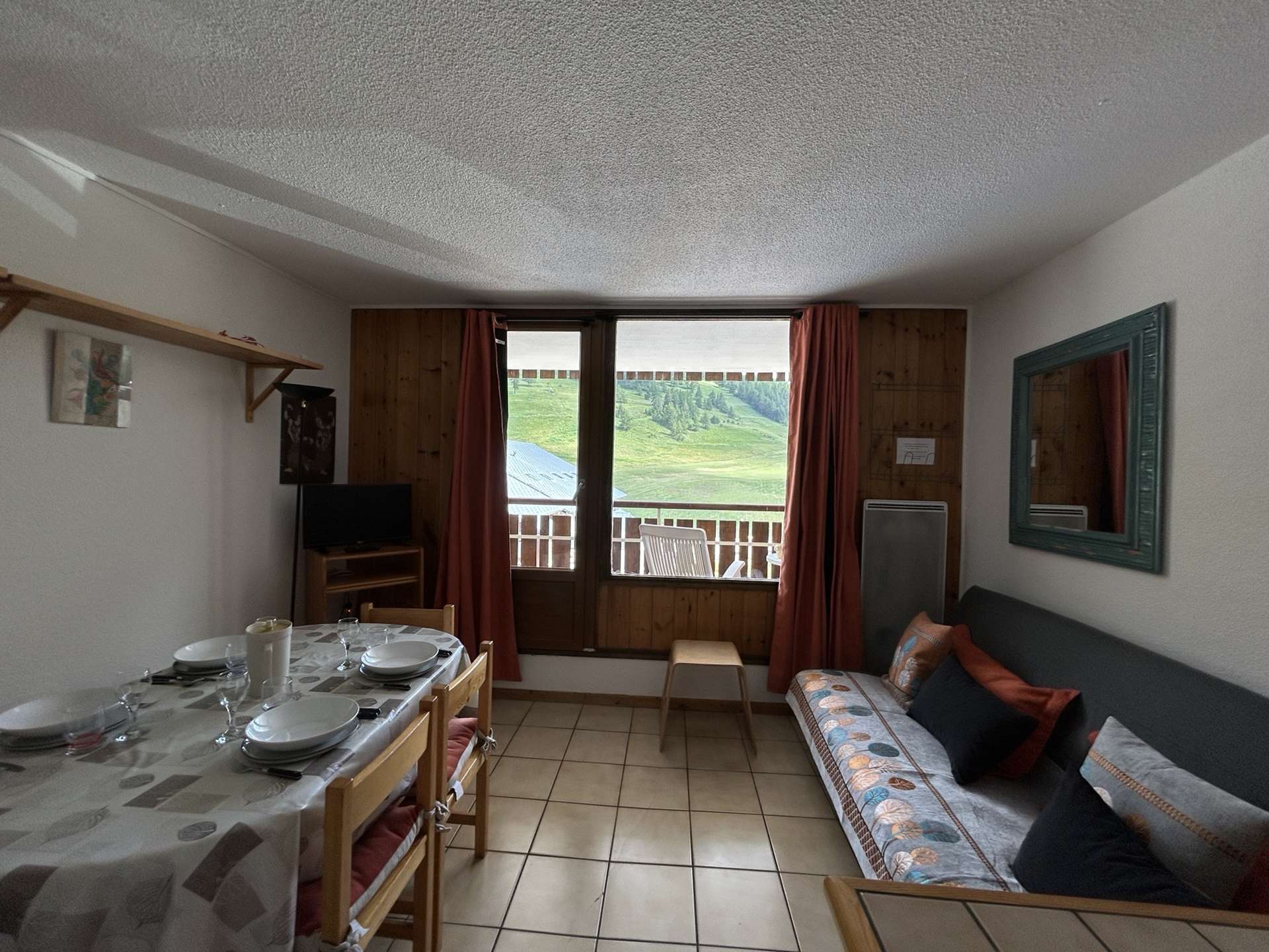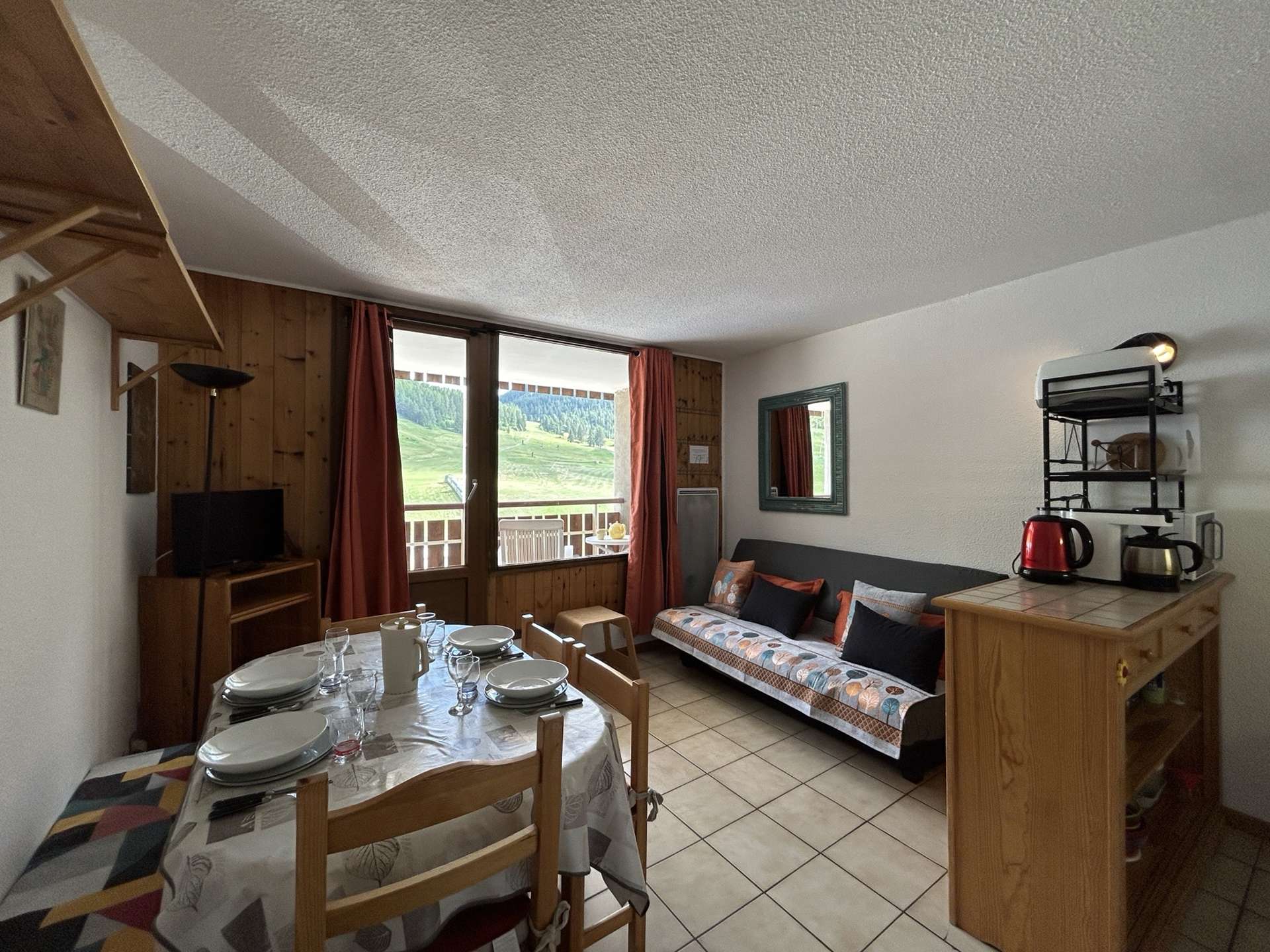 A living room with a 140 cm double sofa bed, a television, a south-facing balcony with a view of the slopes