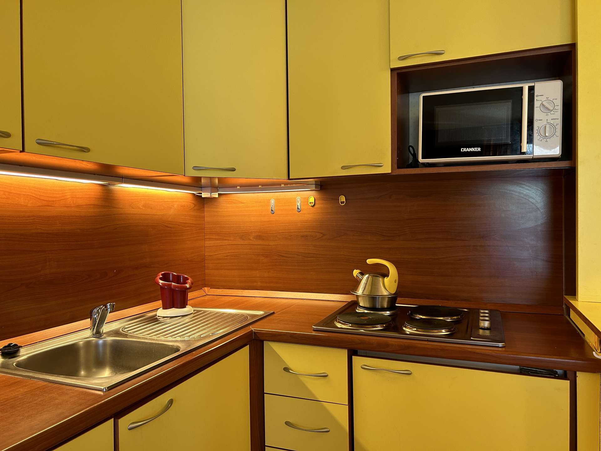 - The kitchen contains: 4 electric hotplates, refrigerator, dishwasher, microwave, coffee maker, toaster.