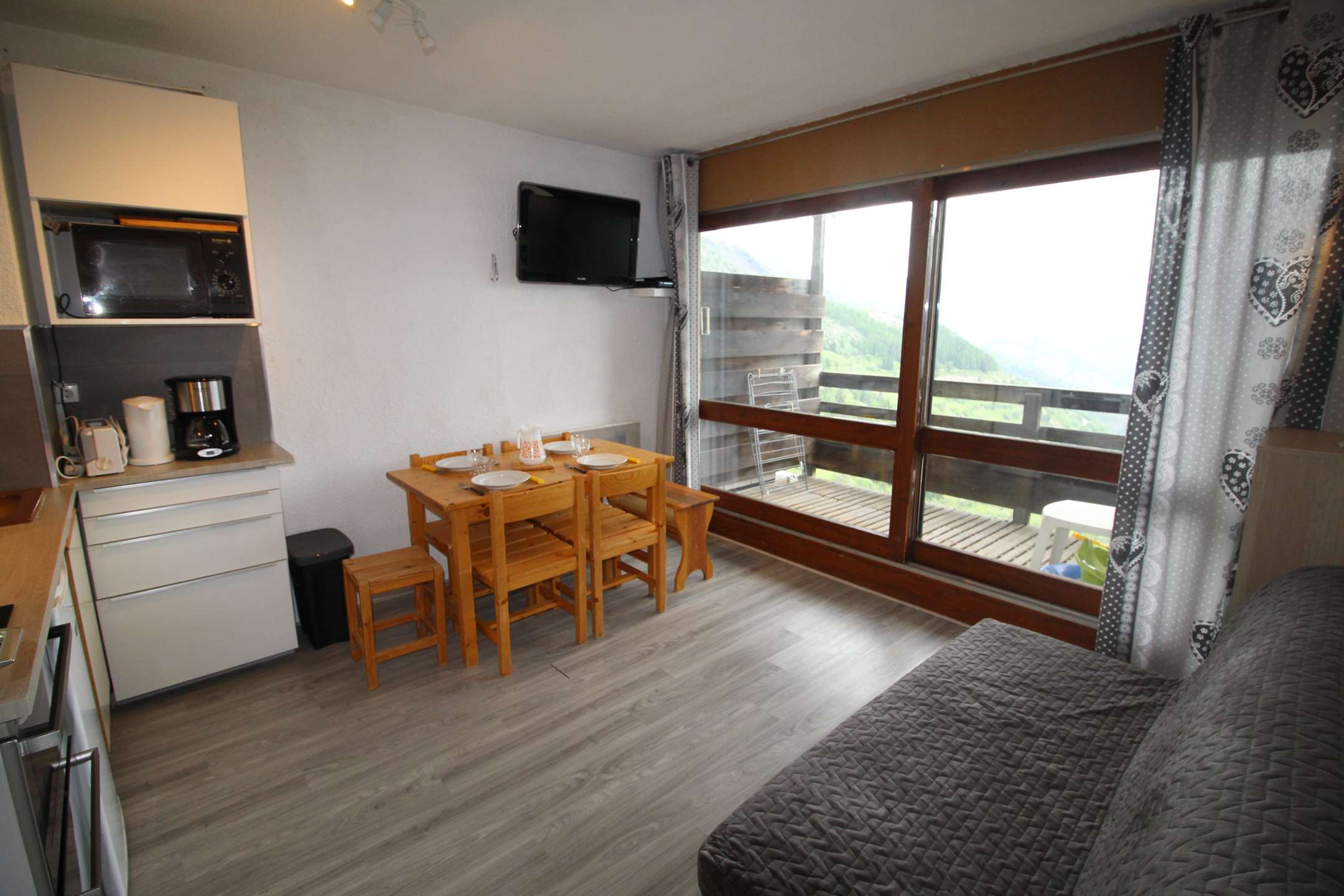 Comfortable, non-carpeted studio for 4 at the foot of the slopes, with a closed cabin bedroom. Its south-east-facing balcony offers a magnificent view of the Écrins mountains.