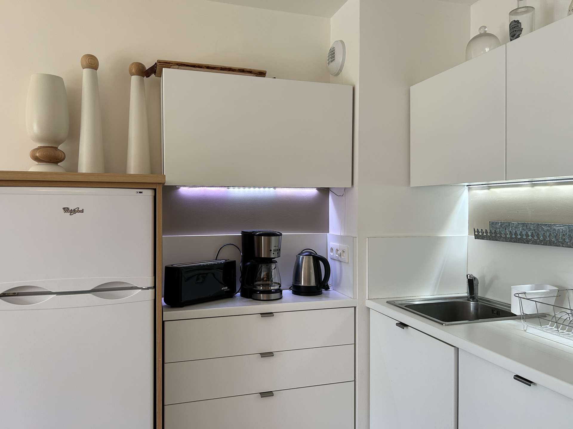 - The kitchen area has a dishwasher, refrigerator, 4 ceramic hobs, traditional oven, electric coffee maker, kettle and toaster.