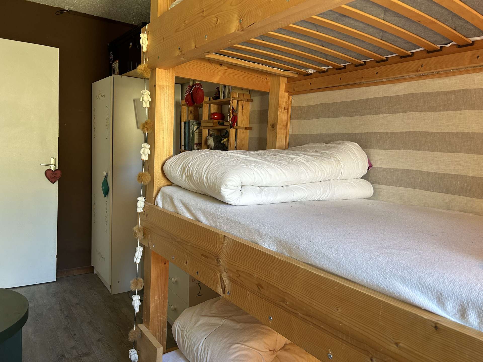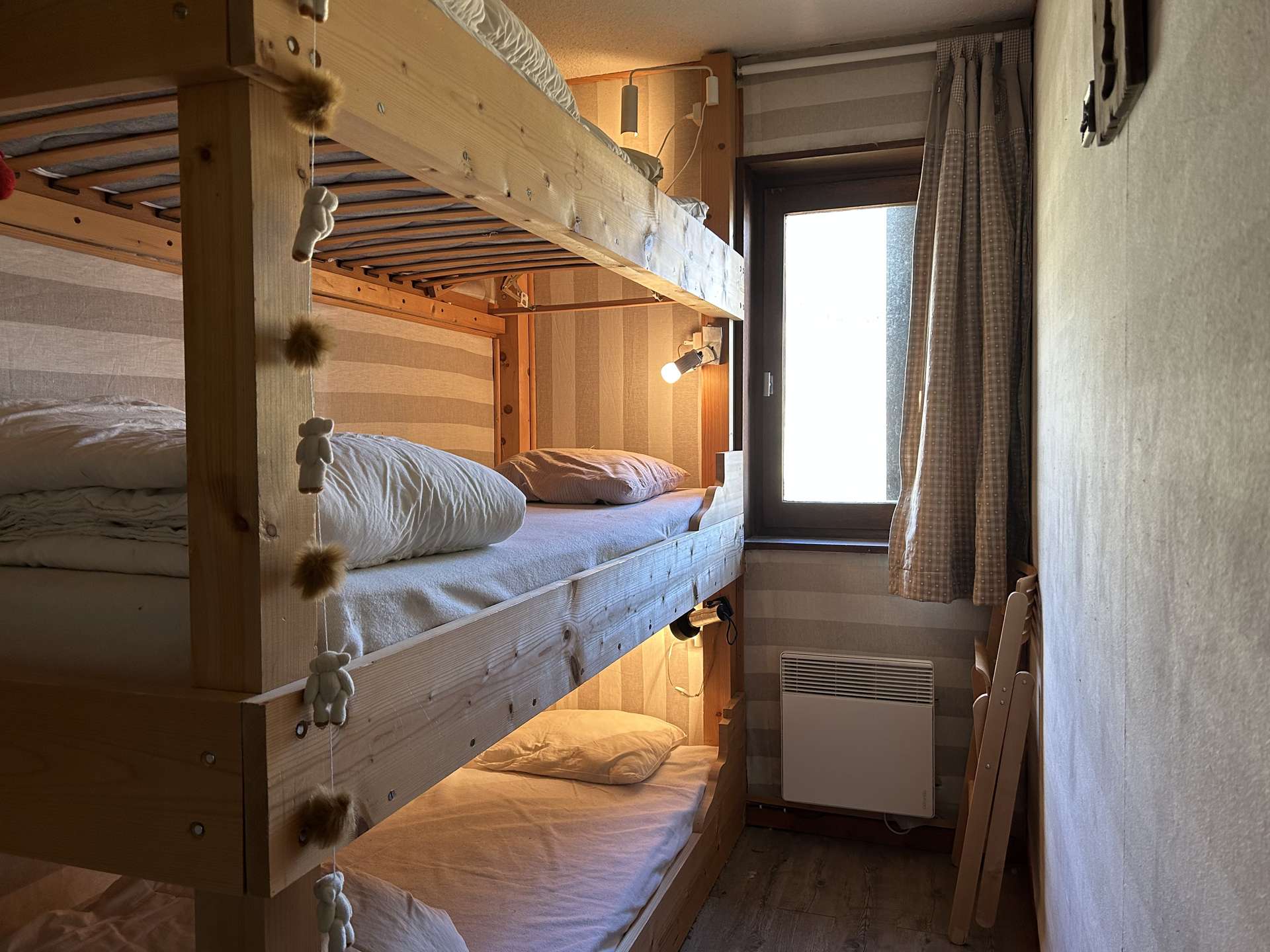-a bedroom with two 80 cm bunk beds for one person and a closet