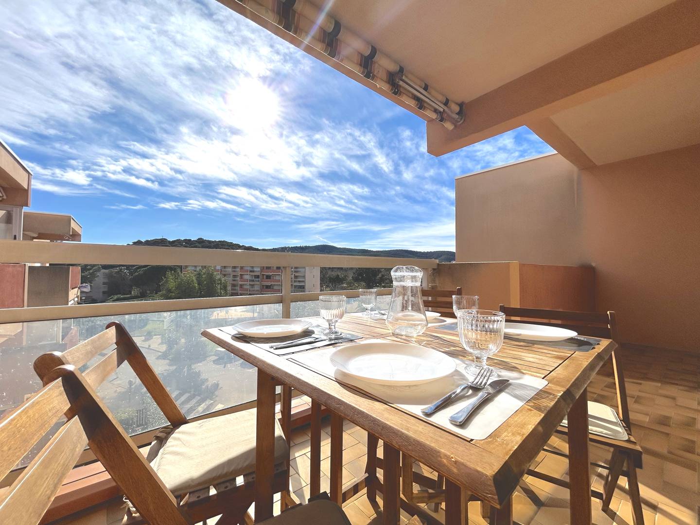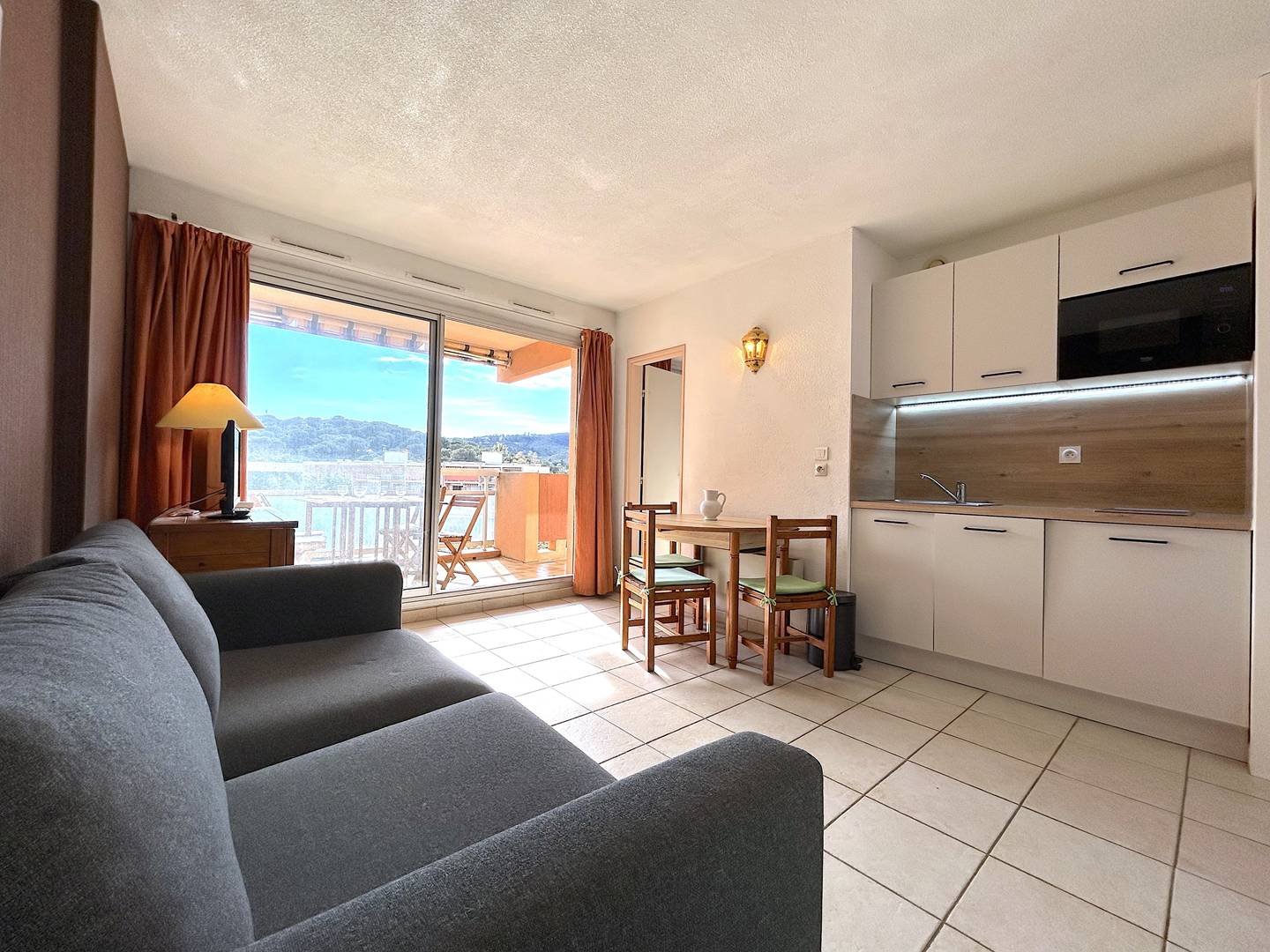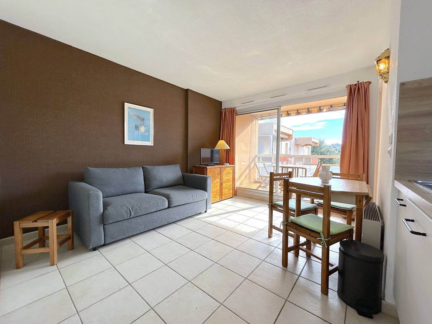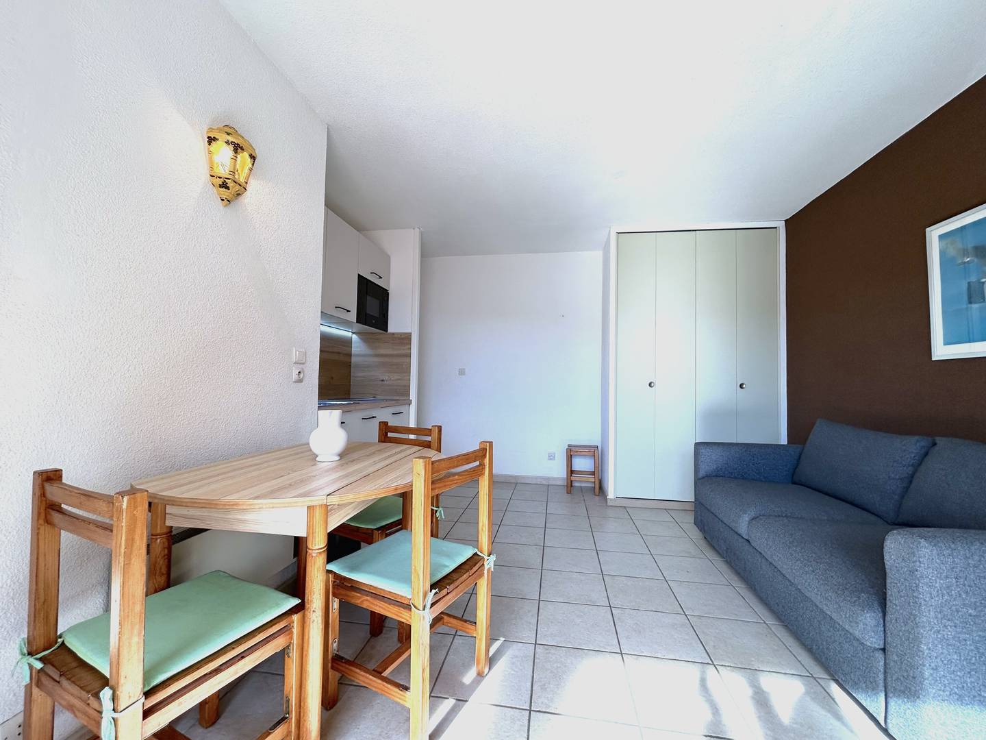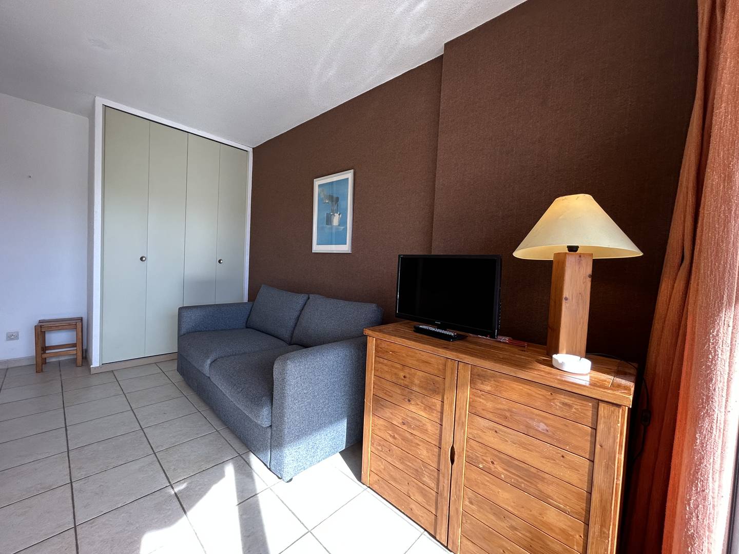 Located on the 3rd floor of the residence, this SOUTH-facing rental offers a terrace with solar blinds, a living room with convertible sofa, a kitchenette, a bedroom with bunk beds and a bathroom with toilet.