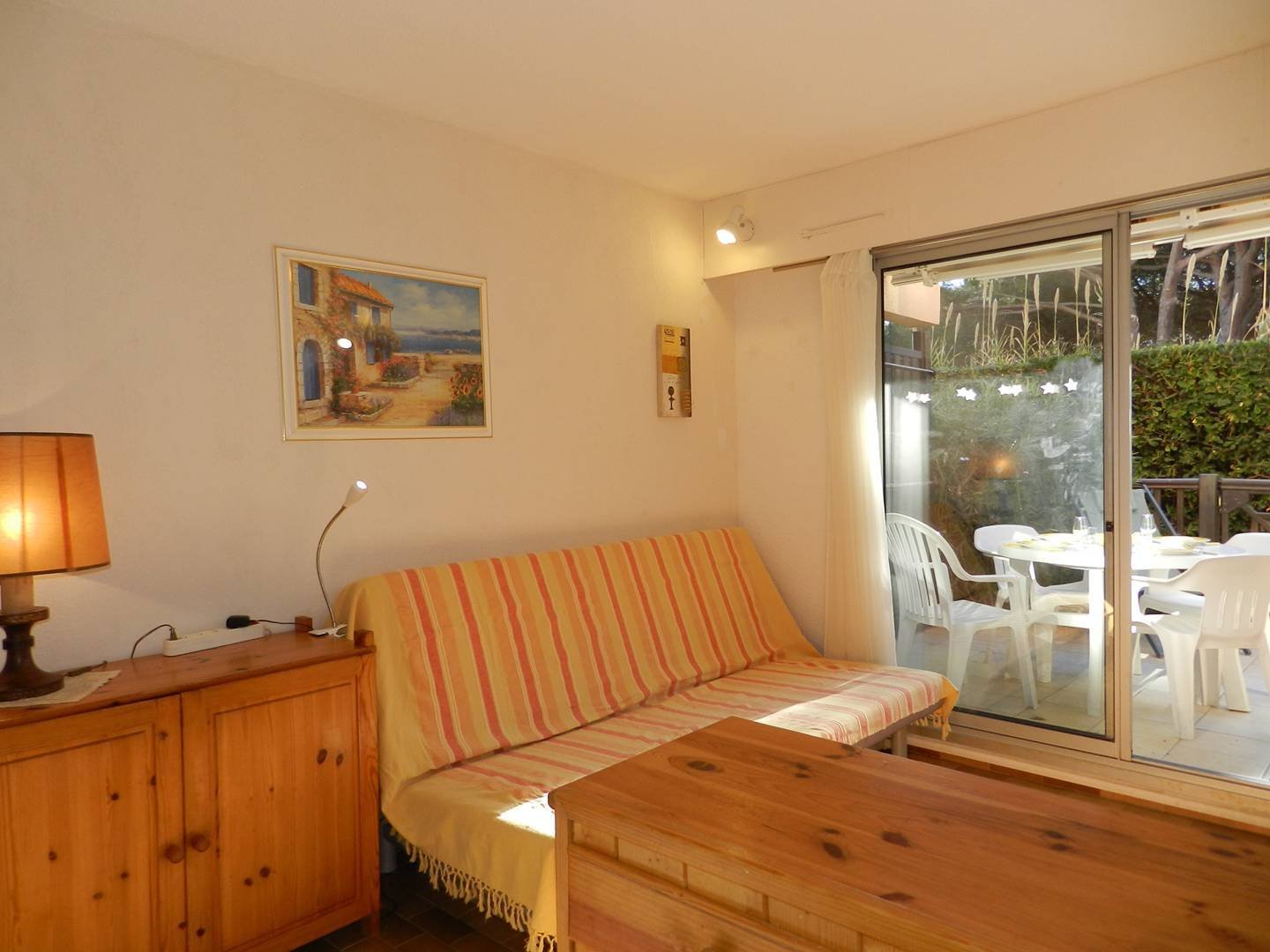 Studio cabin of 26 m ² situated in La Favière, in garden level of the building N of the residence Les Rives de la Favière. It includes lounge with a sofa bed and TV, a very well equipped kitchen area (patches with induction, oven, microwaves, refrigerator, freezer), a cabin with 2 bunk beds of 90 cm. A private parking space. Big terrace enclosed by 12 m ² exposed to the South. Not admitted animals. Residence with entry closed by firewall, playground for the children, the elevator in every building.