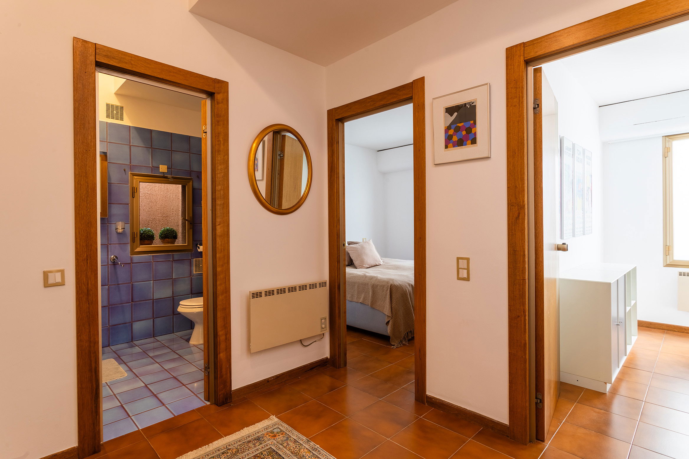 2 bedrooms are on the lower floor with bathroom and toilet, the bedrooms overlook a skylight.