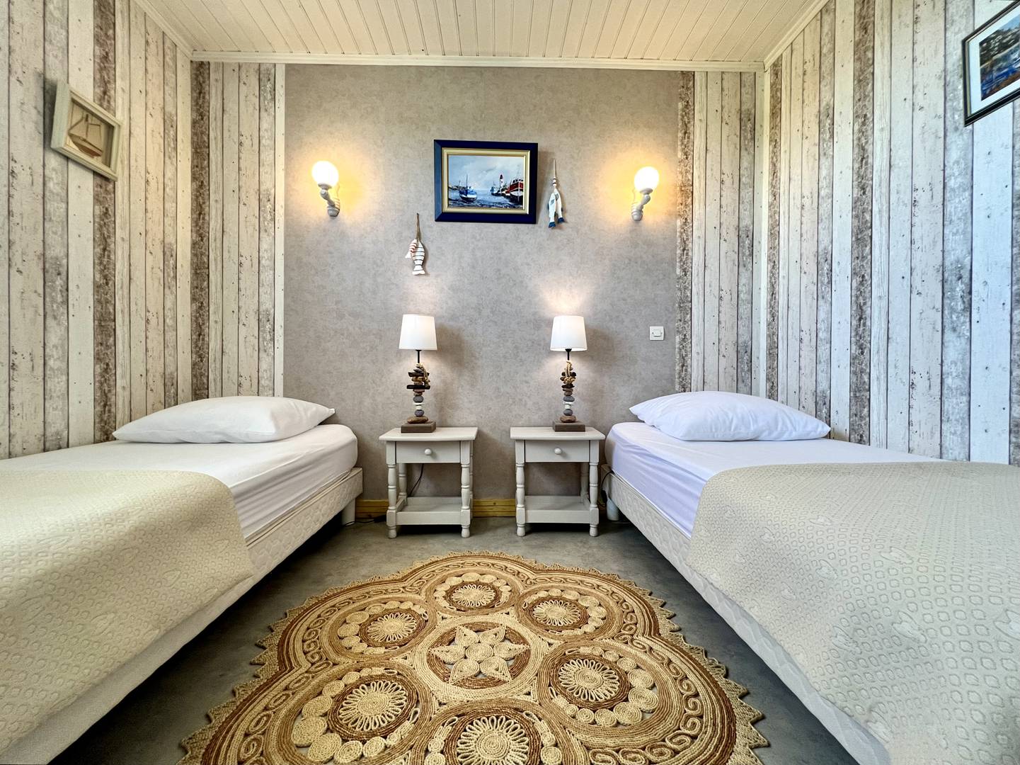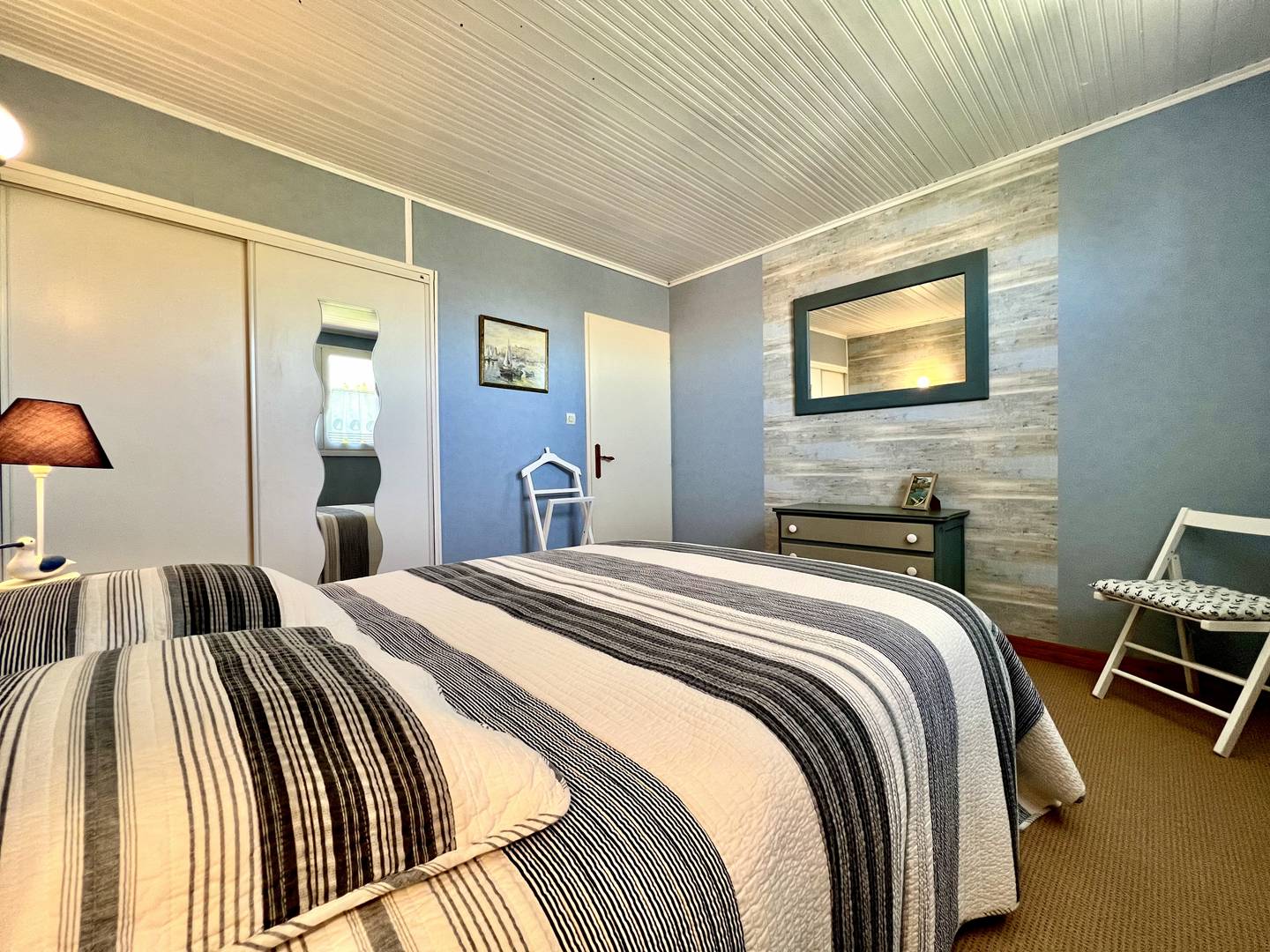 À l'étage, une première chambre composée de deux lits simples (90x2) avec une armoire. La deuxième chambre est composée d'un lit deux couchages (140), ainsi que d'une commode et d'un dressing. La troisième chambre est composée d'un lit deux couchages (160), d'une télévision, d'une commode et d'un dressing. La salle de bain est composée d'une baignoire ainsi que d'un meuble double vasque avec un large miroir.