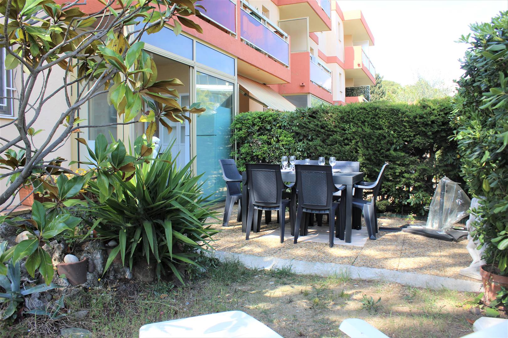 This charming apartment is located on the ground floor, it consists of a small independent kitchen, a very large living room with two sofas convertible into 140 cm beds, its dining area in the terrace closed as a veranda overlooking a huge garden of 80 m² flowered. A shower room and a separate toilet. The accommodation is air-conditioned and has private parking. End of stay cleaning included.
