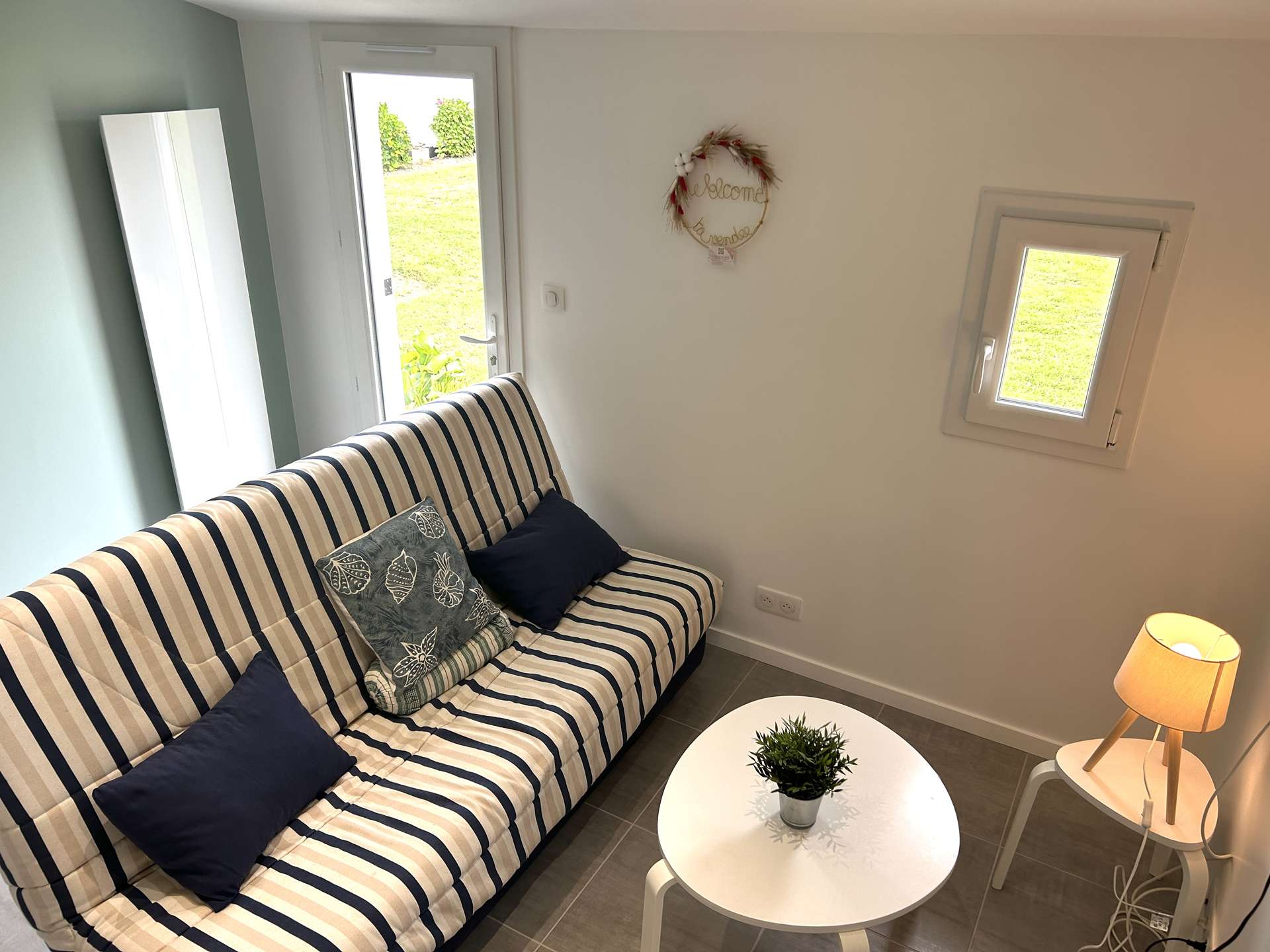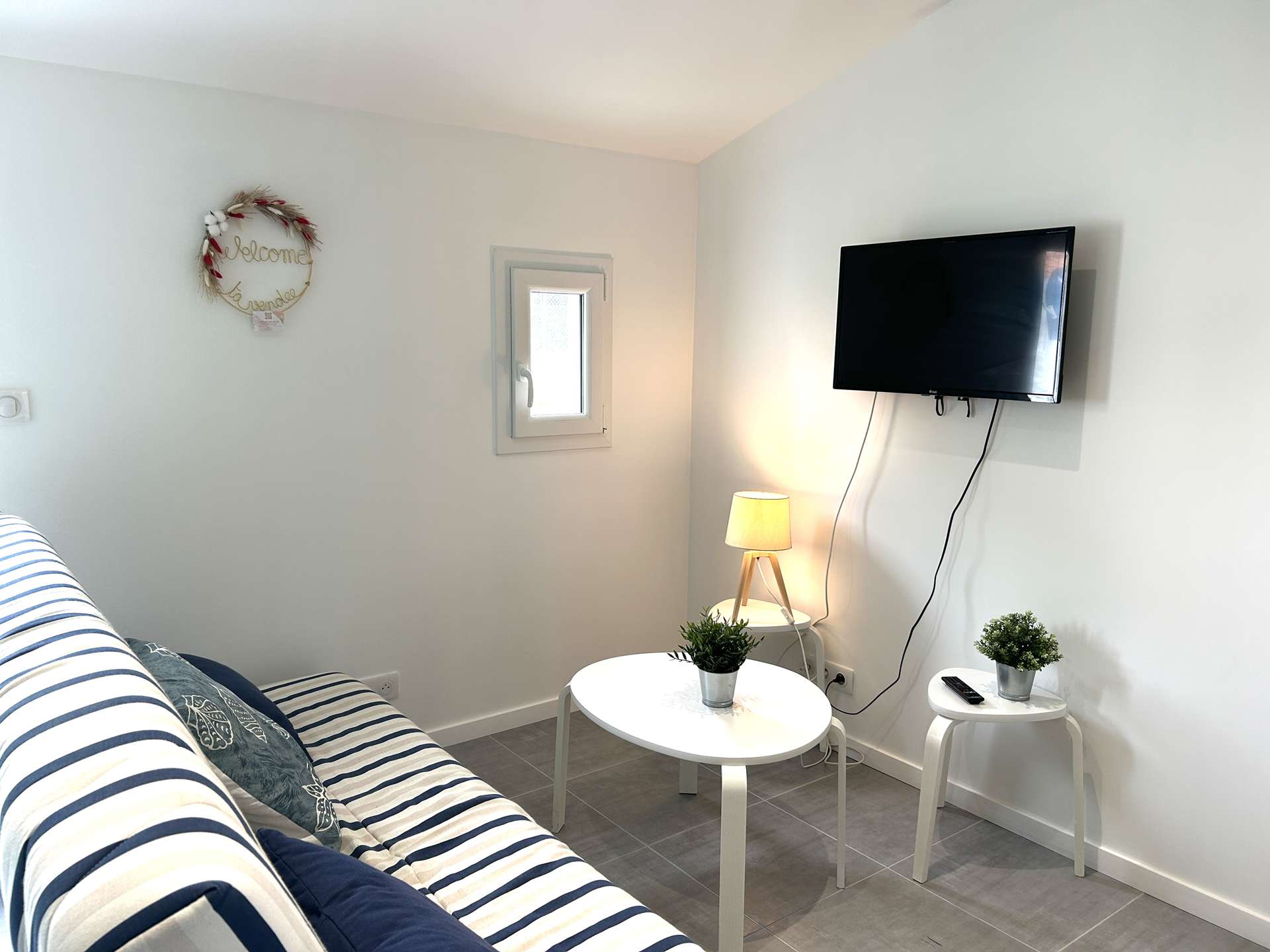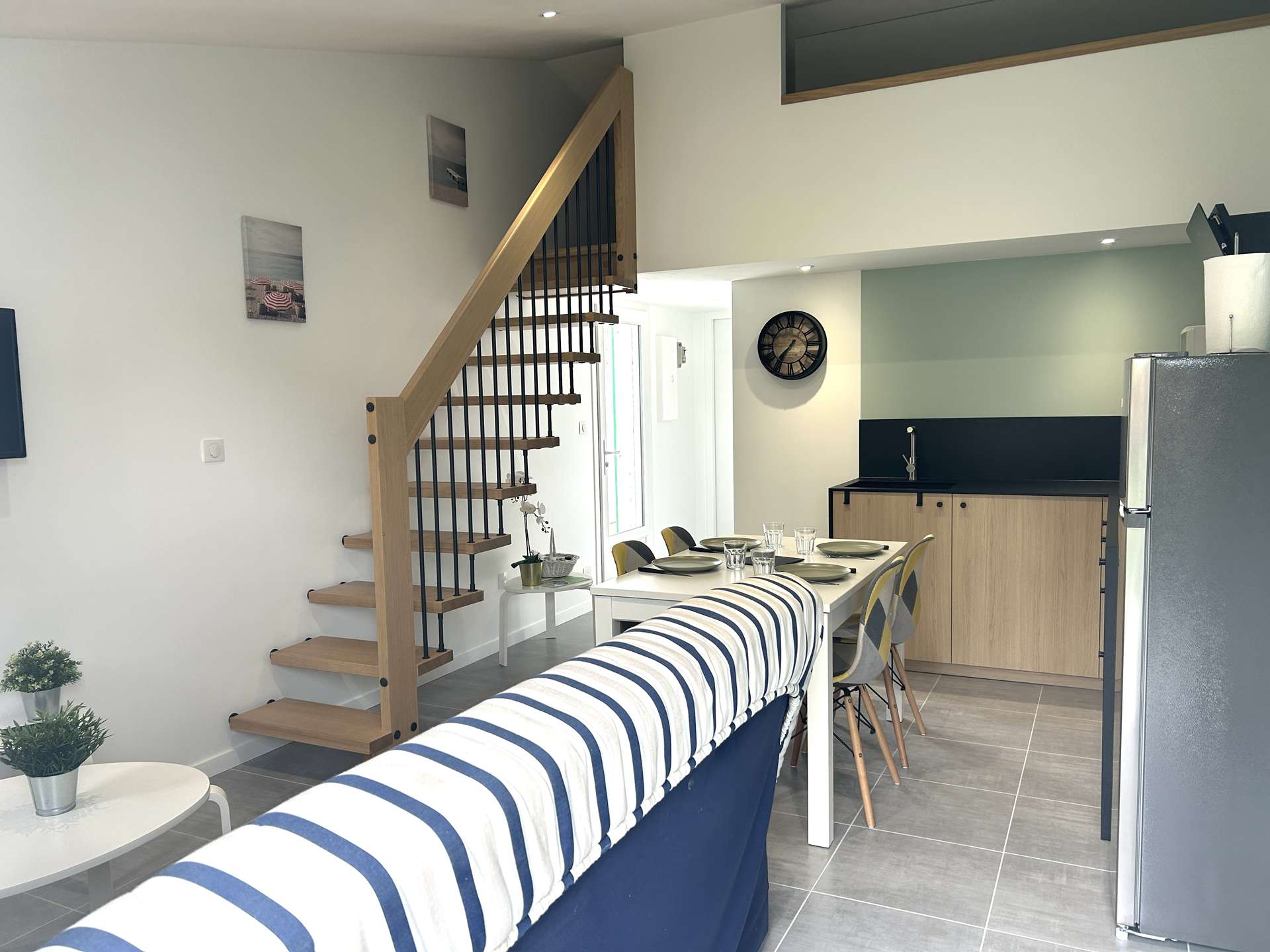 Située à proximité de la mer et 1km500 du centre Brétignolles, La résidence Les Fermes Marines est composée de pavillons mitoyens. Cette location de vacances entièrment rénovée comprend un coin-cuisine aménagé (lave-linge), un séjour avec un canapé clic clac et télévision, une chambre avec 1 lit double, une mezzanine (hauteur maximale :1,40m, accès par une échelle de meunier) avec un lit double , une salle d'eau avec un wc