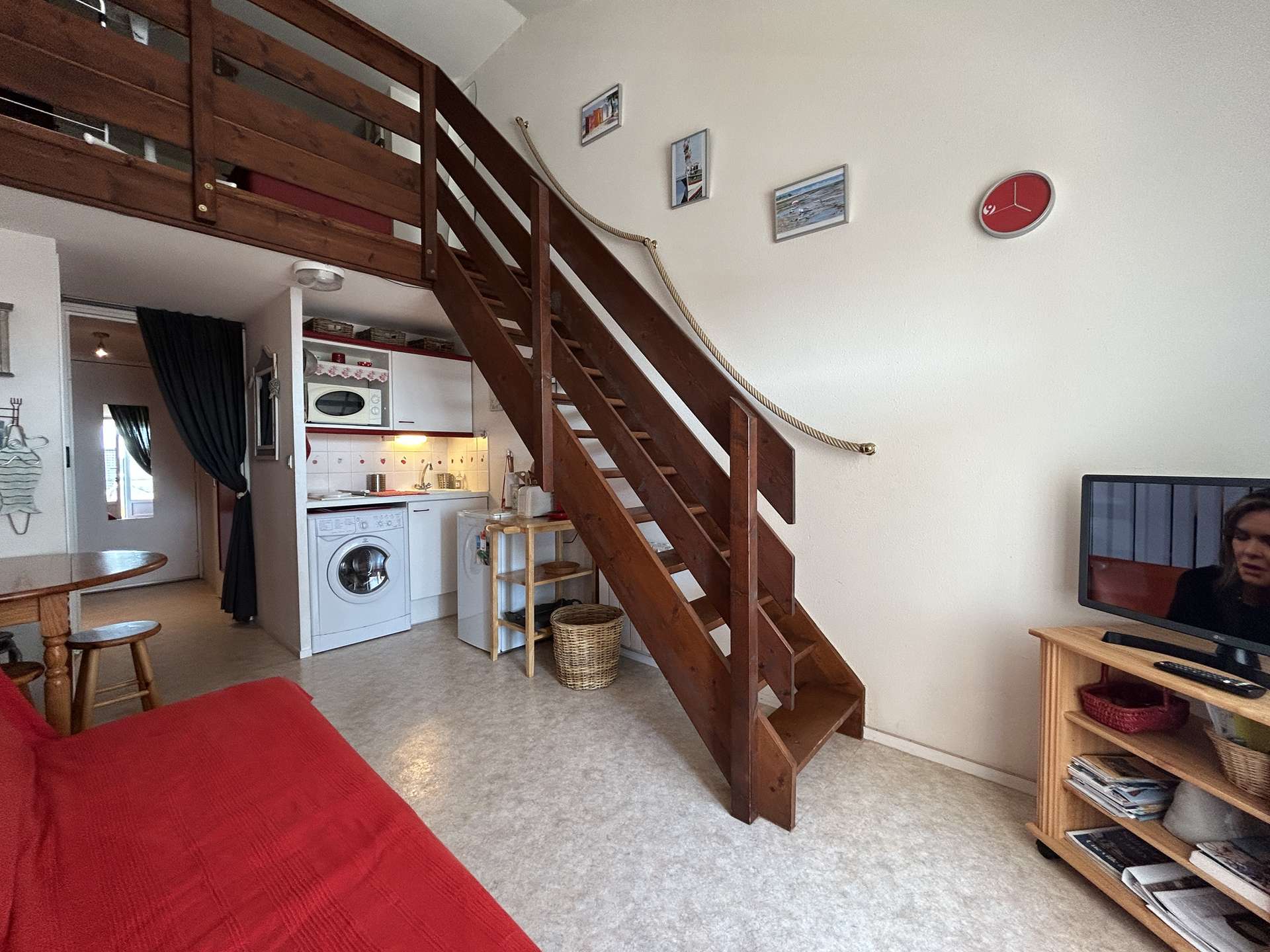 Cette coquette location de vacances se situe à environ 200 m de la plage et 1Km700 du centre de la station. Au 2ème étage avec balcon fermé et salon de jardin, elle se compose d' une entrée, un coin-cuisine équipé micro-onde et lave-linge, un séjour avec canapé convertible 2 personnes et télévision, une mezzanine avec 1 lit double, salle de bains et wc, un garage