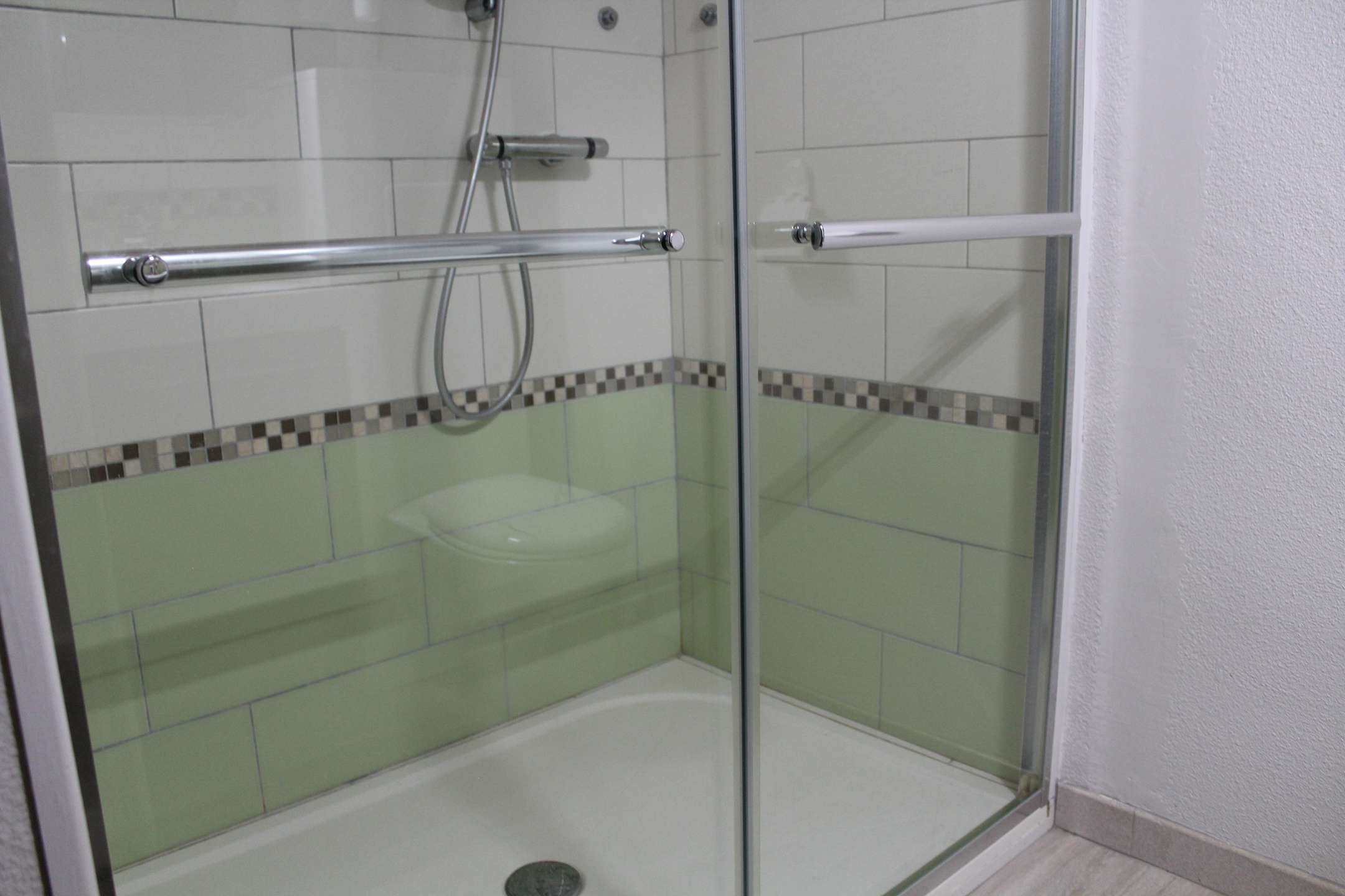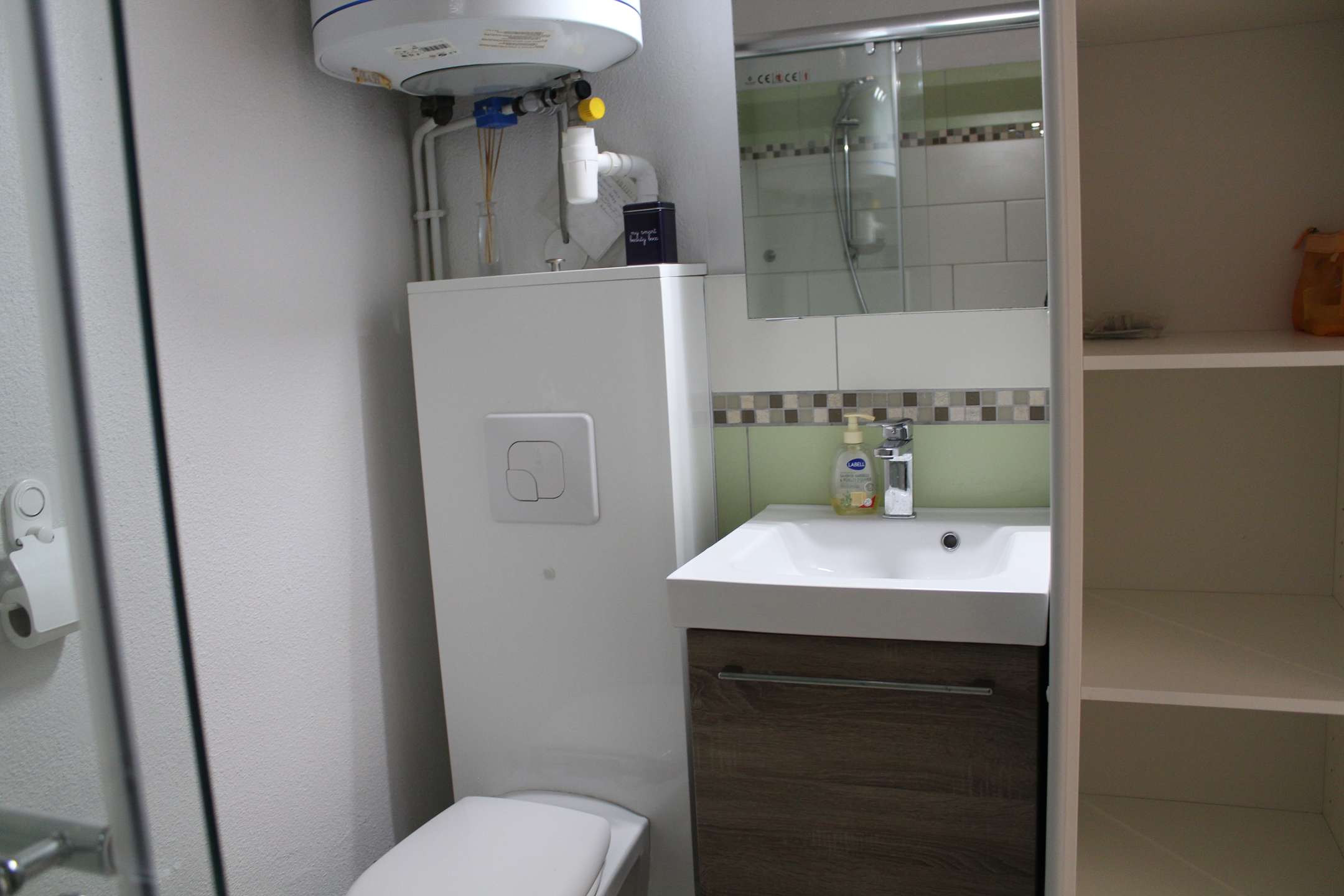 This holiday lodge includes a veranda, a living room with a two-seater sofa bed and television, a kitchen area equipped with a washing machine and dishwasher, a bedroom with a sofa bed. A bathroom with a walk-in shower and WC.