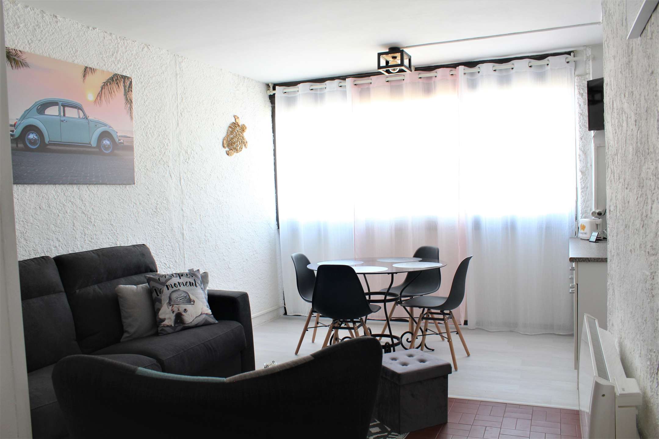 This pretty apartment by the sea, tastefully renovated, is composed of a living room with a comfortable convertible sofa, a cabin with a double bed and flat screen television, an equipped kitchen area, and a bathroom with WC.