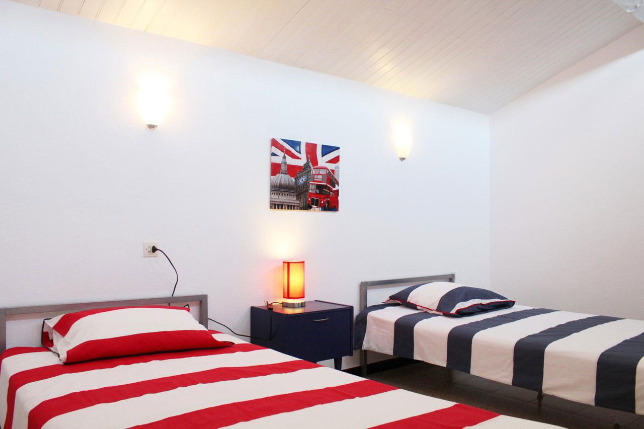 Upstairs, a bedroom with two single beds and a bathroom with a macerator toilet.
