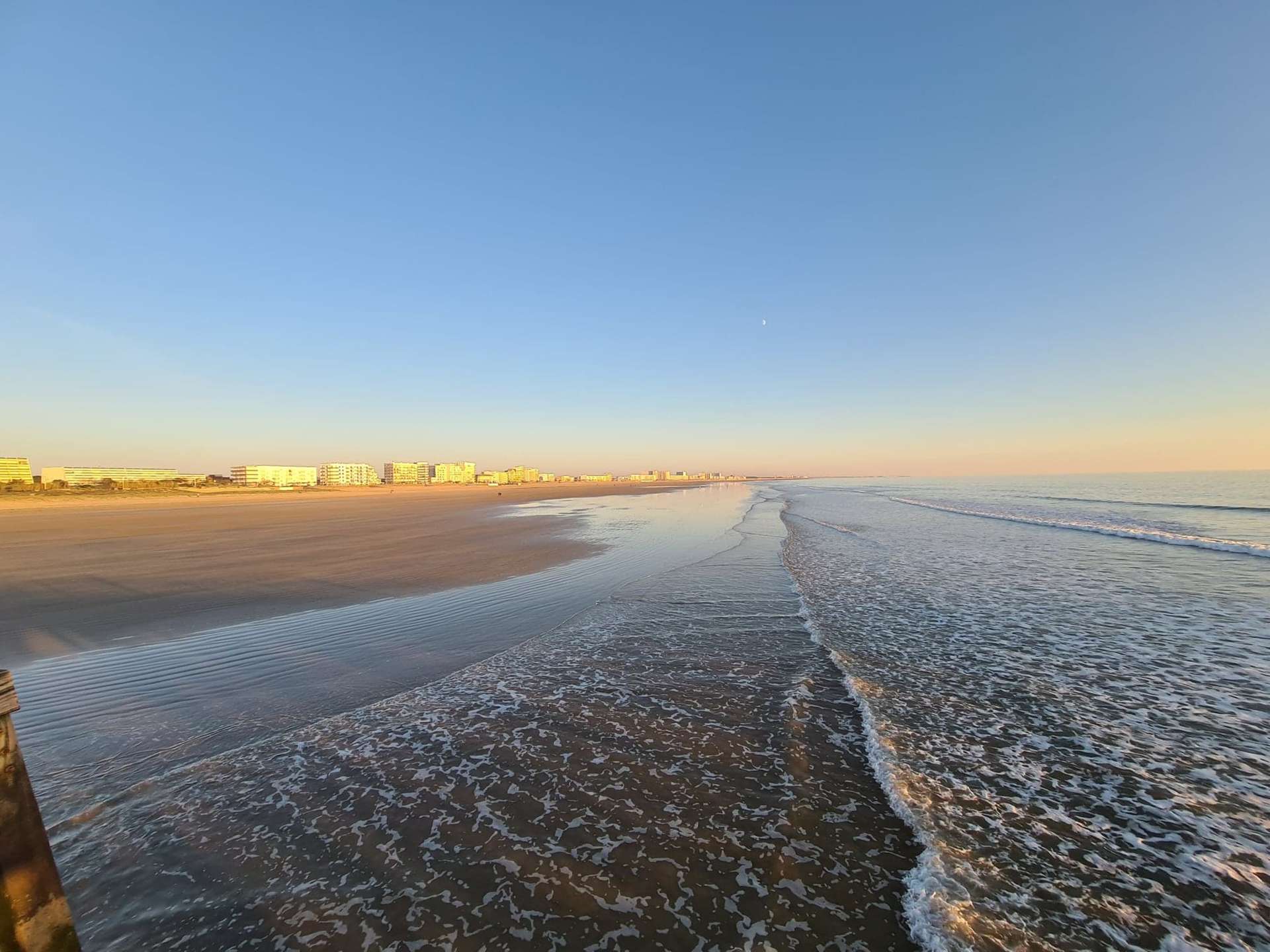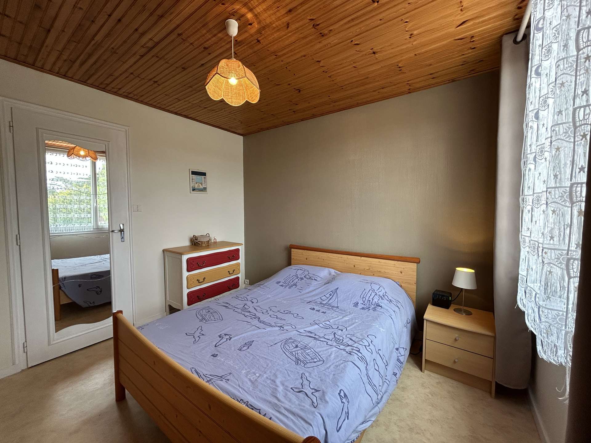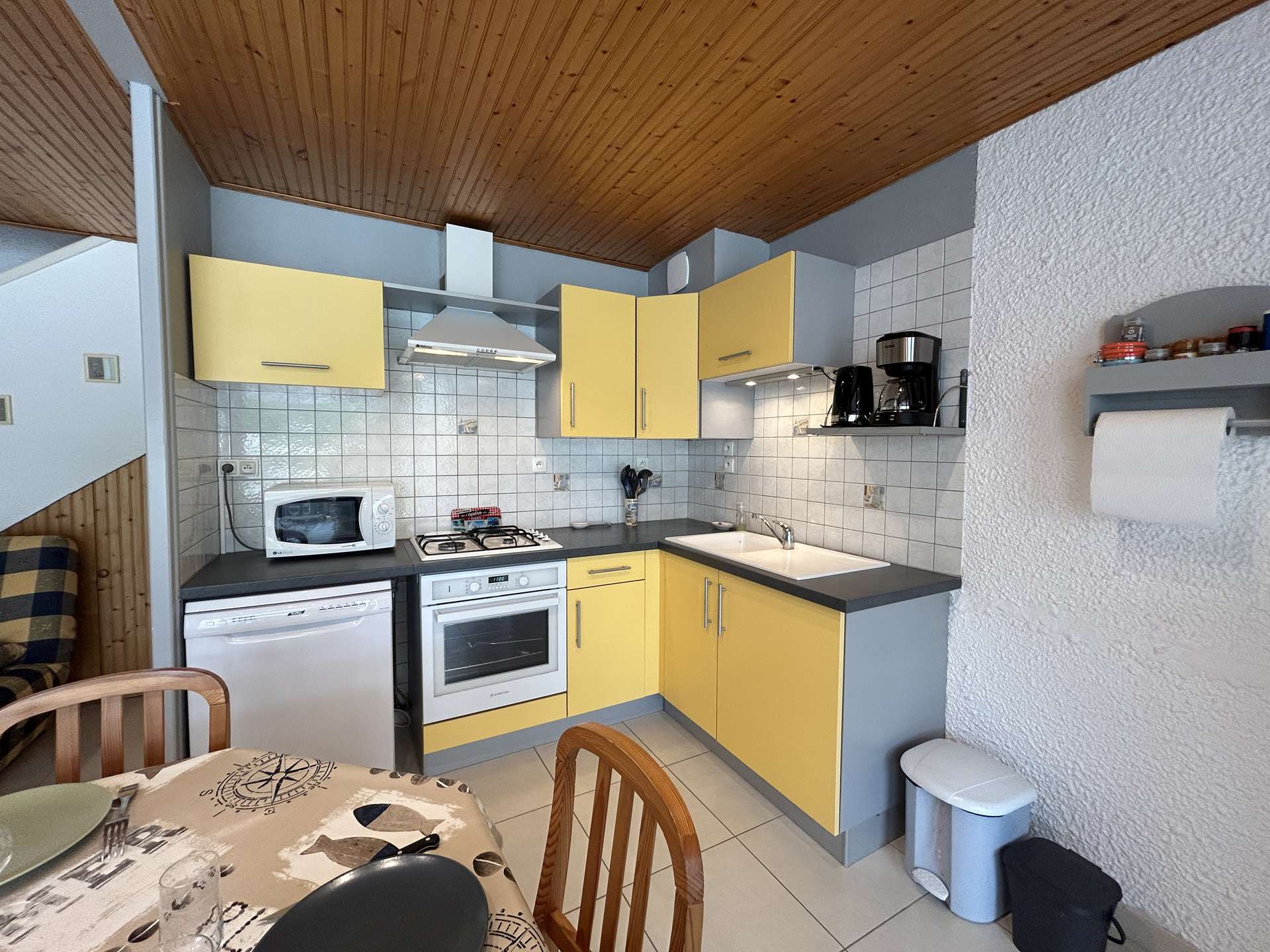 This seaside accommodation includes a living room with a sofa bed and a television, a fully equipped kitchen (microwave, oven, refrigerator with freezer, hob, dishwasher), a toilet on the ground floor, and two bedrooms with three double beds and a bathroom with toilet upstairs.