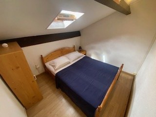 This vacation home rental includes a living room with a sofa bed and television, an equipped kitchen area, a bathroom with WC, upstairs a bedroom with a 140 cm bed and a second bedroom with a 140 cm bed.