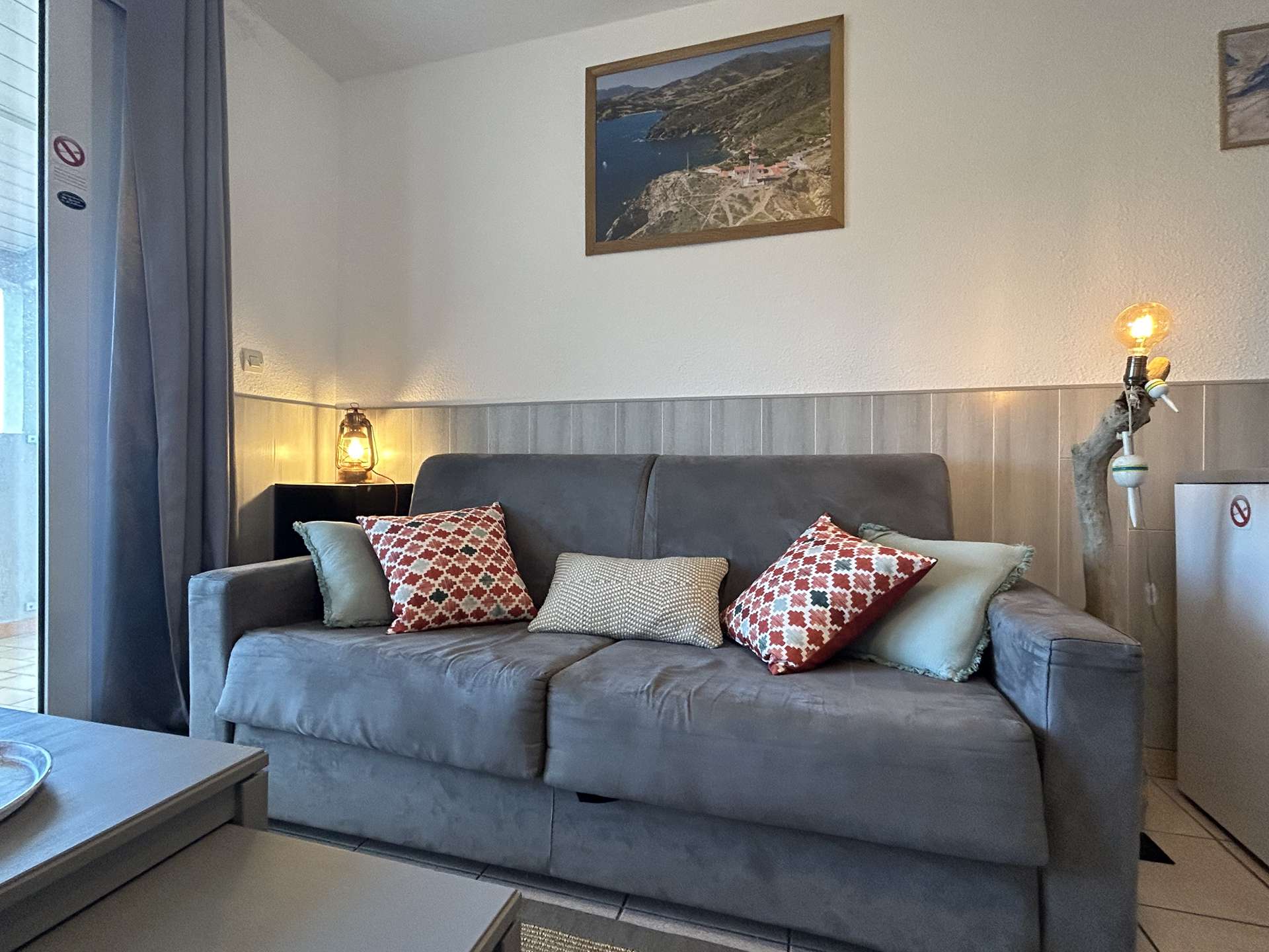 This holiday apartment, located on the 2nd floor, includes: a living room with a 2-seater sofa bed, a kitchenette, a cabin area with 2 single bunk beds, a bathroom with bathtub and toilet and an equipped terrace.