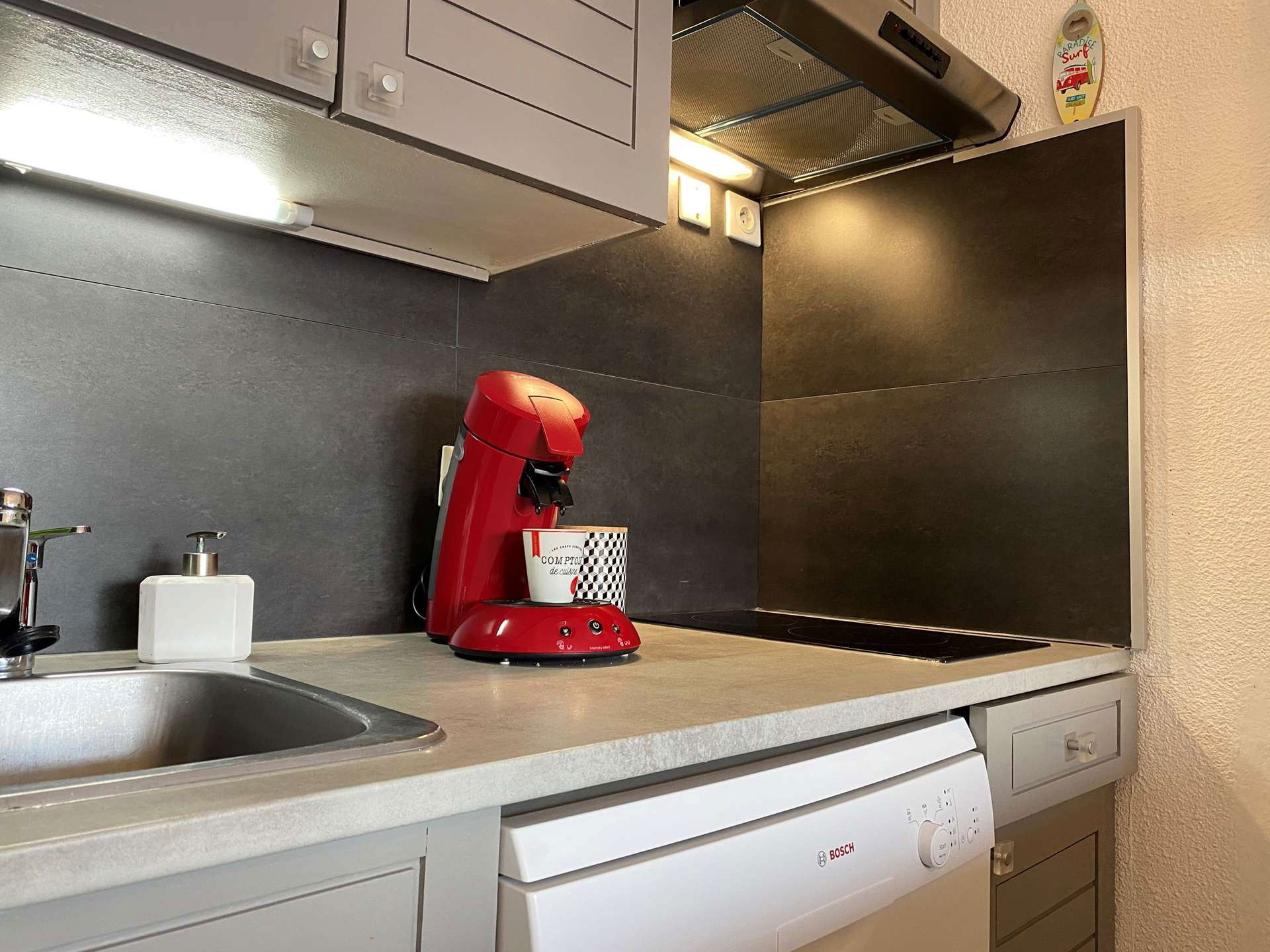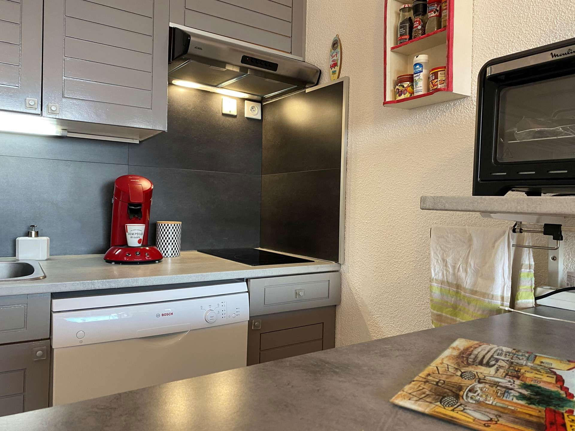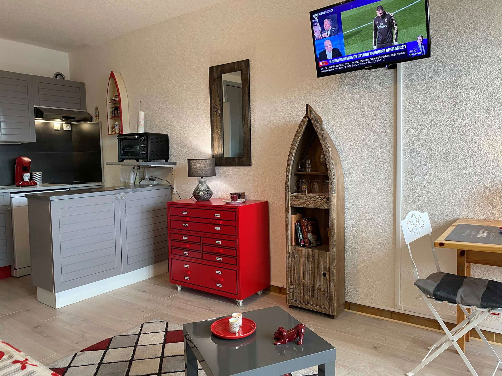 This fully renovated and air-conditioned holiday apartment located on the 2nd floor with elevator is available in a living room with a two-seater sofa bed - television, equipped kitchen area (induction hob, mini-oven, microwave, Freezer fridge, microwave, Senséo, dishwasher, etc.), bathroom renovated in 2021 with toilet and Italian-style shower.