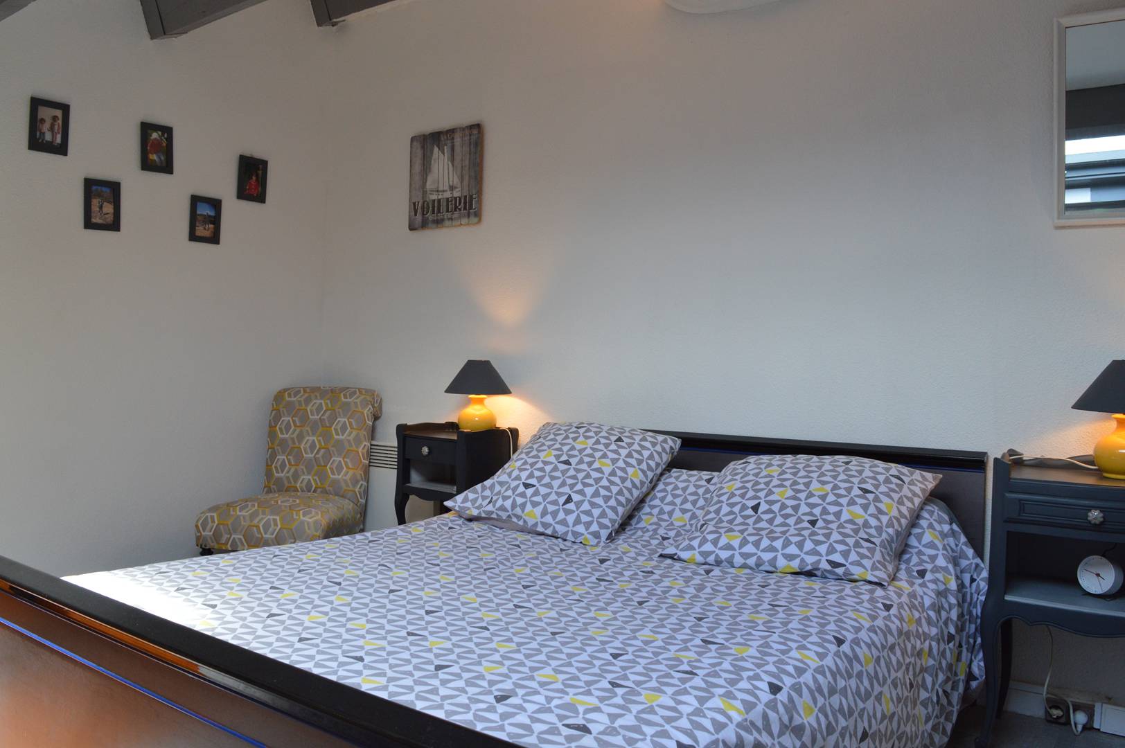 This family holiday accommodation located on the 2nd floor and top floor without elevator includes a living room with television (subject to good reception) and non-convertible sofa, an equipped kitchenette, a bedroom with a double bed (120*190), a bathroom with toilet, and a mezzanine with a double bed.