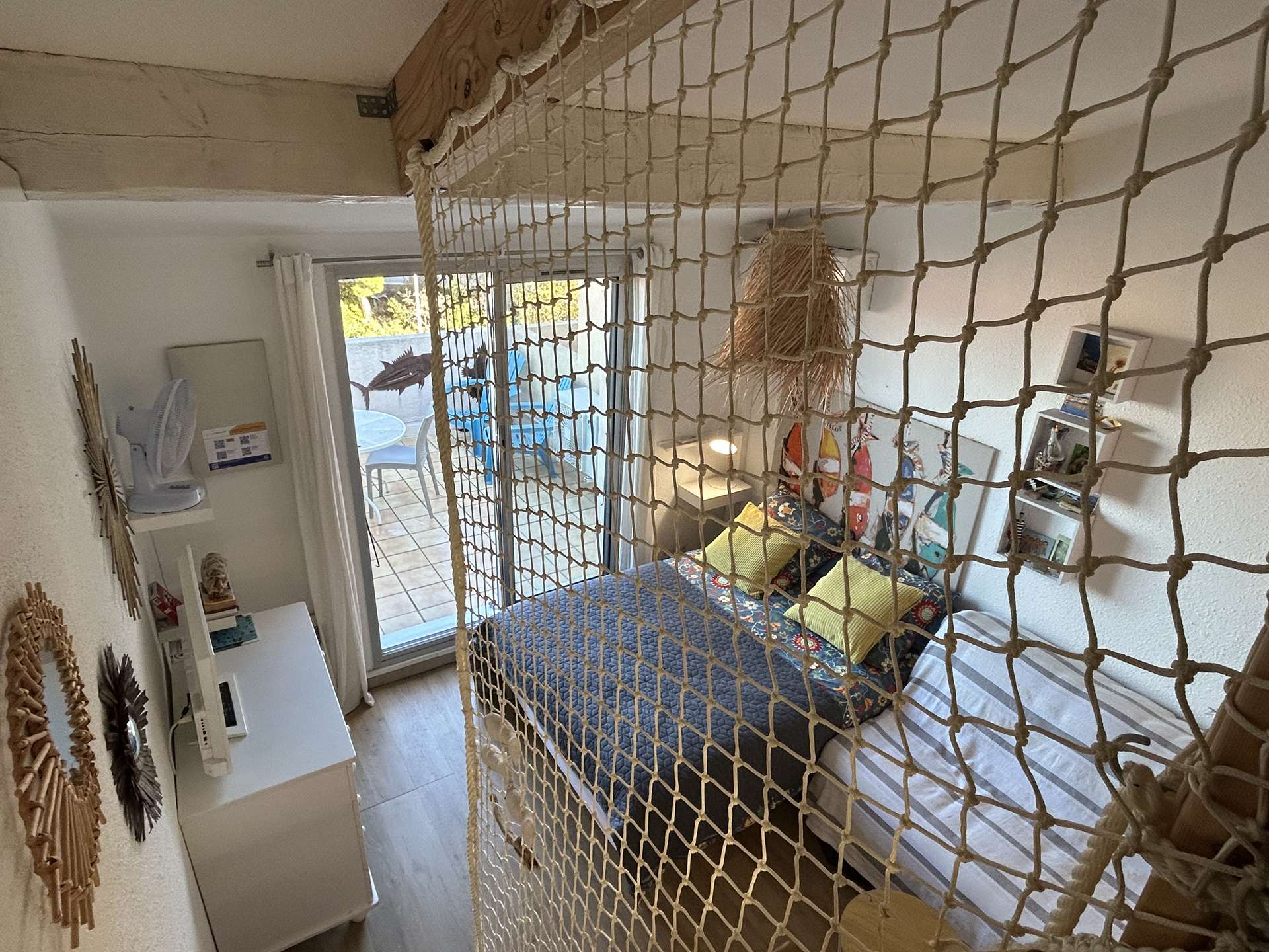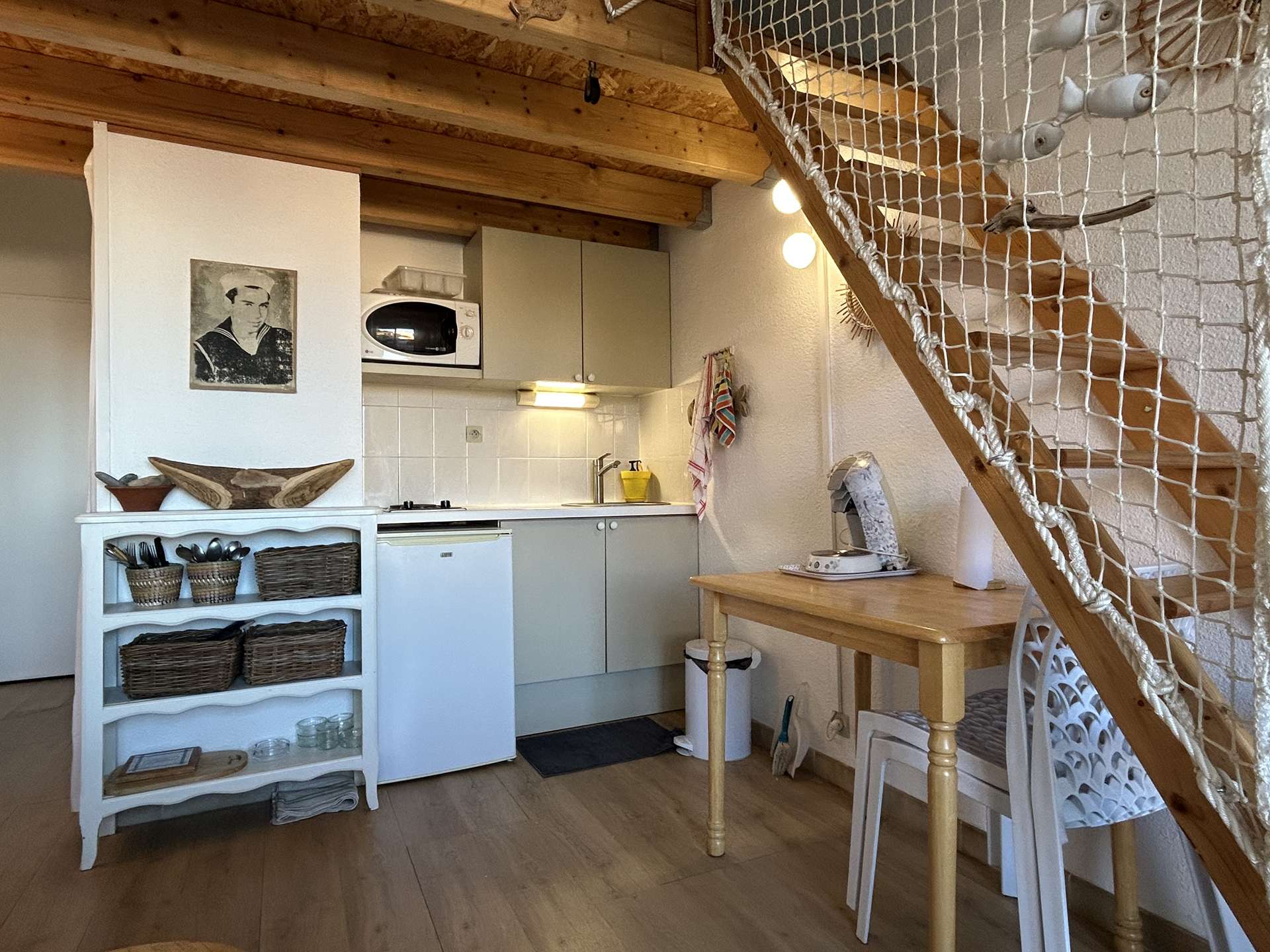 Cet appartement de vacances, situé au 2ème étage, se compose d'un séjour avec un lit pour deux personnes, un coin cuisine équipé, une mezzanine avec 1 lit double (couchage enfants conseillé - hauteur sous plafond basse), une salle de douche avec wc.