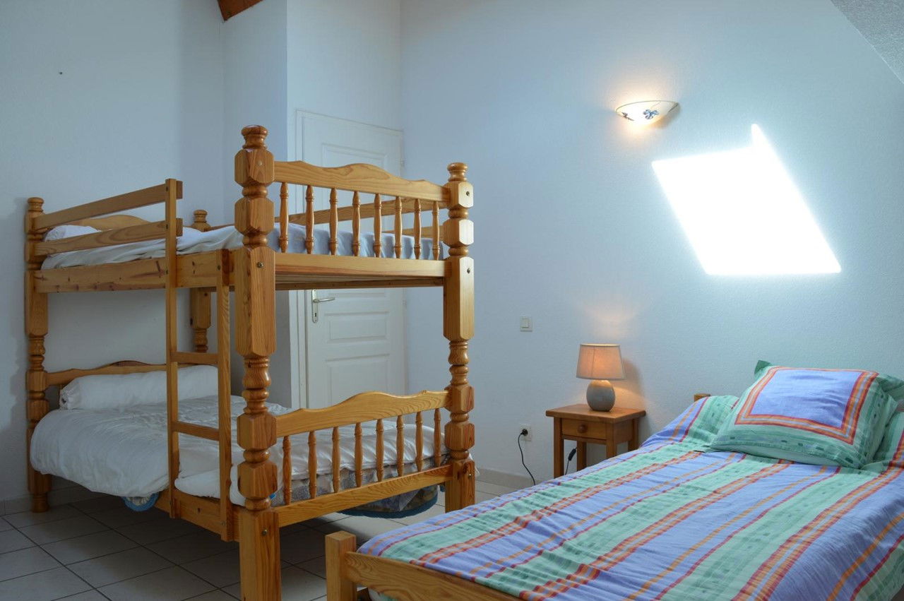 Upstairs, a bedroom with a double bed and a mezzanine with two bunk beds and a single bed, and WC.
