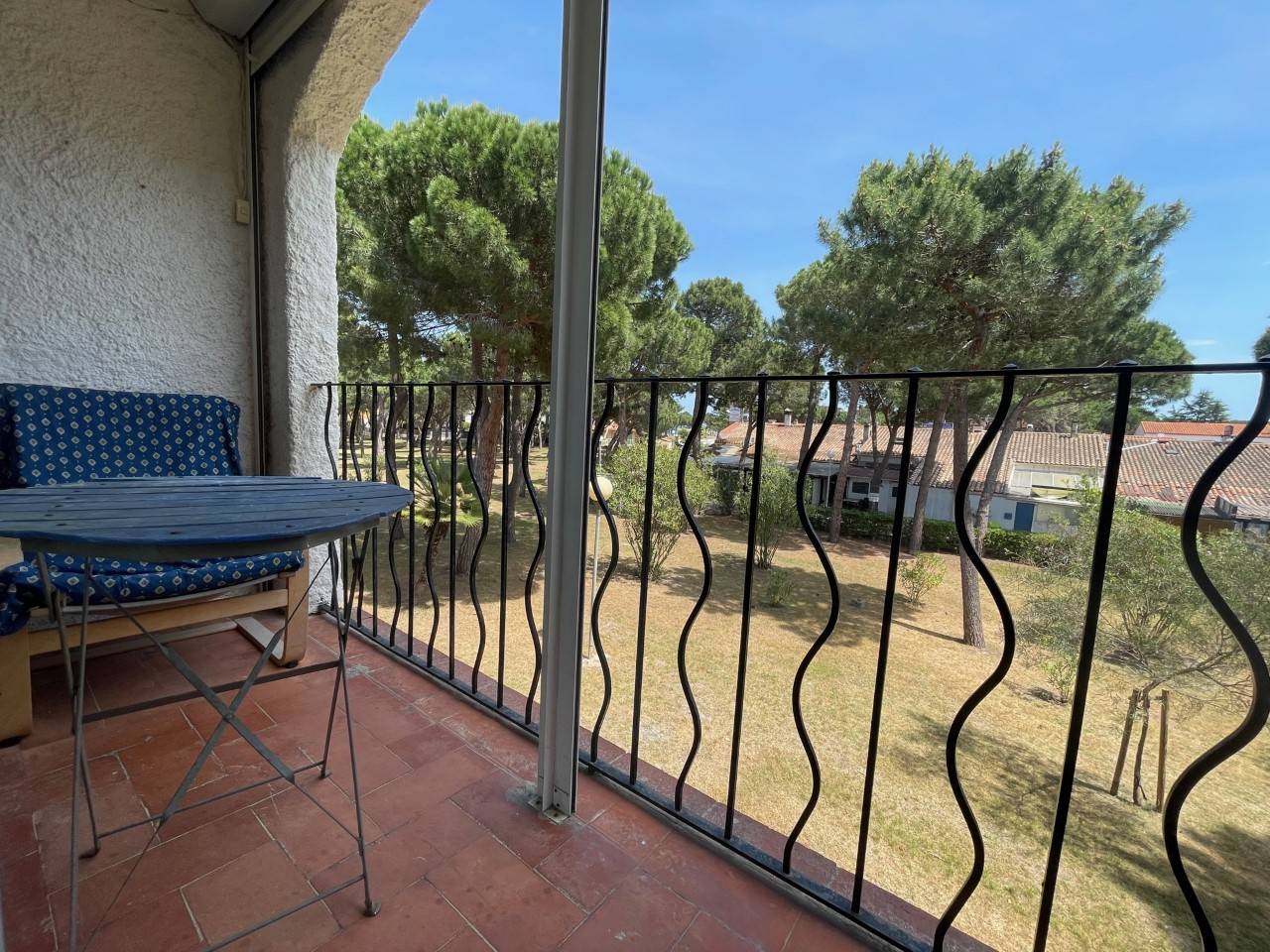 This holiday apartment, ideal for your family holidays in Languedoc Roussillon, on the 1st floor, includes a living room with convertible sofa opening onto a balcony, an equipped kitchen area, a cabin with two single bunk beds and a bathroom with WC, a bedroom with a double bed.