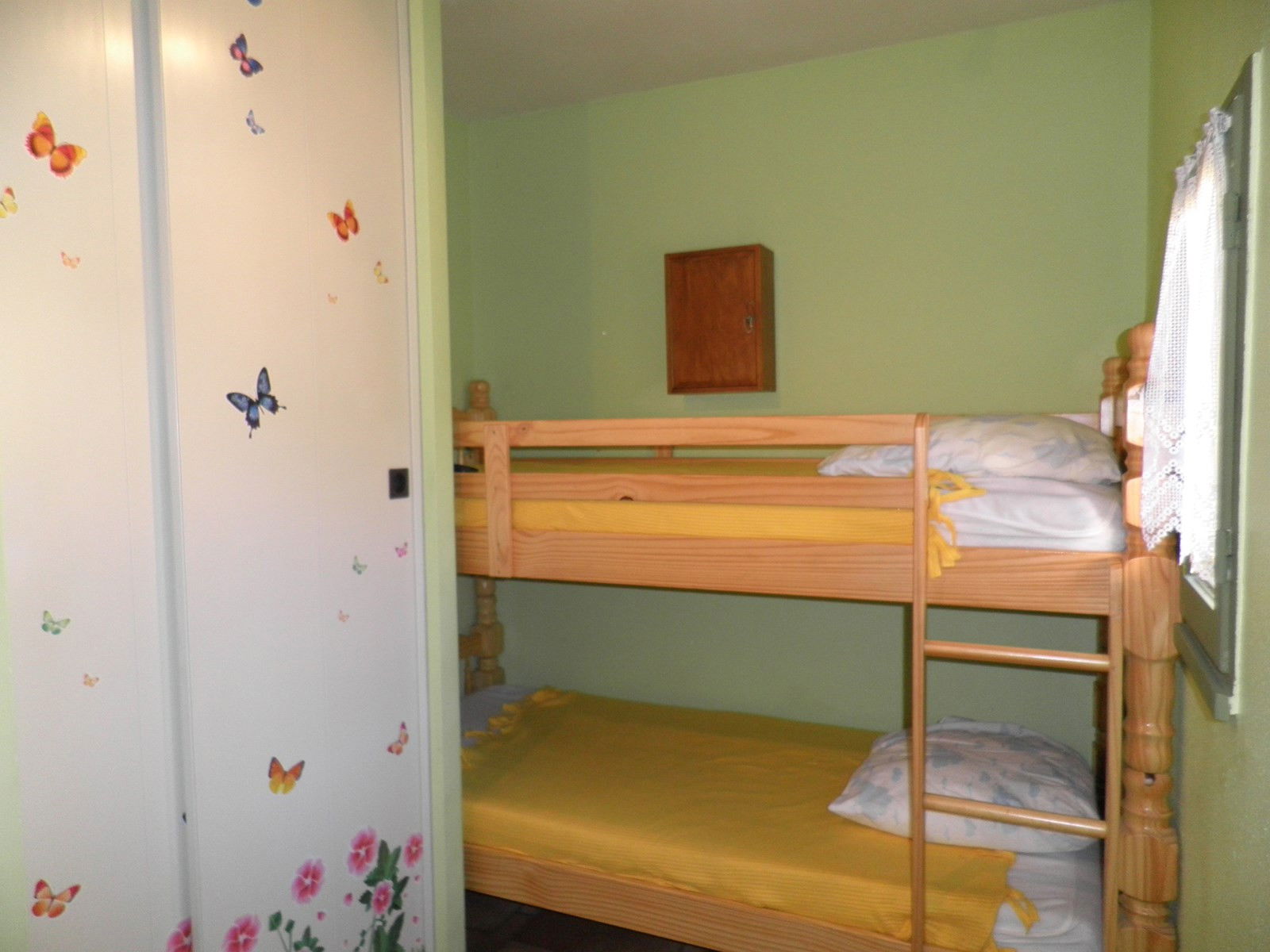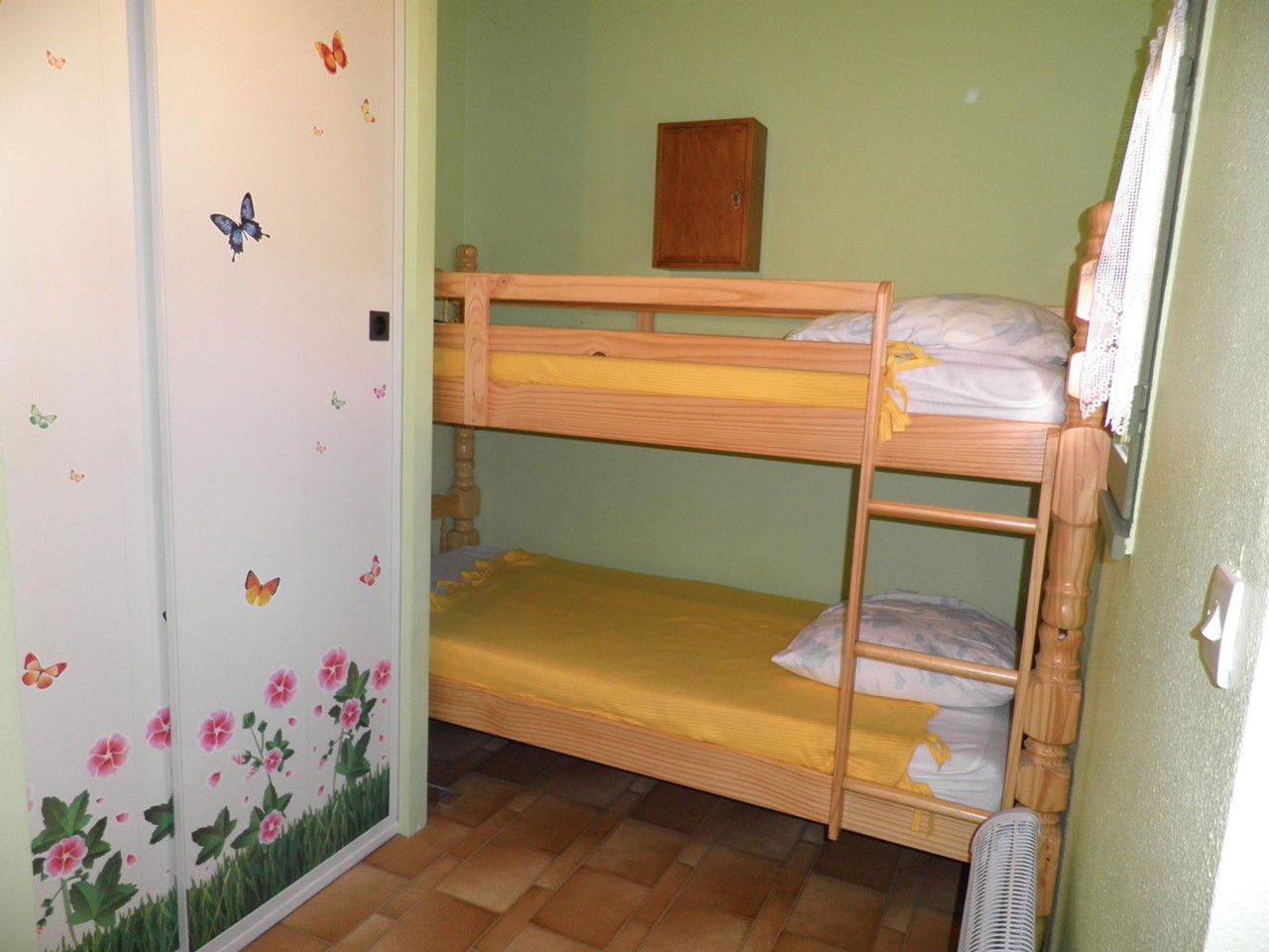 This vacation rental located on the third floor is available in a closed cabin with two bunk beds, bathroom with toilet, living room with a kitchenette, a bedroom furnished with a double bed. Loggia with garden furniture. Clear view.