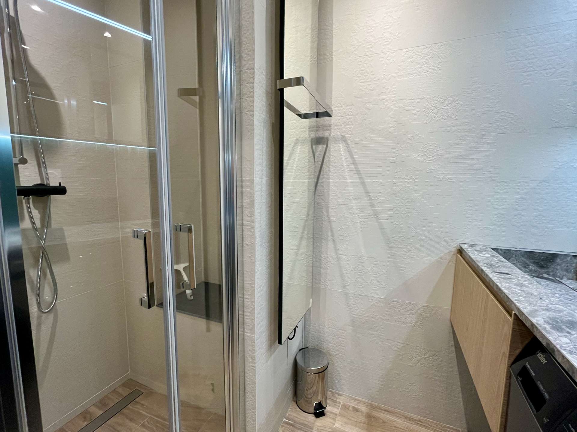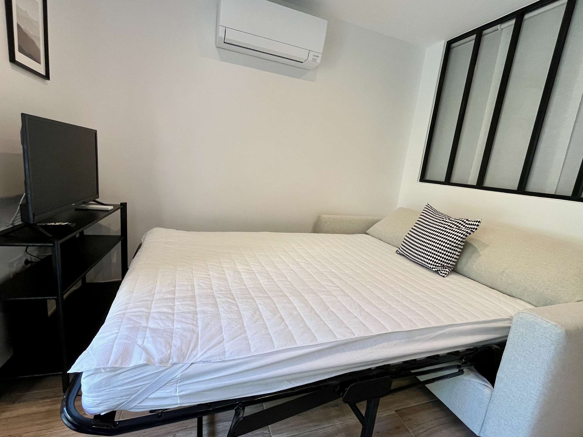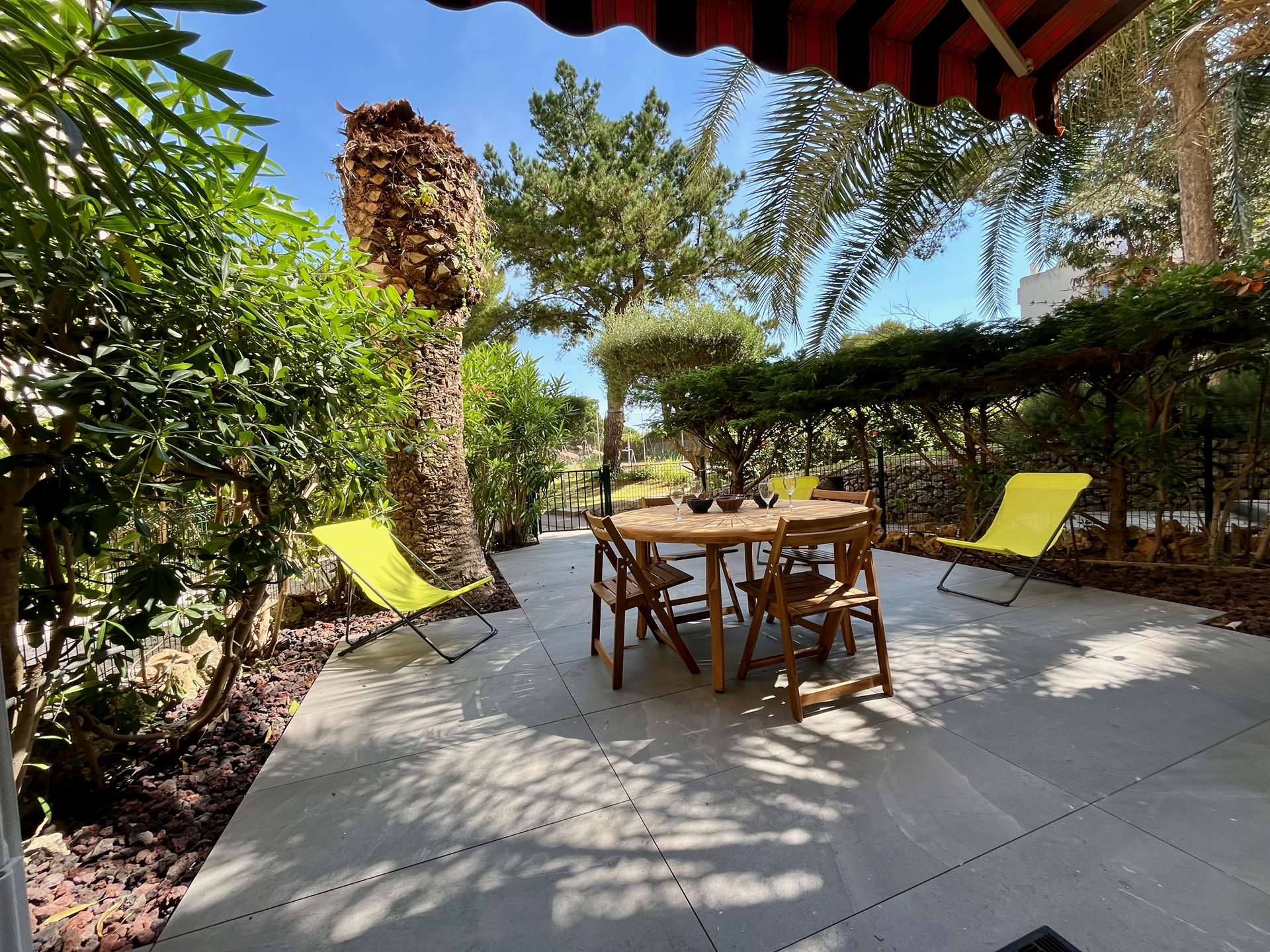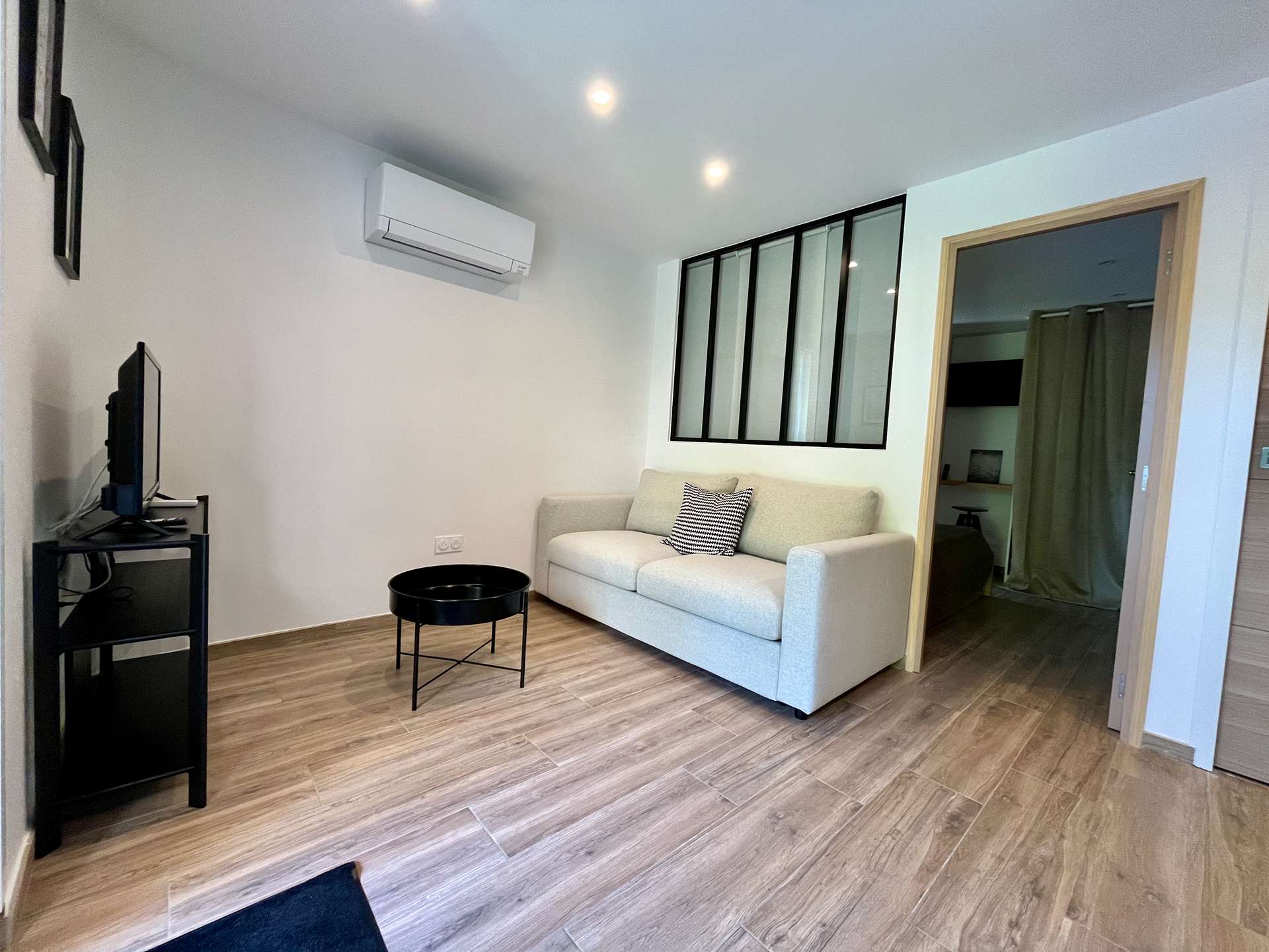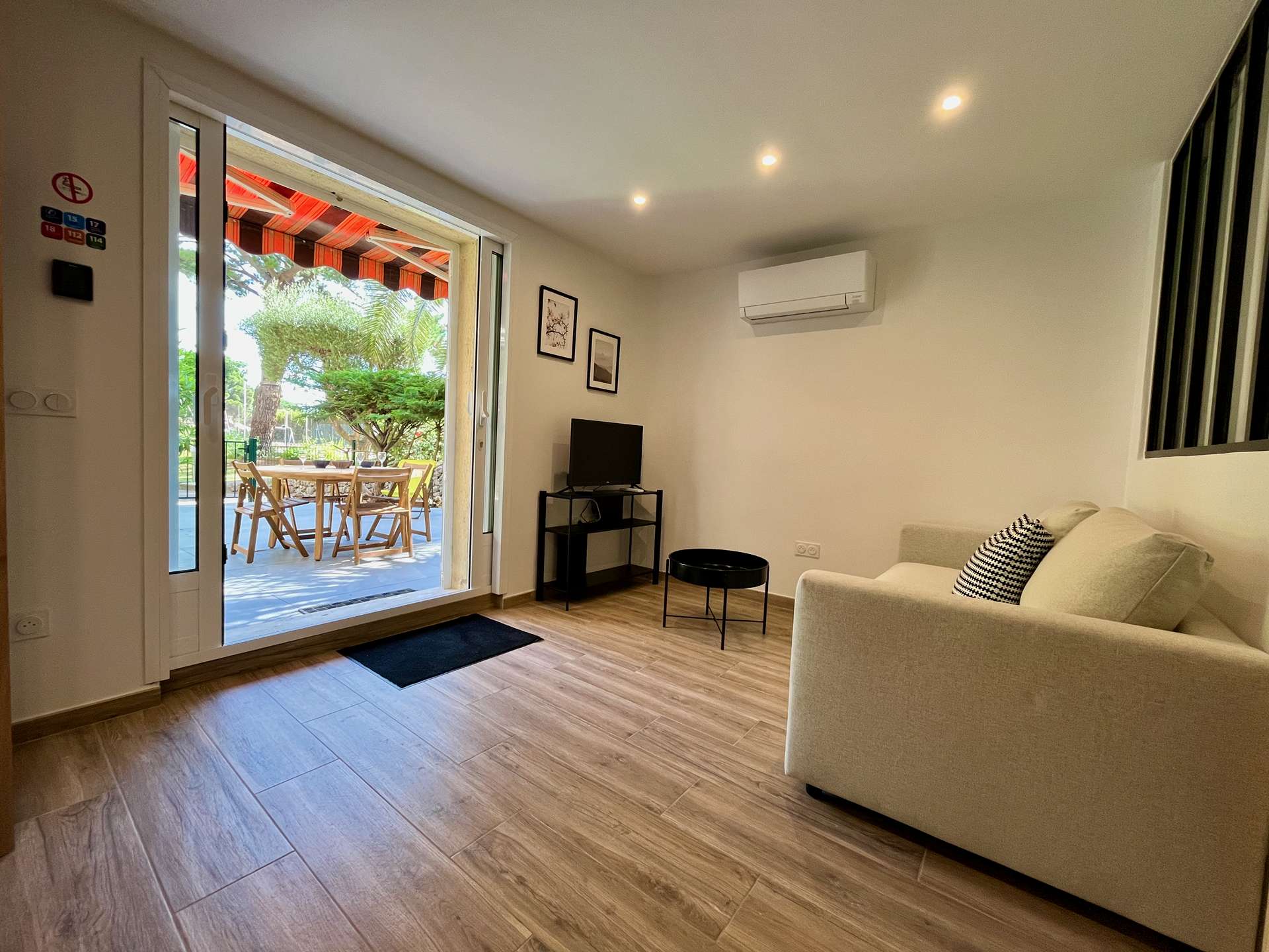 This beautiful air-conditioned apartment, located on the ground floor and overlooking the sea, features a living room with a double sofa bed opening onto a large terrace, a functional kitchen, a bedroom with a double bed, and a bathroom with a walk-in shower and separate toilet. Private parking is available.