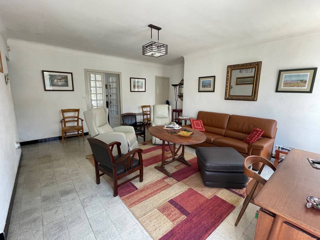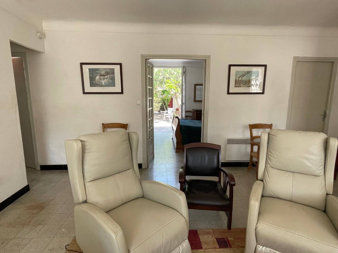 Cette grande villa plain-pied pouvant accueillir 8 personnes se compose d’une cuisine entièrement équipée donnant sur un grand séjour avec canapé et fauteuils ainsi qu'un un coin salle à manger convivial.