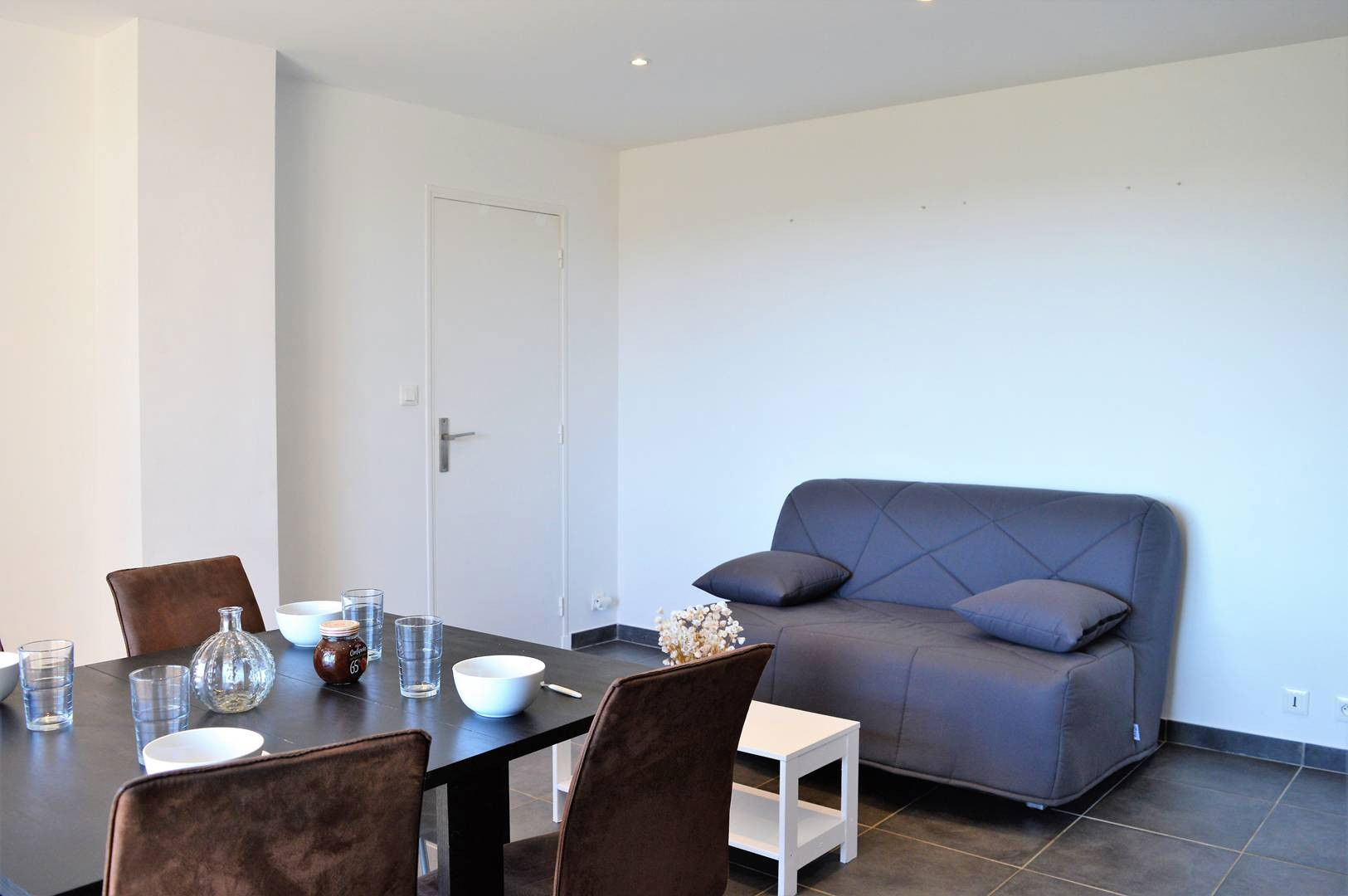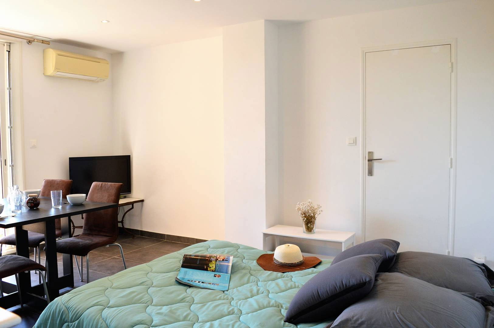This accommodation has a large air-conditioned living room with a kitchen equipped with a BZ sofa in the living room, a shower room and a bedroom with a double bed opening onto the terrace. Well equipped and ideally located you will be close to shops. This neighborhood is a strong point of local life. The car park is a collective car park.
