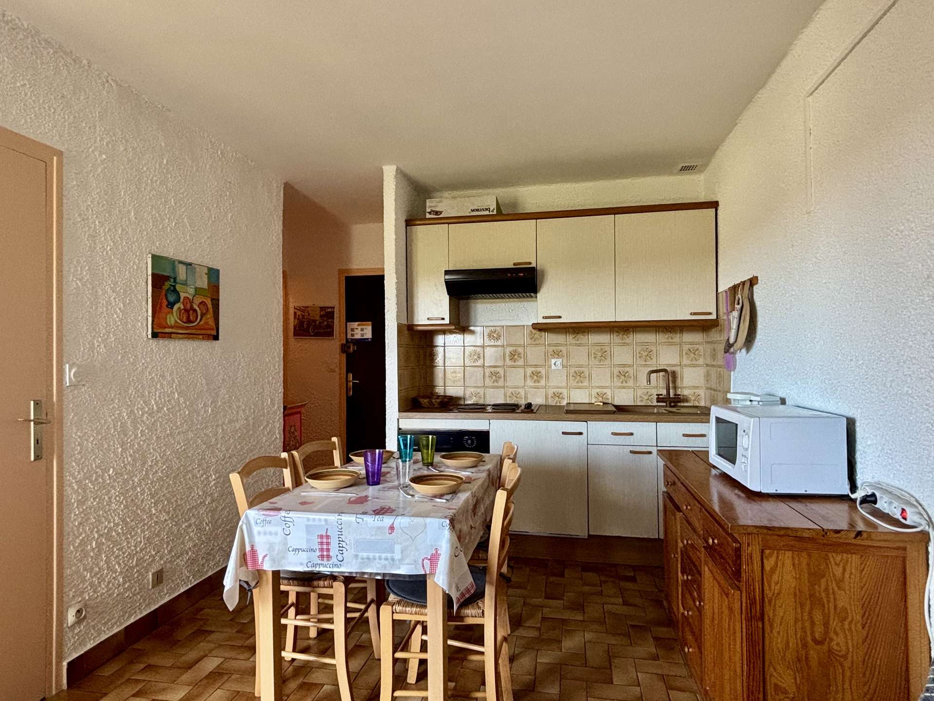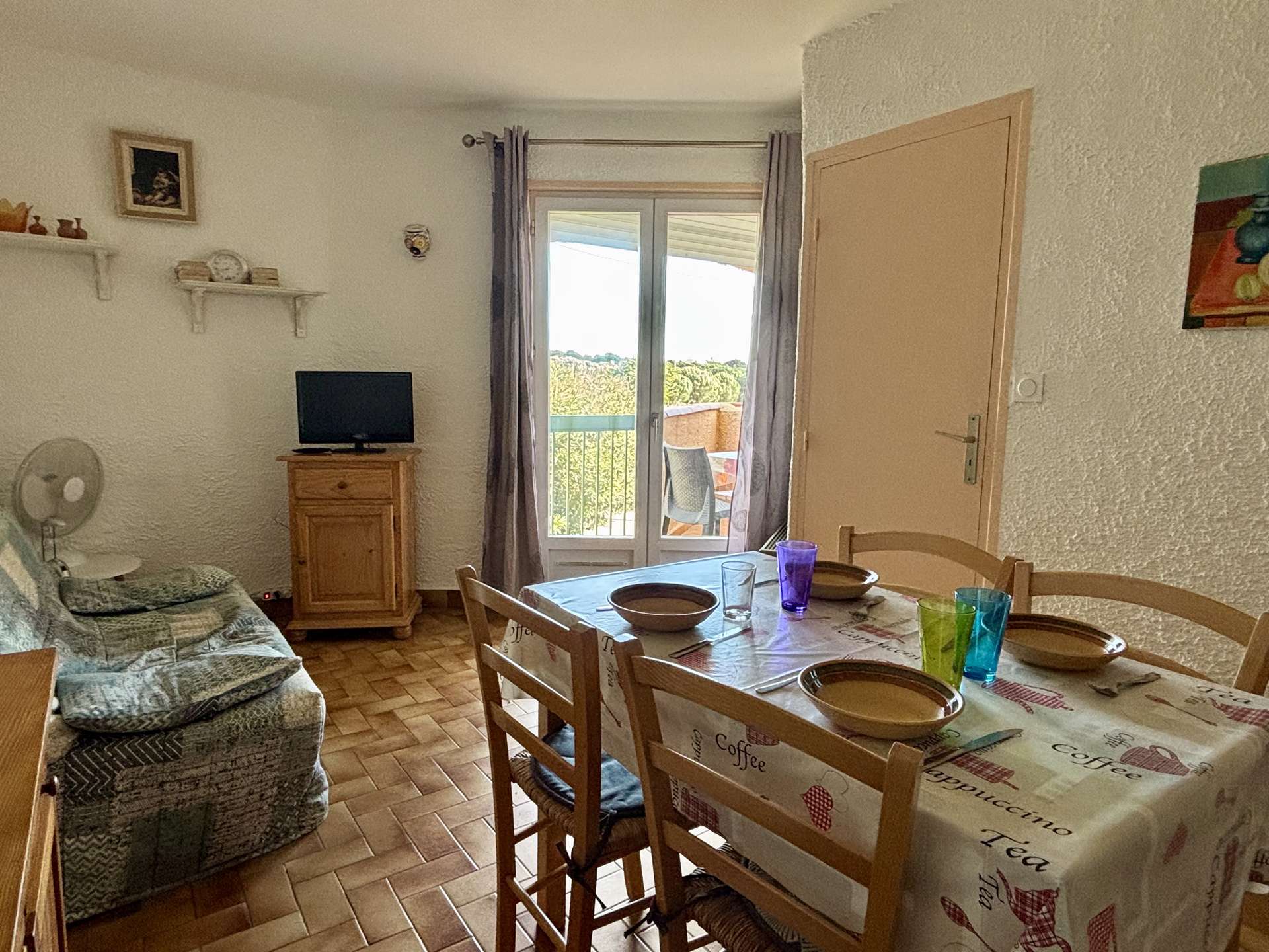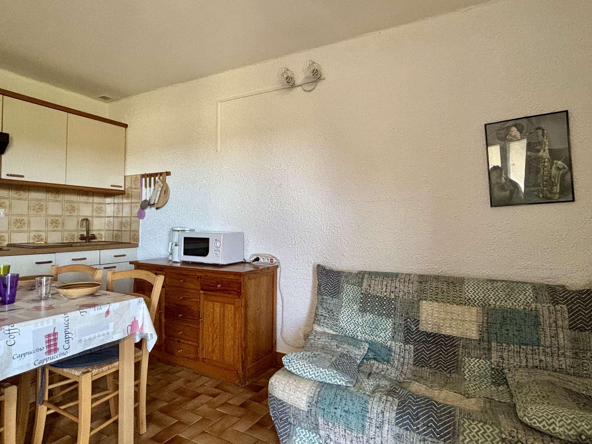 This holiday accommodation by the sea, on the 1st floor, carefully decorated, facing east, consists of a living room with a 2-seater convertible sofa opening onto a terrace, an equipped kitchen area, a bedroom with 1 bed 2 places and a bathroom with separate toilet.