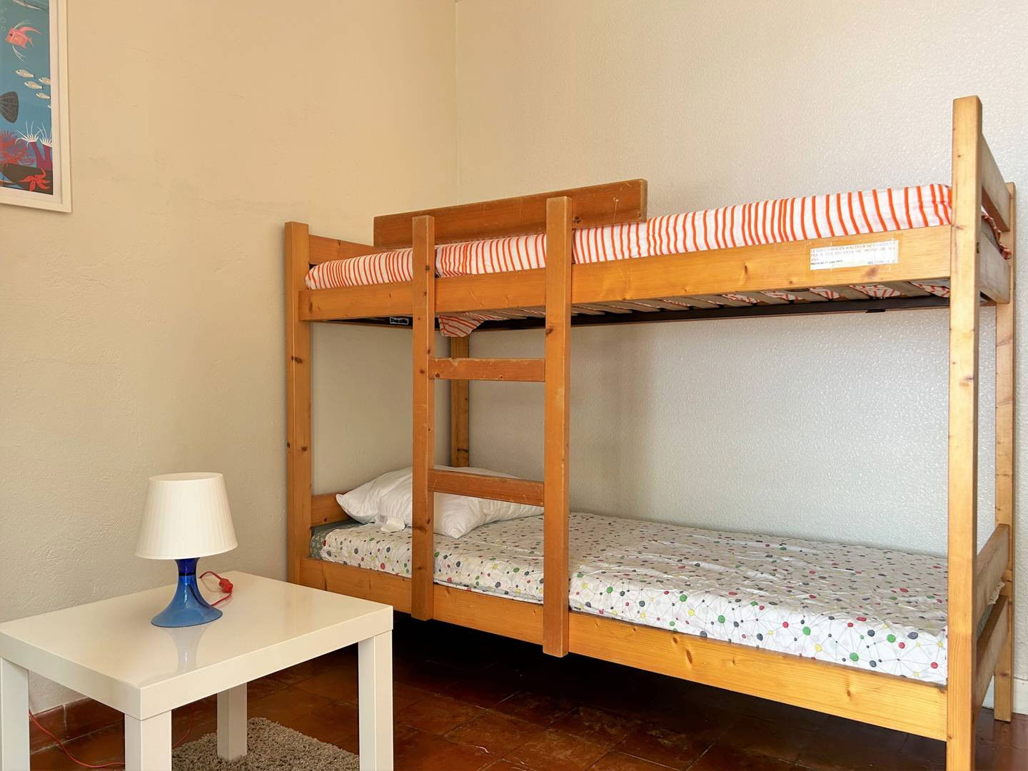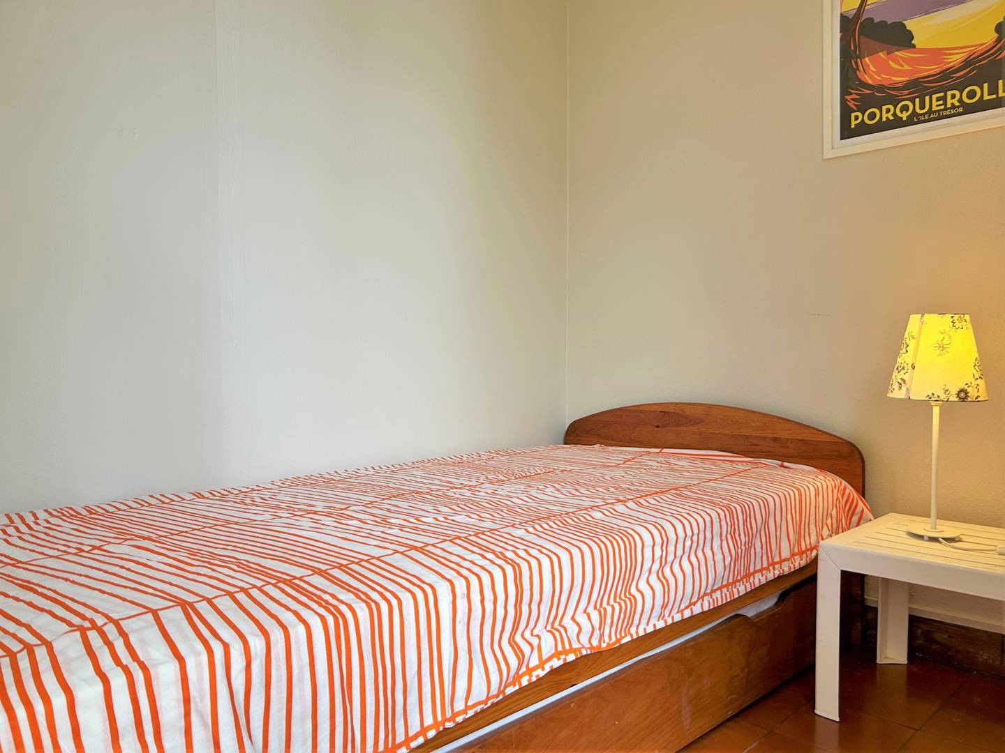 Facing East, this 4-room villa of approximately 75m² consists of a living room with a shaded patio of 14m², a storeroom, a small kitchen, a bedroom with bunk beds, a second bedroom with a 160 bed (2 mattresses in 80), a third bedroom with a trundle bed, a shower room and a separate toilet. A terrace facing the sea and below the swimming pool area.