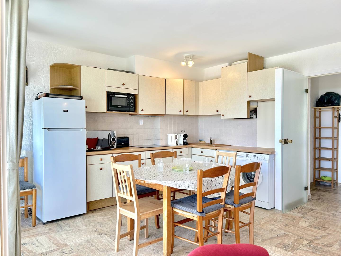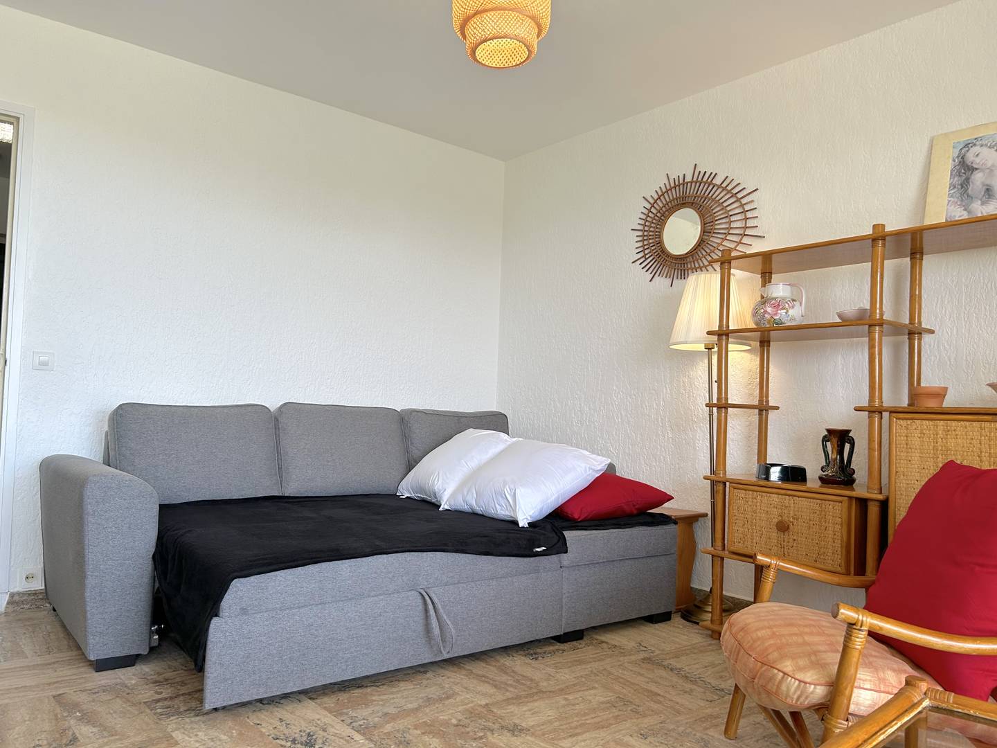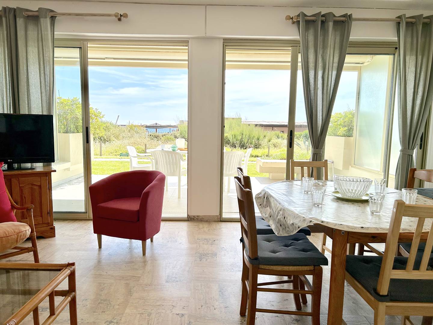 On the ground floor, this vacation rental offers a beautiful terrace with sea view, a bright living room facing east with sofa bed, an American kitchen, a bedroom with 2 single beds, a bedroom with double bed, a bathroom and separate toilet.