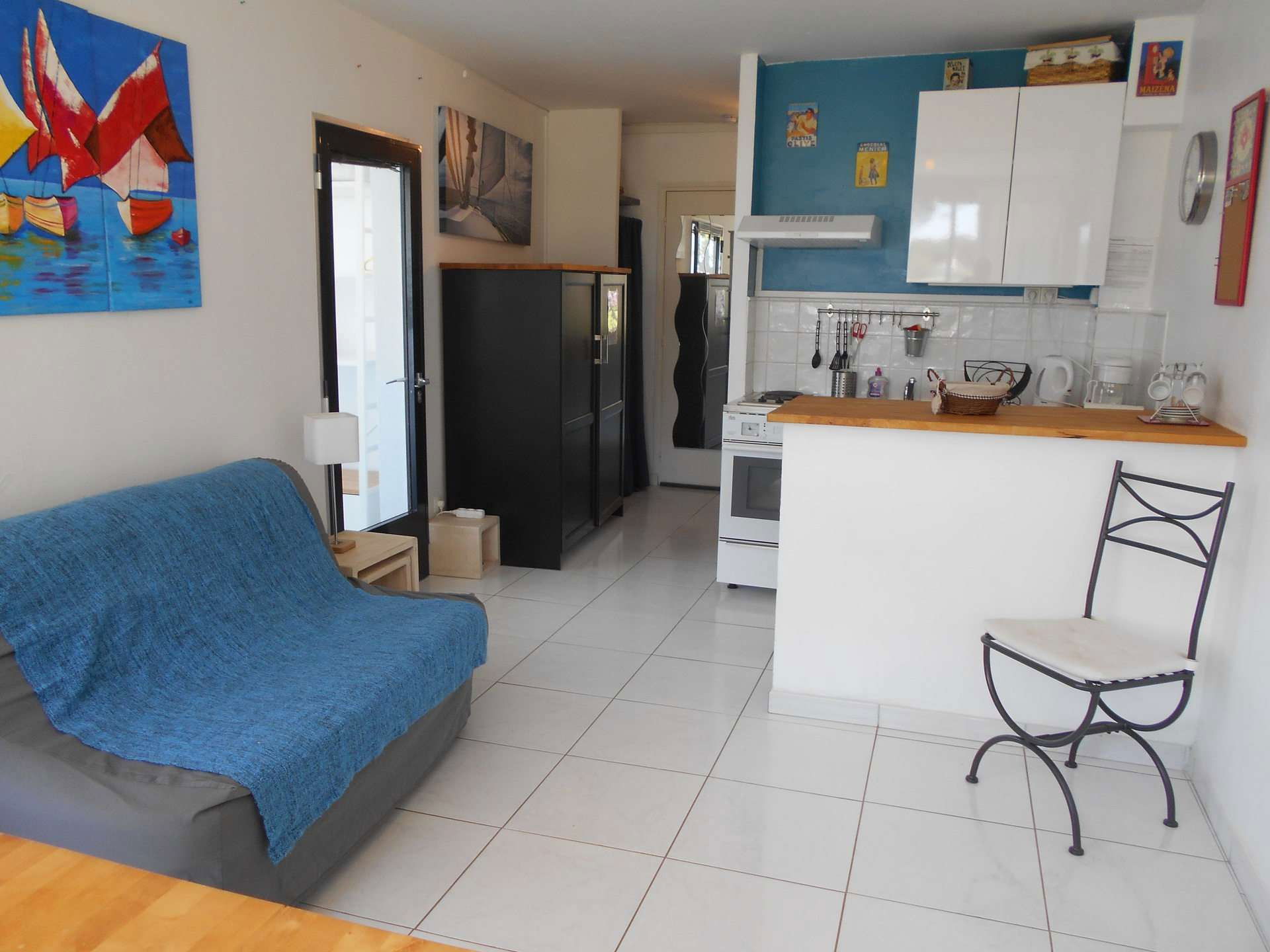 Located on the raised ground floor of a residence with swimming pool, tennis court and direct access to the beach, pretty P2 cabin of 34m², view of the gardens of the residence facing North-East. Accommodation for 4 people, living room with 1 sofa bed BZ in 140 and television, bedroom fitted out in the loggia, completely independent with 2 bunk beds in 90 and large bay window, kitchen equipped with 2 electric hobs, fridge / small freezer, independent oven, microwave and washing machine, bathroom with shower, sink and toilet. This accommodation also has a private parking space.