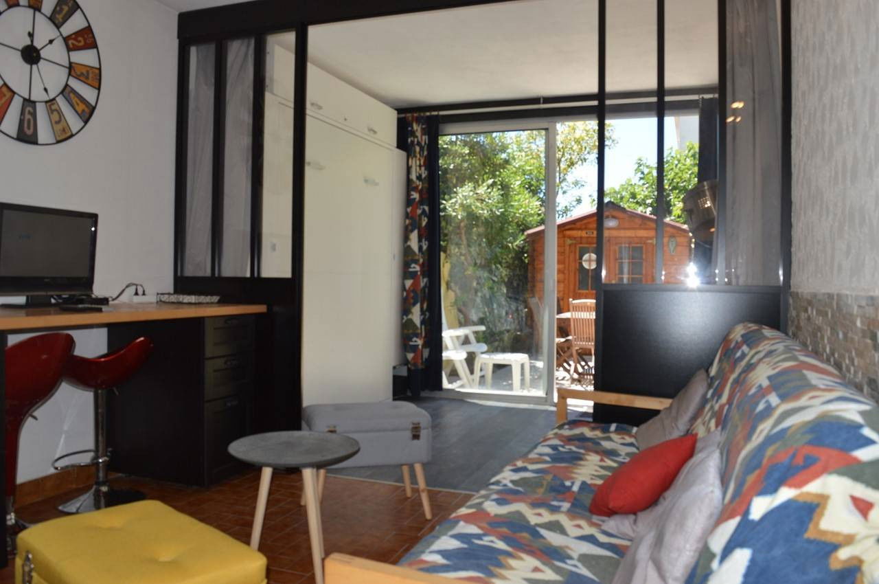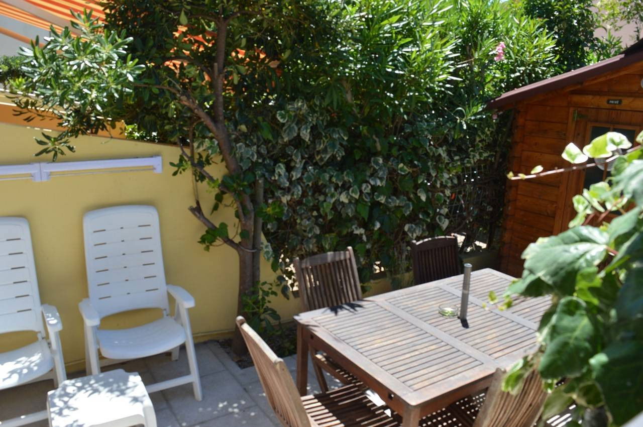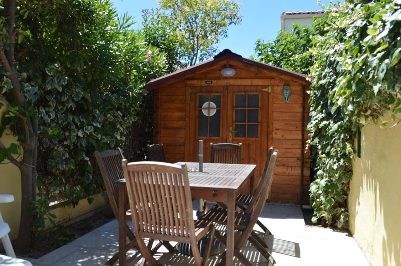 The "Pluses" of this rental by the sea: complete equipment, a courtyard with garden shed and parasol. An air-conditioned living room. This pleasant courtyard has independent access via a gate opening onto the private parking space.
