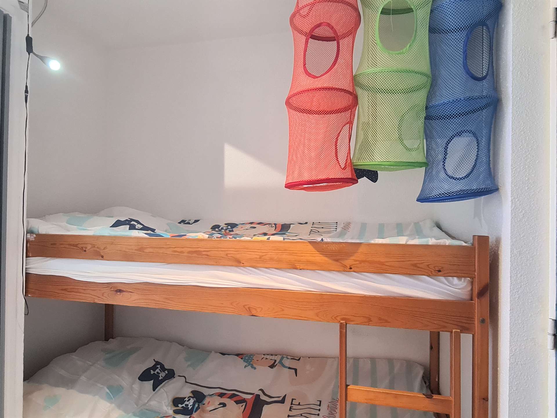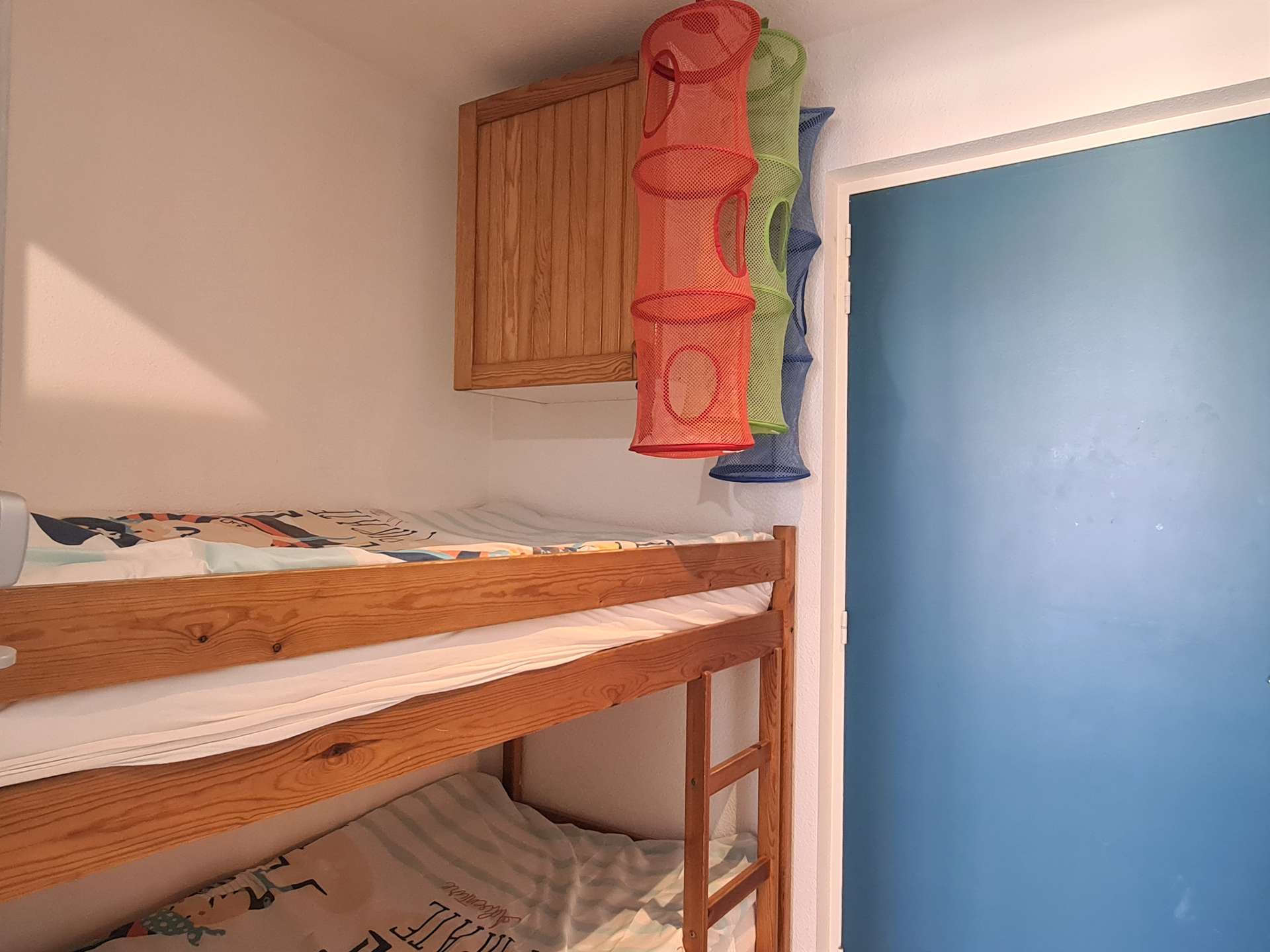 Cet appartement de vacances situé au 1er étage avec ascenseur comprend un séjour avec une télévision, une chambre avec un lit 2 places en 140, un coin cabine avec 2 lits superposés en 90 chacun à l'entrée, une belle cuisine équipée, une salle de douche et un WC séparé.