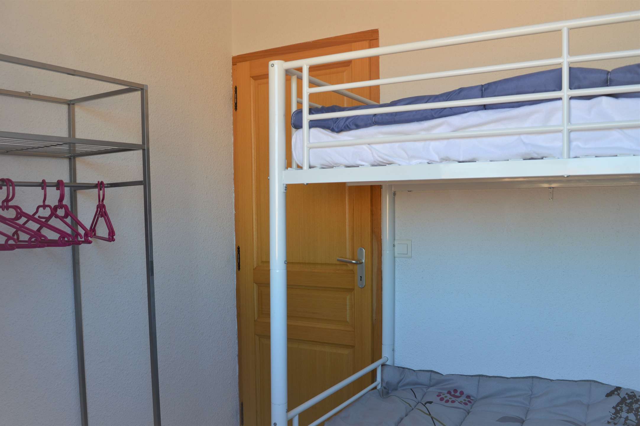 Cette location de vacances au 1er et dernier étage comprend un séjour, un coin cuisine, une chambre avec un lit double, une chambre avec deux lits superposés, une mezzanine avec des lits gigognes,une salle de bain et toilettes séparés.