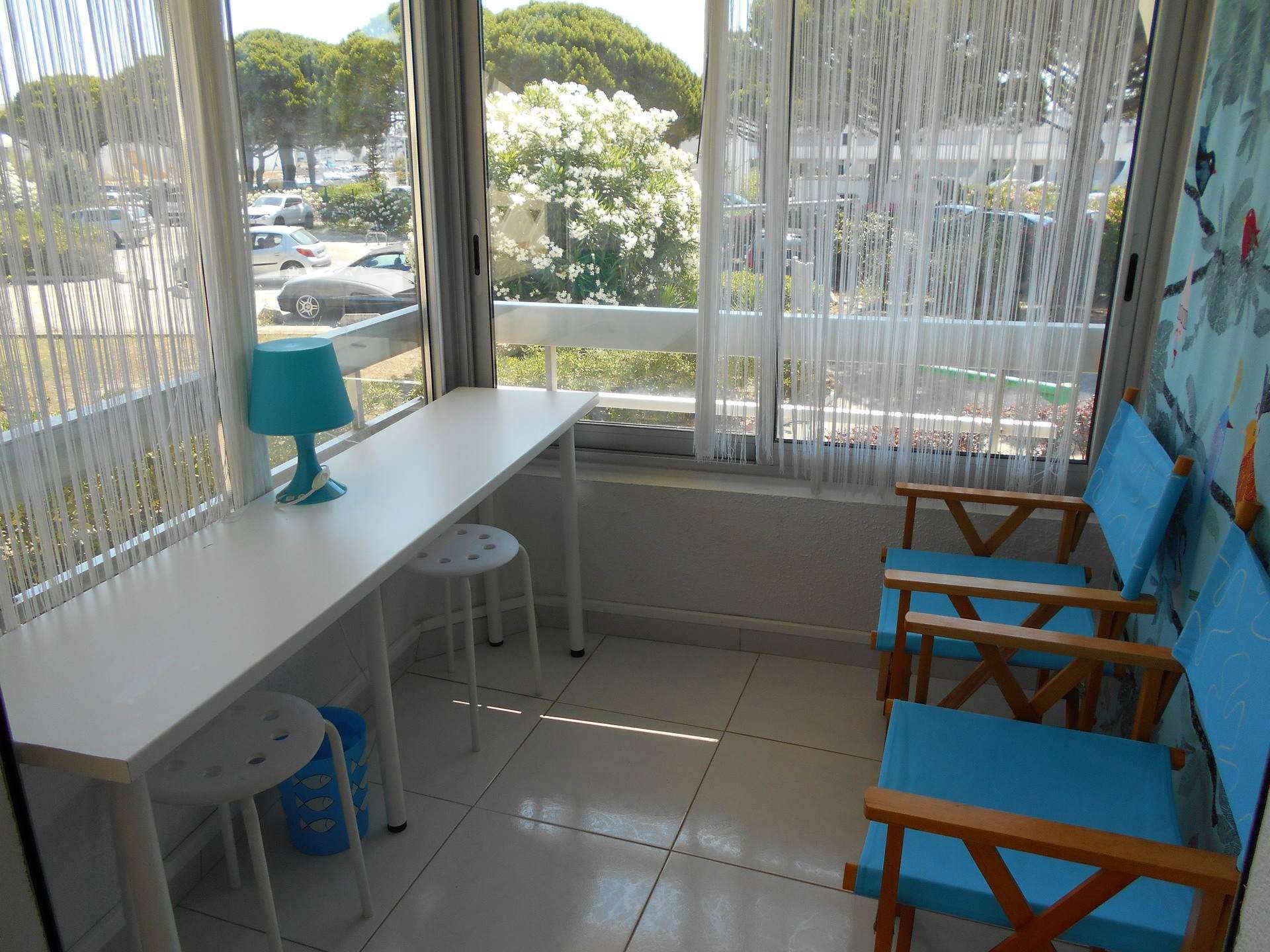 The "Pluses" of this vacation rental in Port Camargue: loggia converted into a real independent bedroom (with bay window & closing by electric blinds). Residence with tennis court, swimming pool, ping-pong table and direct access to the beach.