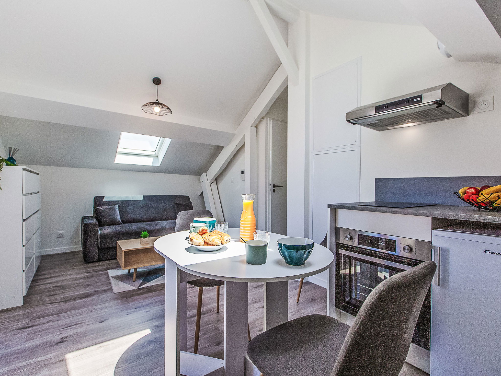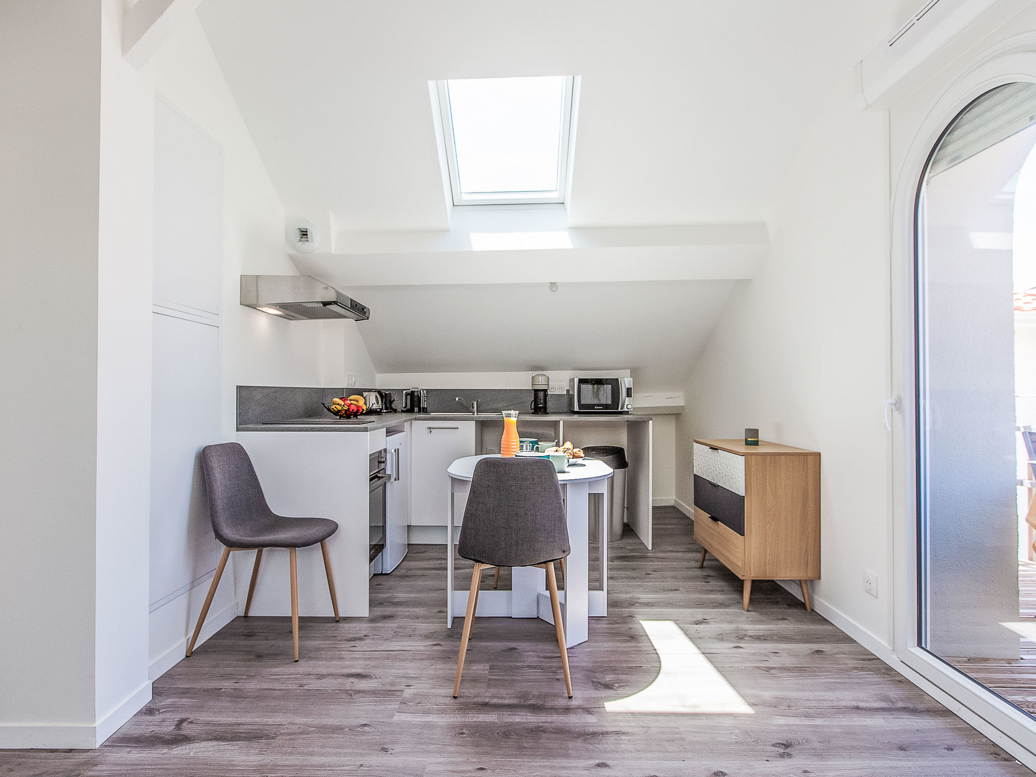 1-room studio 16 m2 on 2nd floor. Object suitable for 2 adults. Living/sleeping room with 1 double sofabed (140 cm, length 190 cm), TV (flat screen). Kitchenette (oven, 2 induction hot plates, toaster, kettle, microwave, electric coffee machine). Shower/WC. Electric heating. Small balcony 4 m2. Balcony furniture. Distant view of the ocean. Facilities: hair dryer. Internet (WiFi, extra). Please note: non-smokers only. Offer by a private individual according to Art. 155, IV of CGI. 400650014605P