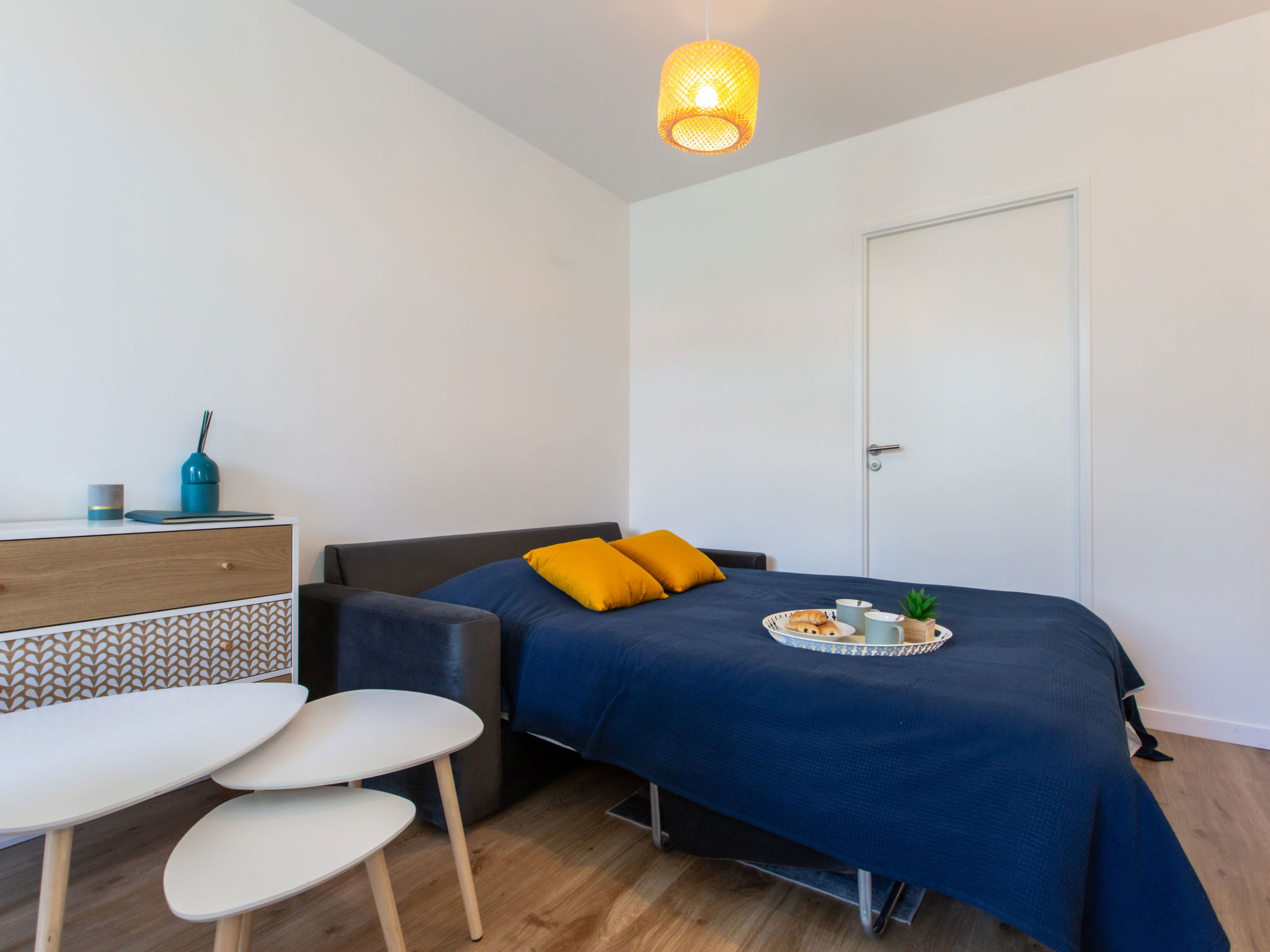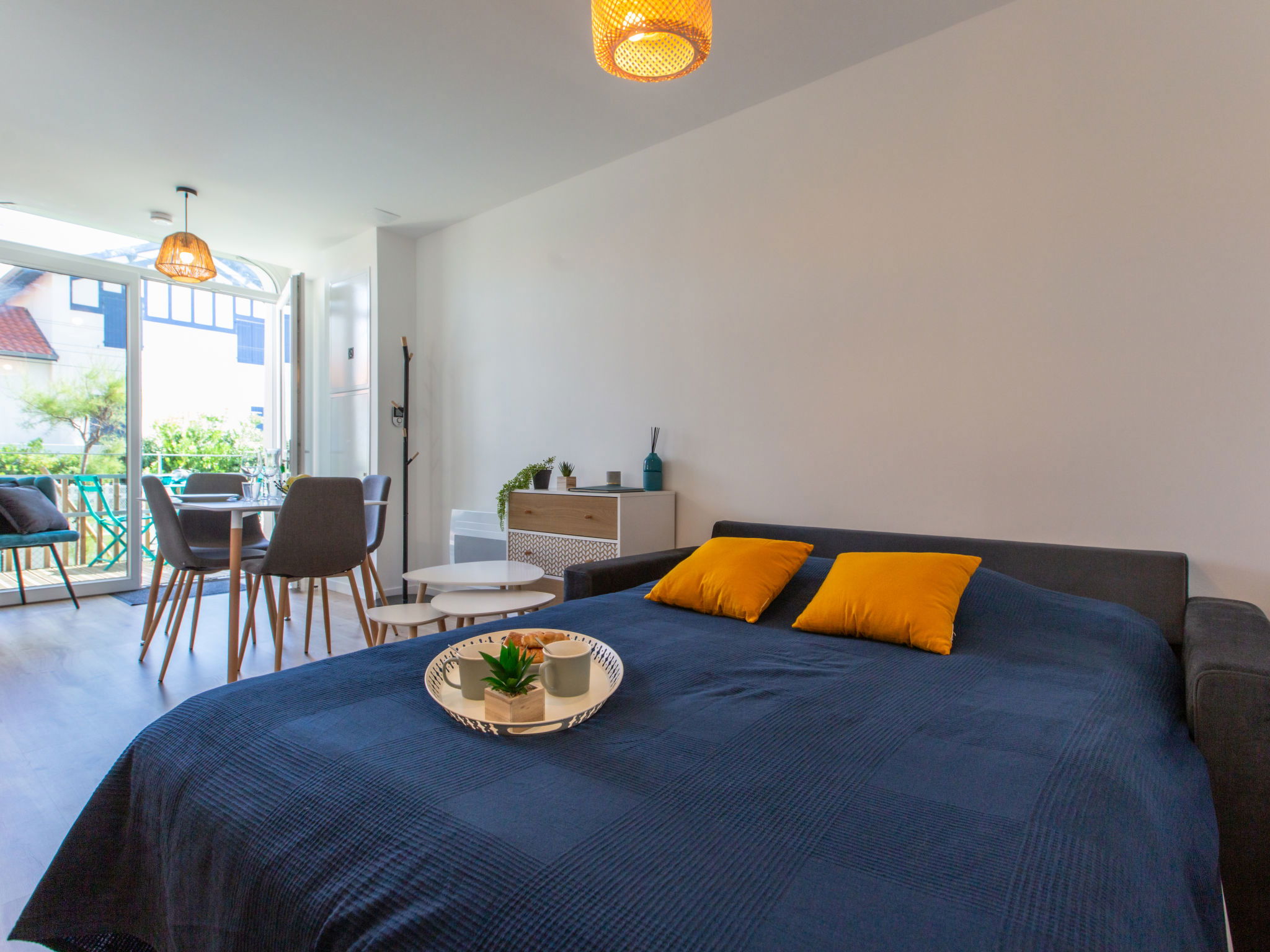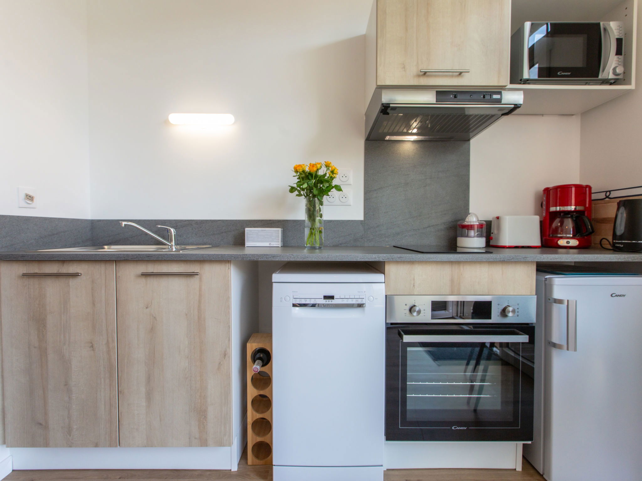 1-room studio 23 m2, on the upper ground floor. Modern and cosy furnishings: living/dining room with 1 double sofabed (140 cm, length 190 cm), TV (flat screen). Exit to the terrace, to the patio. Kitchenette (oven, dishwasher, 2 induction hot plates, toaster, kettle, microwave, electric coffee machine). Shower/WC. Electric heating. Small terrace 4 m2, small patio 6 m2. Terrace furniture. Facilities: hair dryer. Internet (WiFi, extra). Please note: non-smokers only. Offer by a private individual according to Art. 155, IV of CGI. 40065001451QW