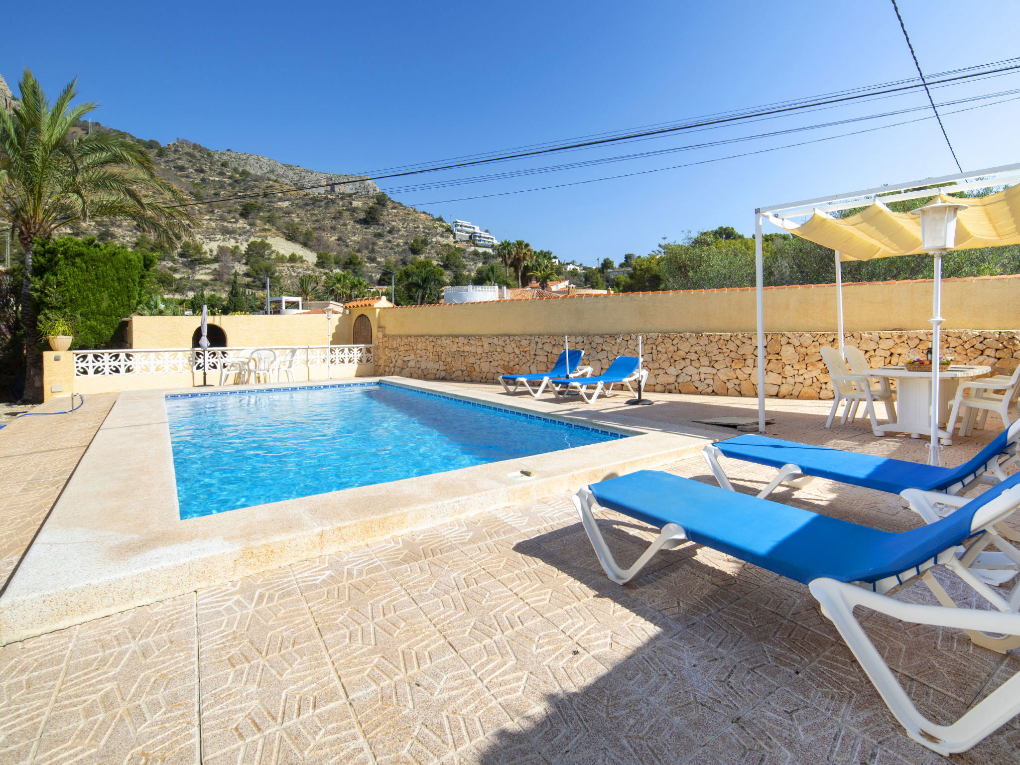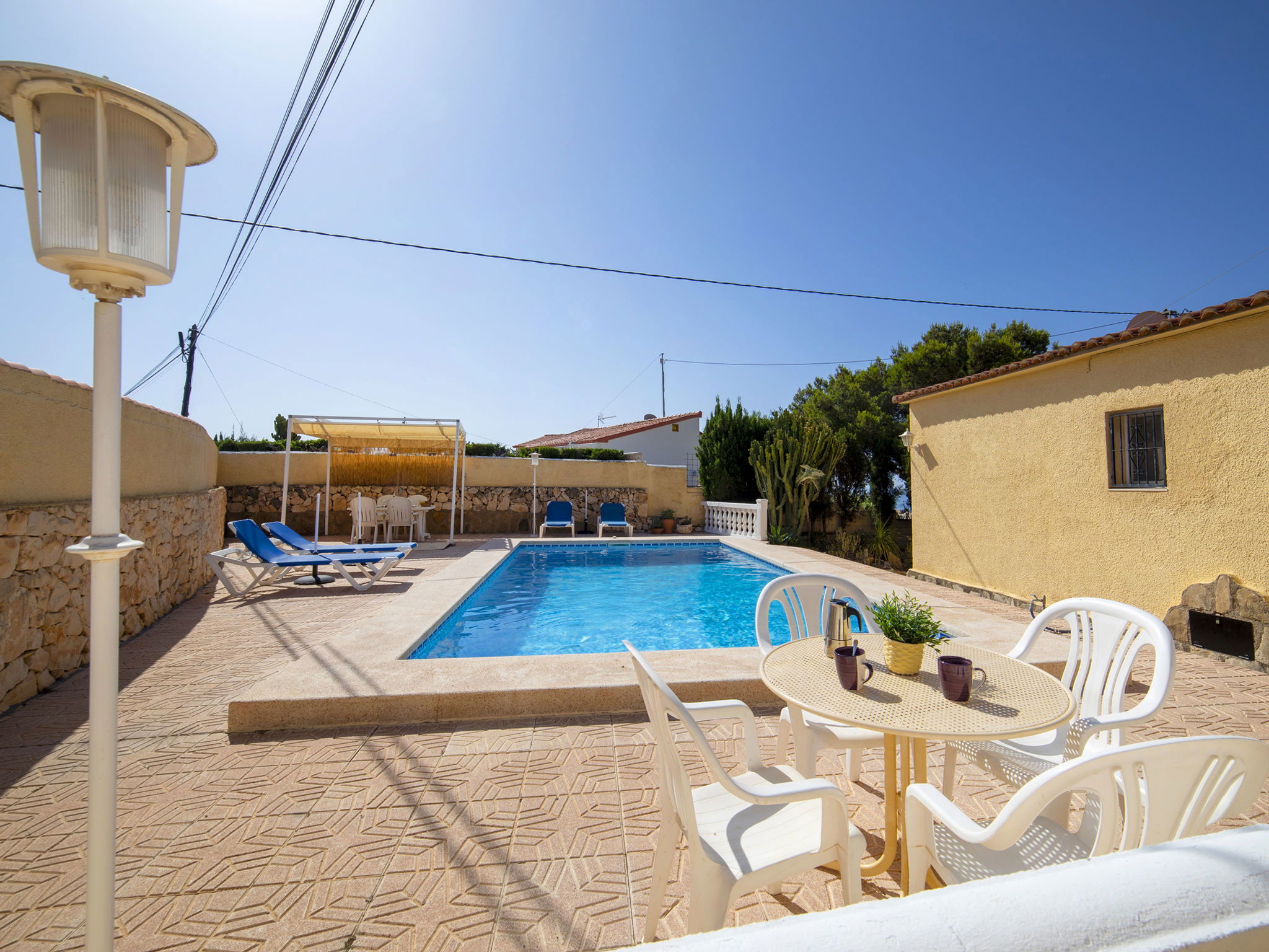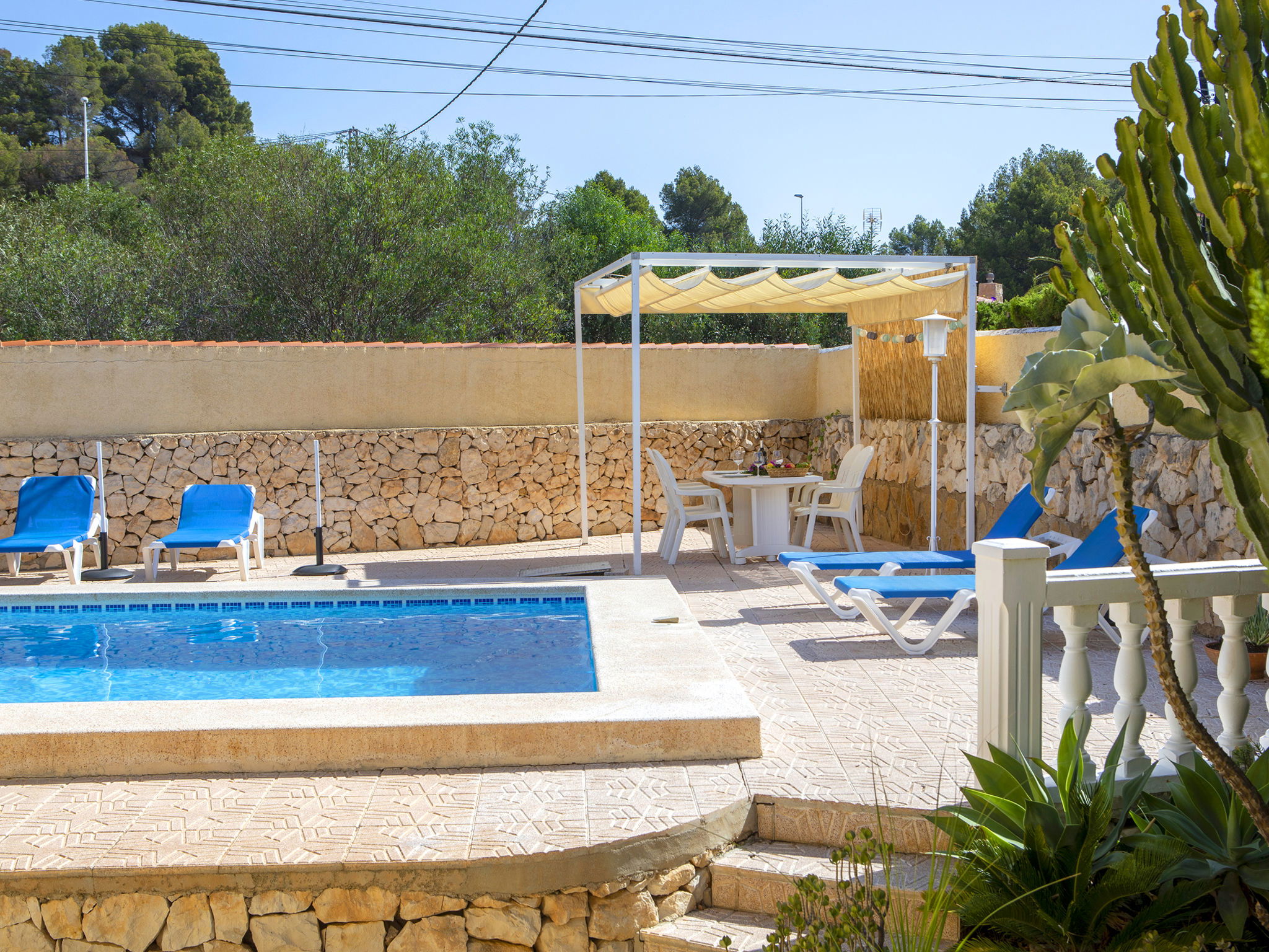 La Canuta: Cosy single-family house "Villa Servinola". 1 km from the centre of Calpe, 2 km from the sea. Private: property 600 m2, swimming pool (8 x 4 m, seasonal availability: 01.Jan. - 31.Dec.) with internal staircase. Terrace, garden furniture. In the house: central heating system. Supermarket 1 km, shopping centre 1 km, restaurant 1 km, bar 1 km, bus stop 600 m, sandy beach 2 km. Nearby attractions: Aqualandia, Mundomar, Terra Mítica, Terra Natura, y Benidorm Palace (Benidorm).
