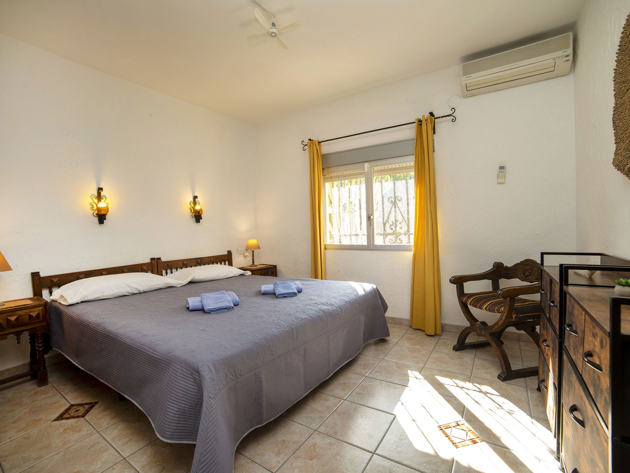 "Villa Servinola", 5-room house 100 m2 on 2 levels. Living room 21 m2 with satellite TV, digital TV and fan. Dining room 20 m2. 1 double bedroom with 2 beds (90 cm, length 190 cm), air conditioning. 1 double bedroom with 1 french bed (150 cm, length 190 cm), air conditioning. Kitchen (4 hot plates, oven, dishwasher, toaster, kettle, freezer, electric coffee machine). Shower/WC. Heating. Deck chairs. Side view of the sea. Facilities: washing machine, iron, mosquito net, children's high chair, baby cot for up to 2 year olds, hair dryer. Internet (WiFi, free). Garage on the property. Maximum 1 pet/ dog allowed. AT-422225-A // Reg. Nr.: ESFCTU00000302900027909100000000000000000AT-422225-A3