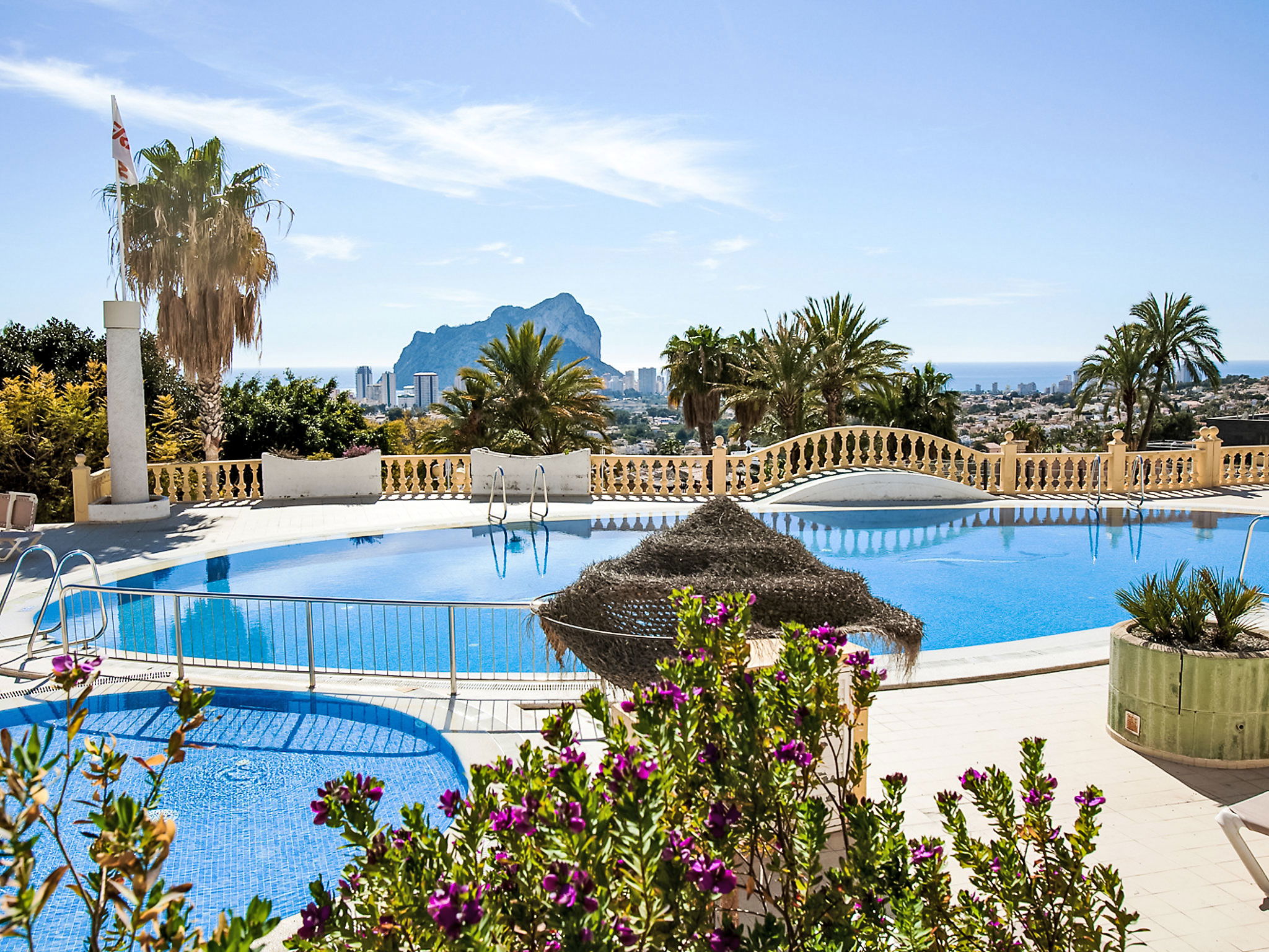 Imperial Park: Modern terraced house "Imperial Park". 3.3 km from the centre of Calpe, in a busy, sunny, elevated position, 2.5 km from the sea, 2.5 km from the beach. For shared use: large, well-kept terraced garden (fenced), natural garden, 3 swimming pools (seasonal availability: 01.Jan. - 31.Dec. pool opening hours: 10:00-20:00) with internal staircase. Unconventional pool shape. Children's pool, outdoor shower, patio, pergola, garden furniture. In the house: reception, lift. Shop 2 km, supermarket 2 km, restaurant 50 m, bar 200 m, café 50 m, bus stop 1.3 km, sandy beach "Playa De La Fosa" 3 km, diving center 1.5 km. Sports harbour 2.5 km, marina 2.5 km, golf course (18 hole) 10 km, surf school 2.5 km, sailing school 2.5 km, tennis 2.8 km, minigolf 3 km. Nearby attractions: Aqualandia, Mundomar, Terra Mítica, Terra Natura, y Benidorm Palace (Benidorm). Please note: car recommended. Reception open 10:00-15:00 hrs. Suitable for families. Please note: guarded residence. Additional accommodations can be booked. All houses/apartments are individually designed/furnished. Neighbourhood highly sensitive to noise. Quietness and good behaviour expected.
