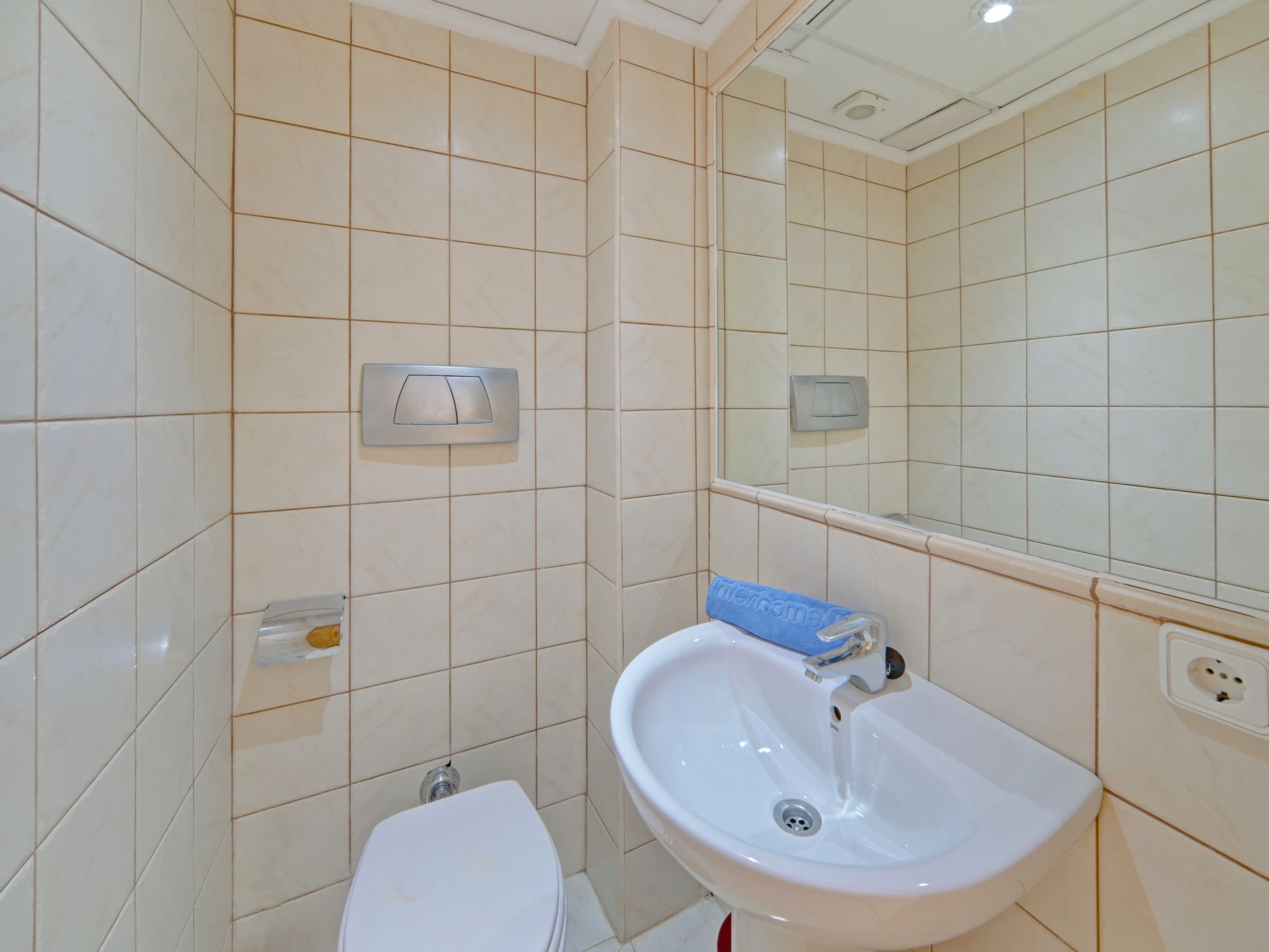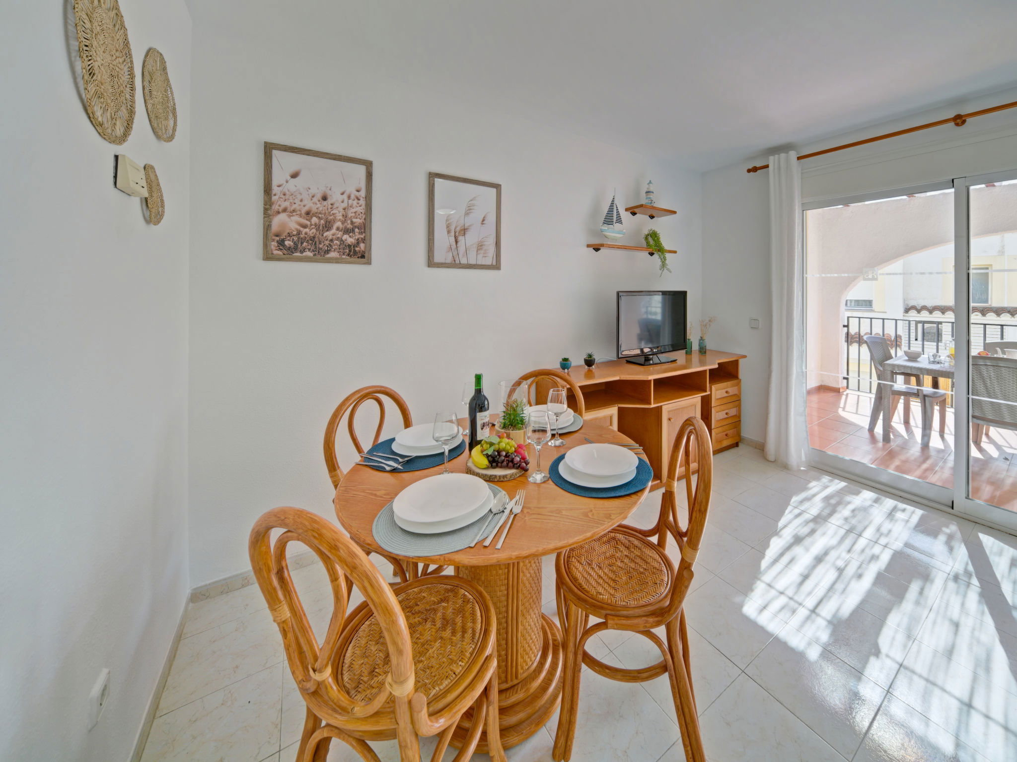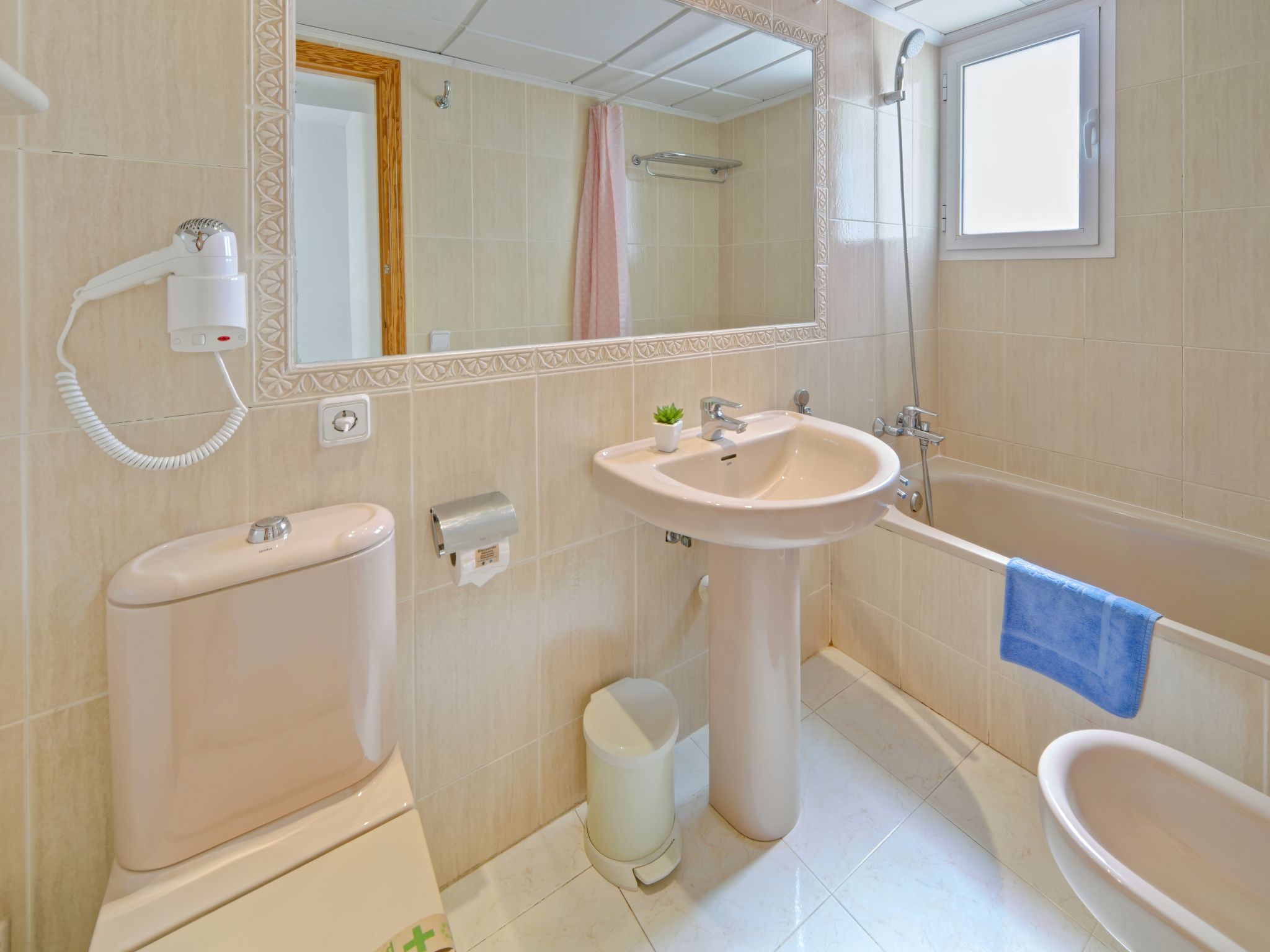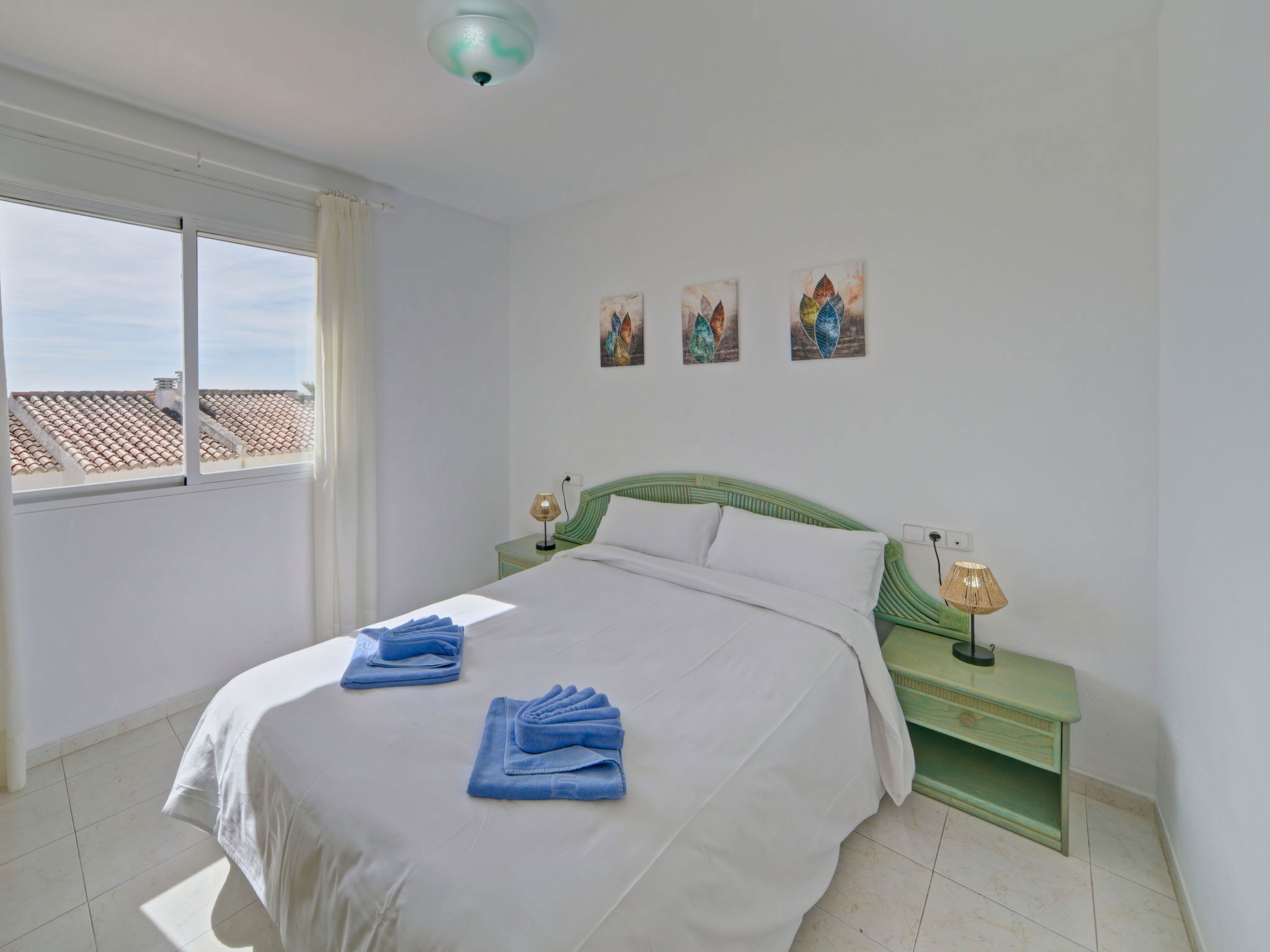 "Imperial Park", 3-room terraced house 72 m2 on 2 levels. Practical and comfortable furnishings: living/dining room with dining table, digital TV, air conditioning and forced-air heating. Exit to the terrace. Kitchen (oven, 4 gas rings, toaster, kettle, microwave, electric coffee machine). Sep. WC. Upper floor: 1 room with 1 french bed (150 cm, length 190 cm), air conditioning and forced-air heating. 1 room with 2 beds (90 cm, length 190 cm), air conditioning and forced-air heating. Bath/bidet/WC. Terrace. Terrace furniture, barbecue (portable). View of the sea. Facilities: washing machine, iron, children's high chair, baby cot, hair dryer. Internet (WiFi, free). Parking space n 73 (1 car) at the house. Suitable for families. Maximum 1 pet/ dog allowed. VT-495390-A // Reg. Nr.: ESFCTU00000302900054105100000000000000000VT-495369-A5